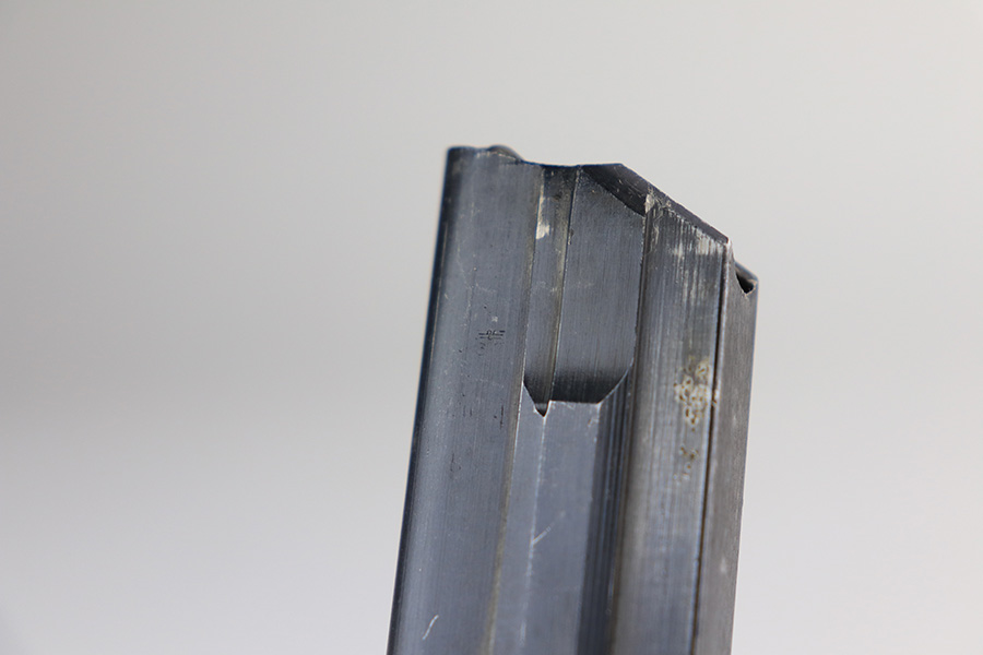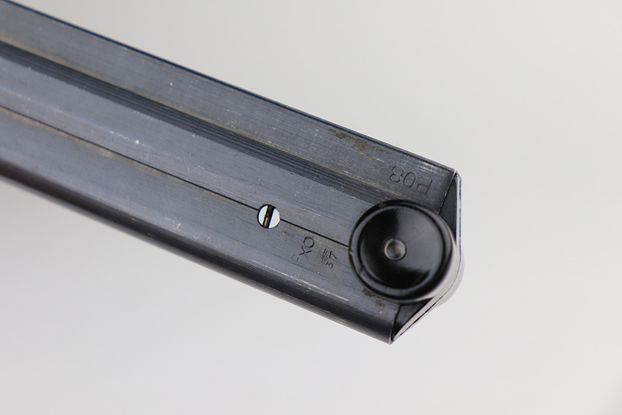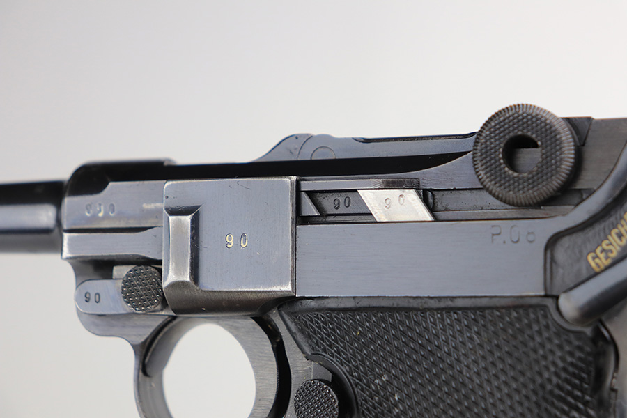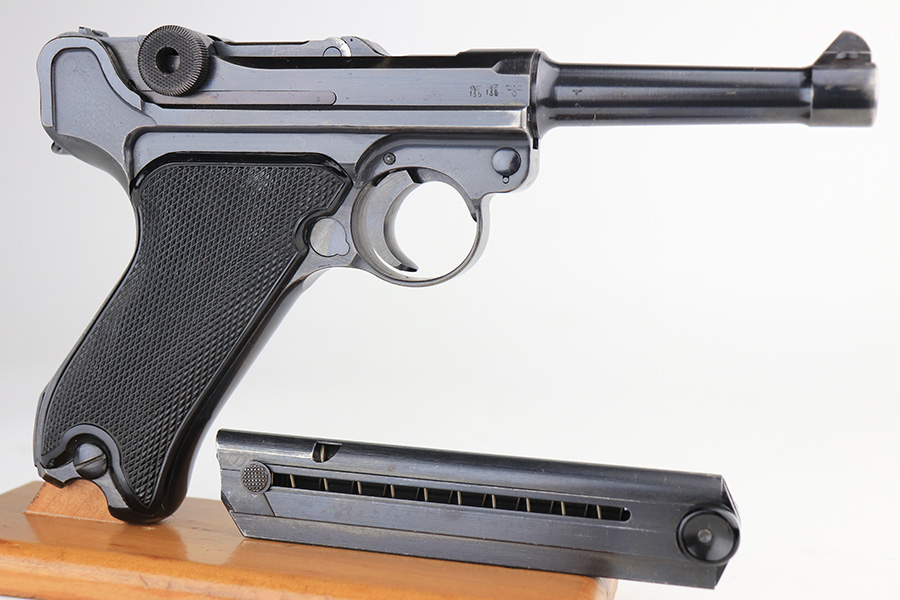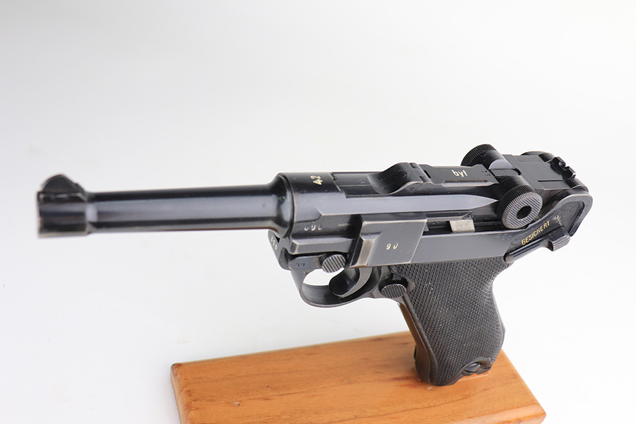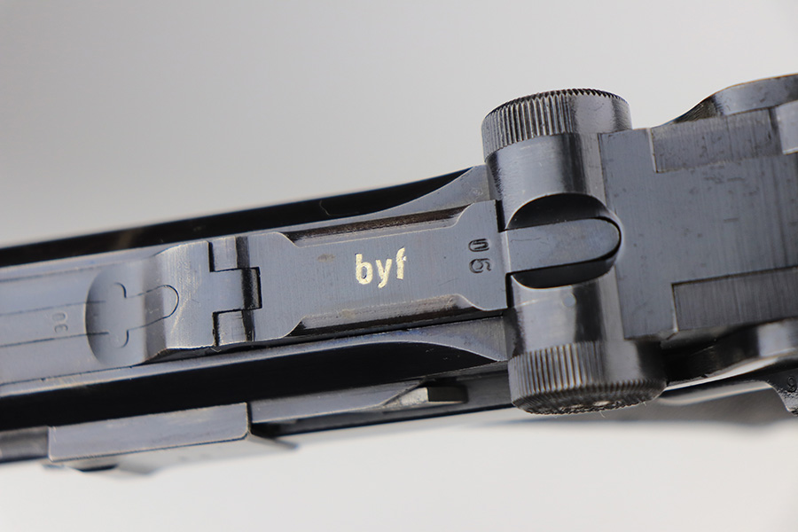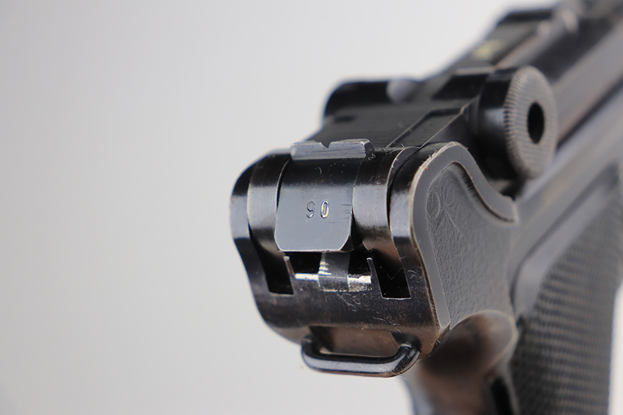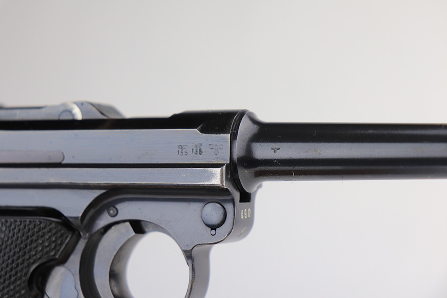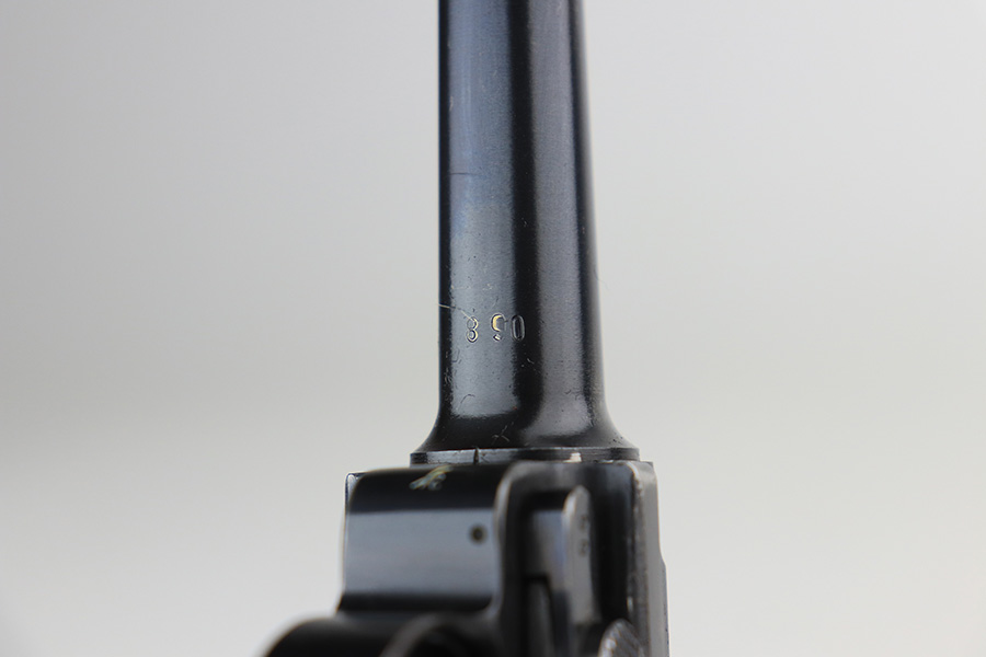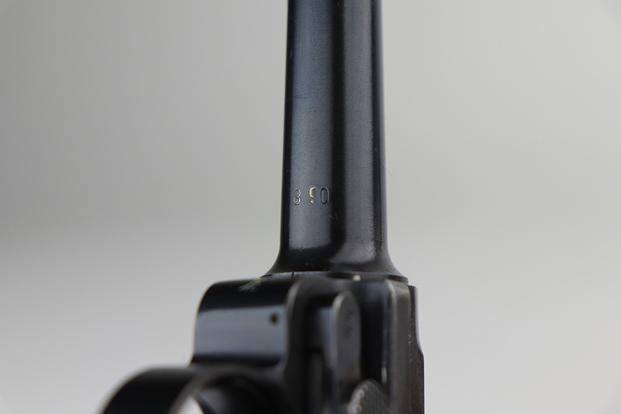 12/22/21 – This is an all matching and original Black Widow Mauser Luger from 1942. The original blue rates at about 92-94% with a very nice profile view. Minor edge wear on muzzle and side plate, and a bit of thinning and patina on the grip straps. Excellent original Black Widow grips with minor handling wear. Correct magazine with no cracks/chips. Bore has good rifling but a little frost and freckling throughout the grooves.