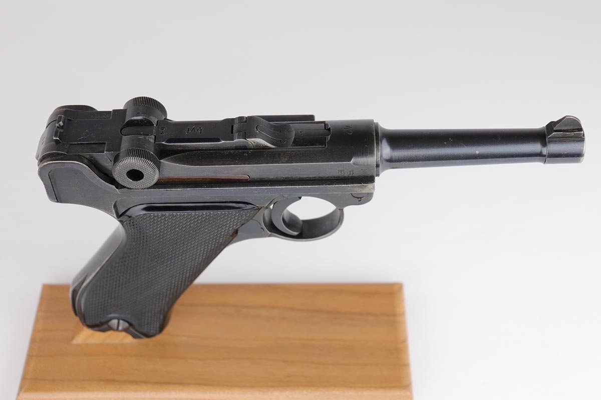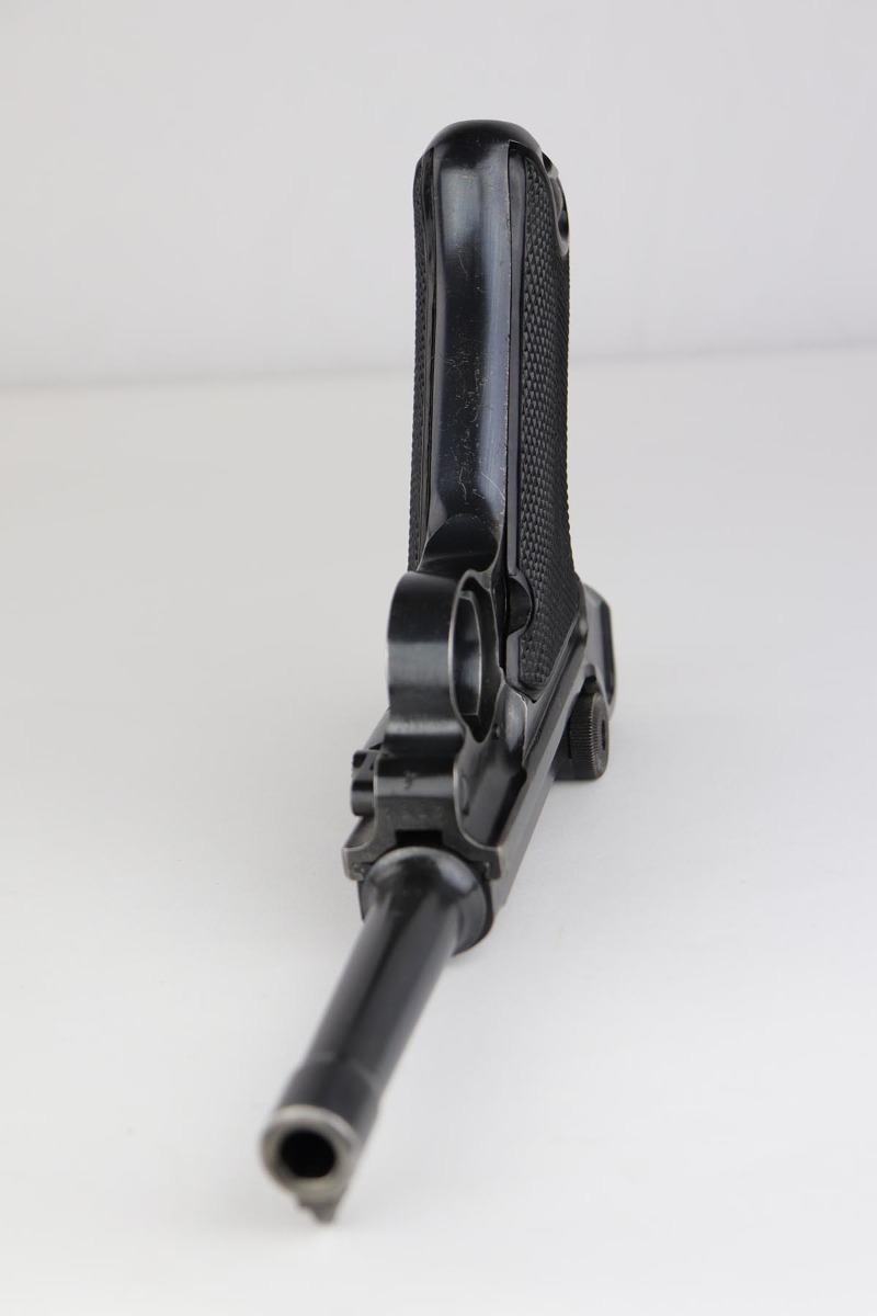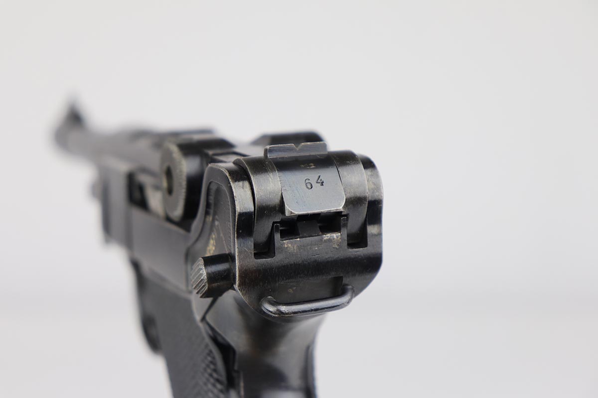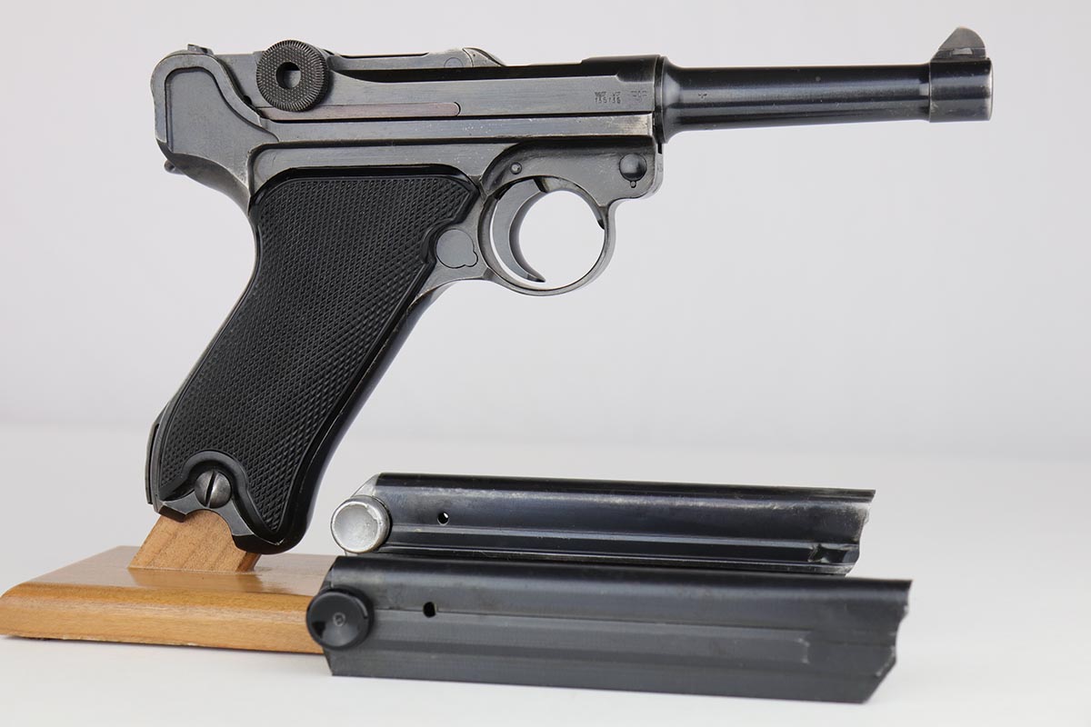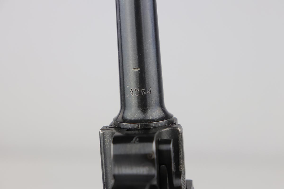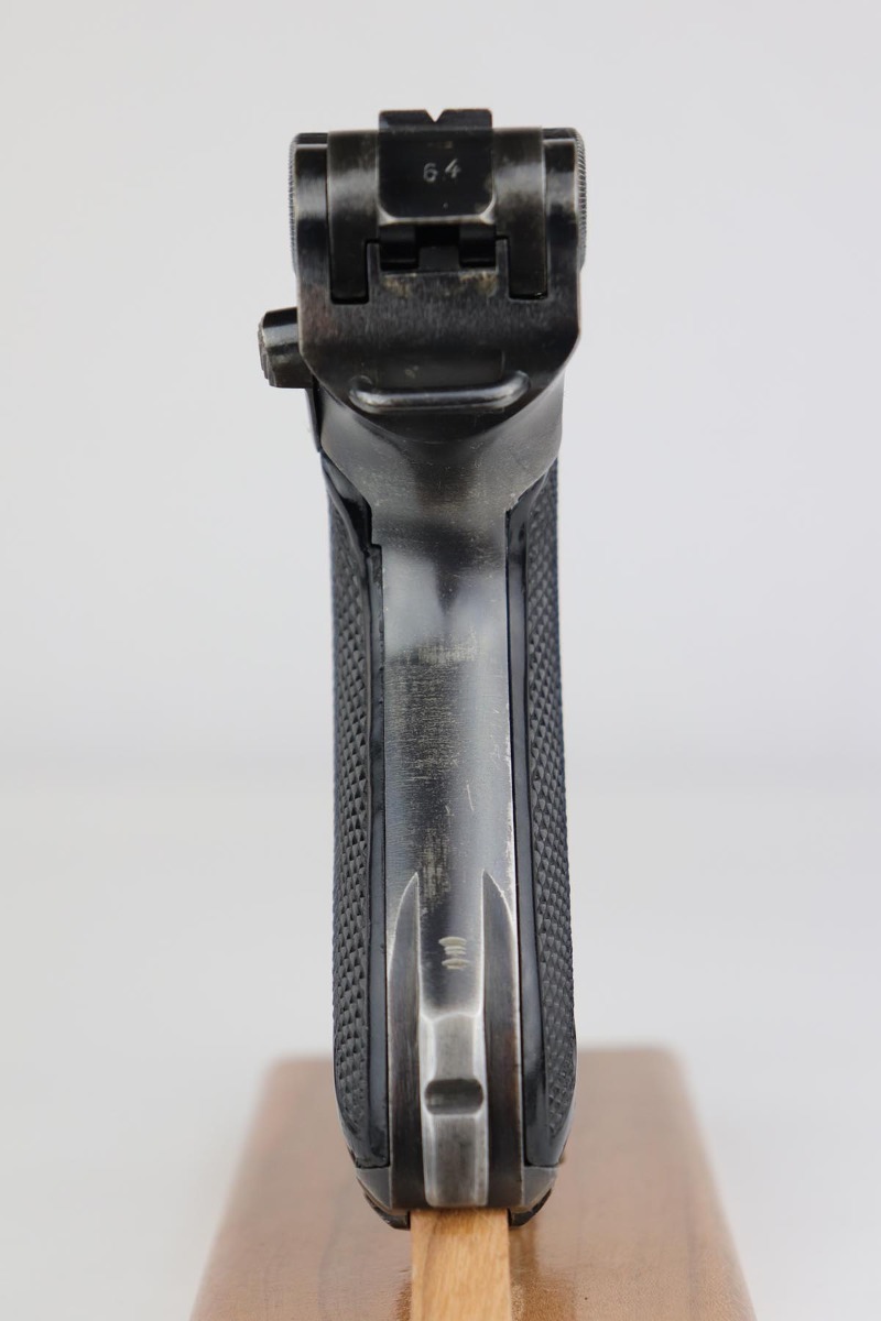 6/3/19 – This is an original Black Widow Mauser Luger from 1942. It is all matching and original, and interestingly enough, also comes with a matching numbered magazine. It properly has the original Black Widow style grips and magazine, and the spare magazine has original numbering that matches the pistol (but no suffix) but is an earlier variant so not correct for this gun. The pistol retains 92-94% original blue with thinning on both straps, and standard high edge wear. Excellent bore, grips and magazine.