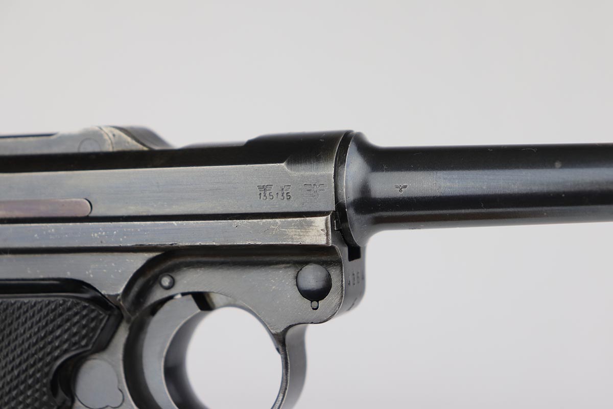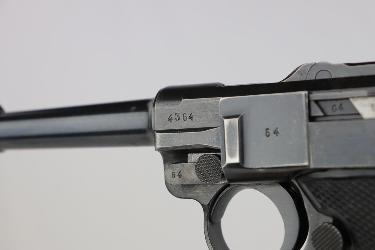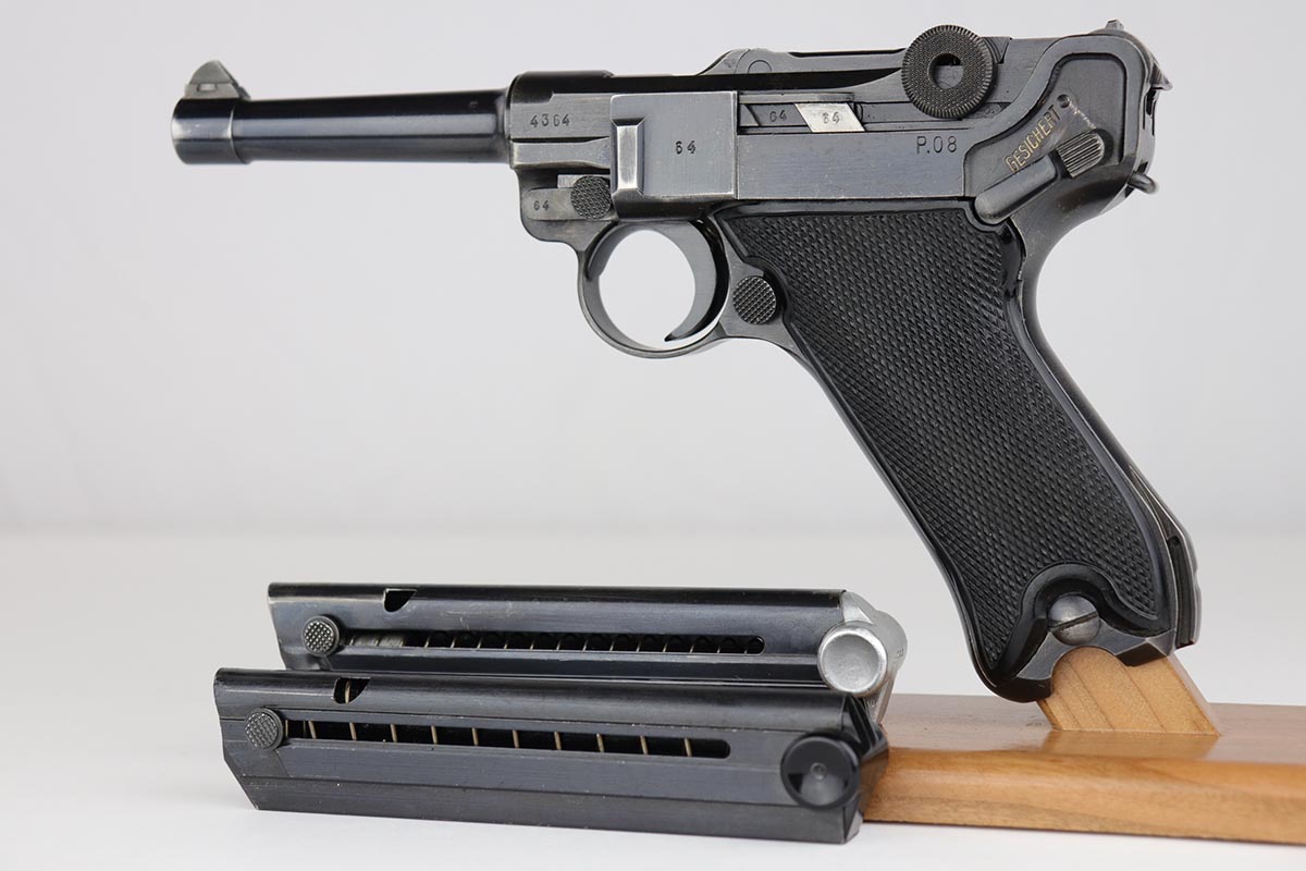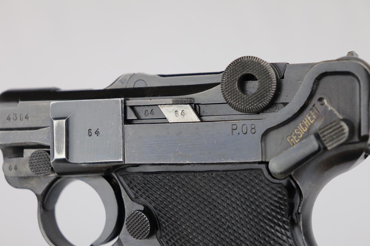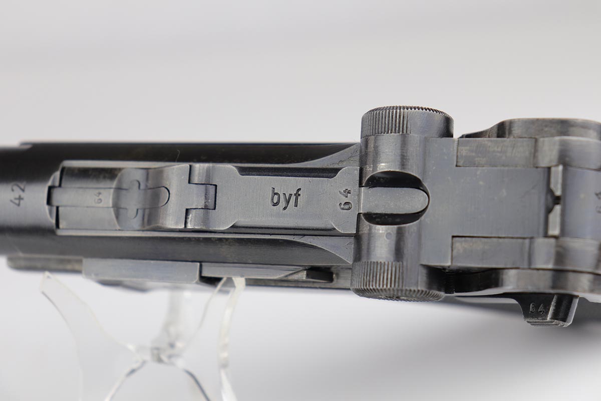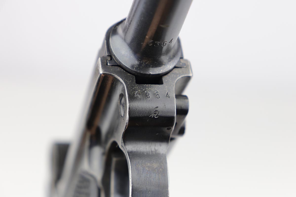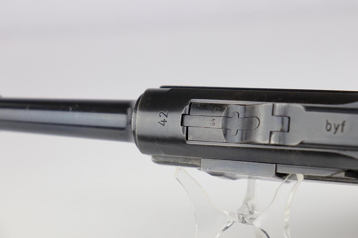 6/3/19 – This is an original Black Widow Mauser Luger from 1942. It is all matching and original, and interestingly enough, also comes with a matching numbered magazine. It properly has the original Black Widow style grips and magazine, and the spare magazine has original numbering that matches the pistol (but no suffix) but is an earlier variant so not correct for this gun. The pistol retains 92-94% original blue with thinning on both straps, and standard high edge wear. Excellent bore, grips and magazine.