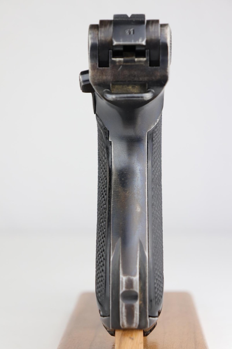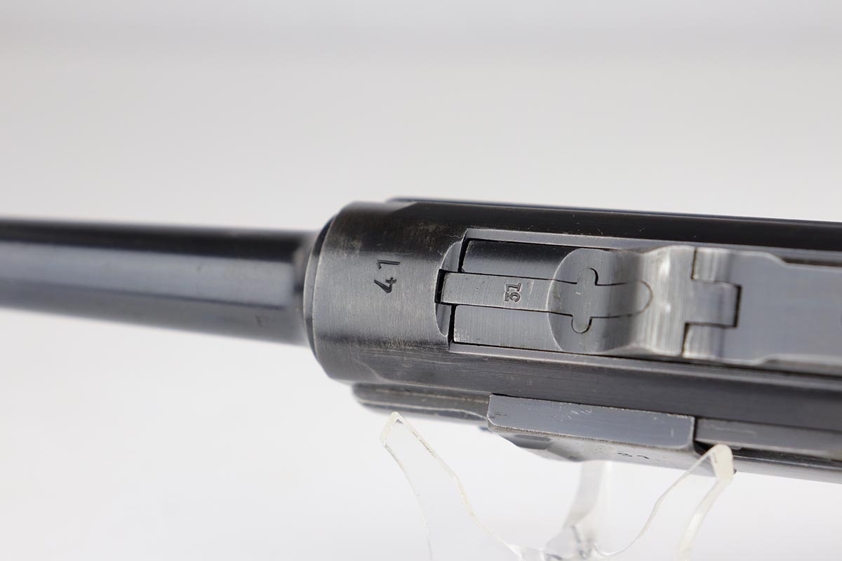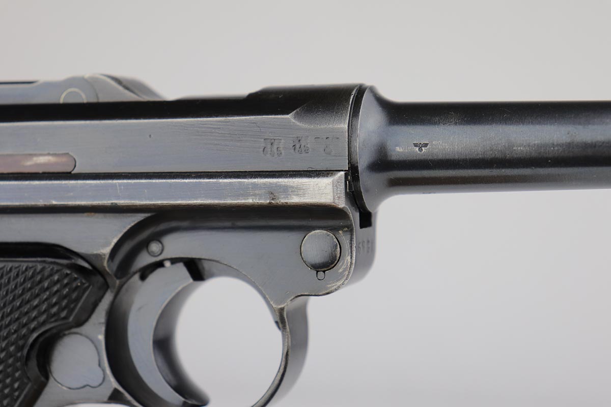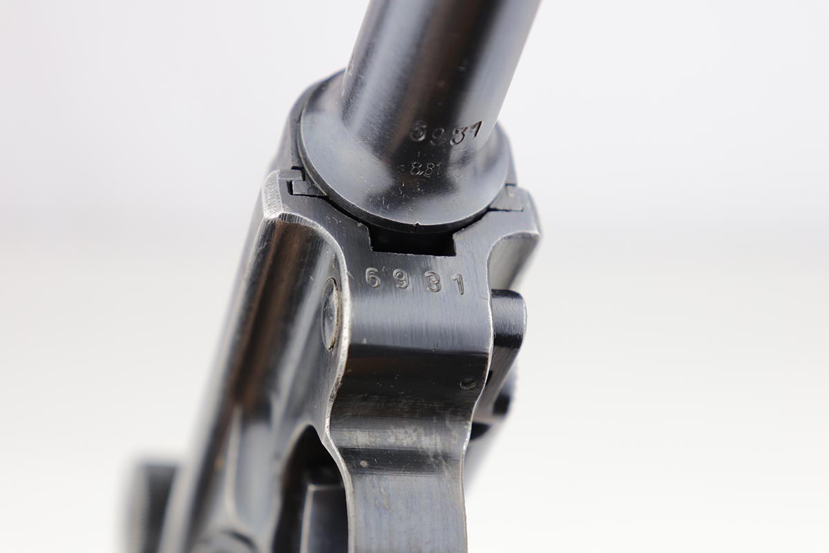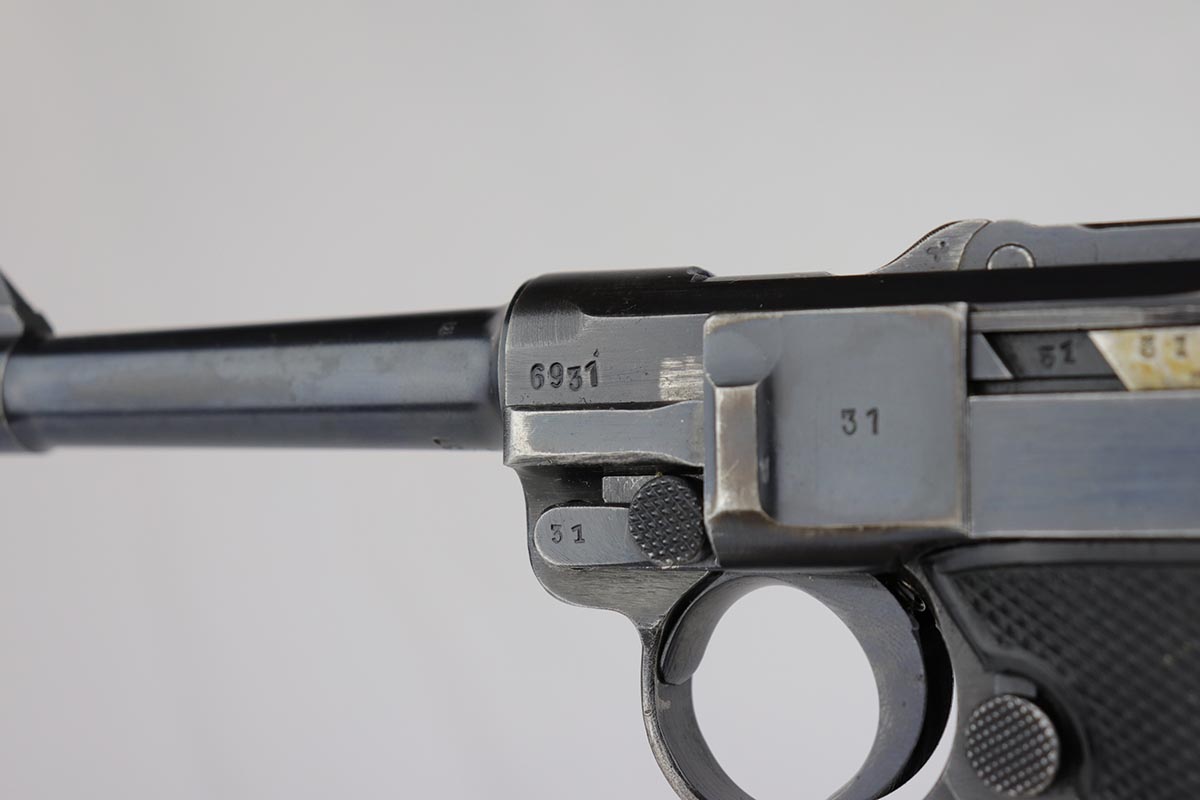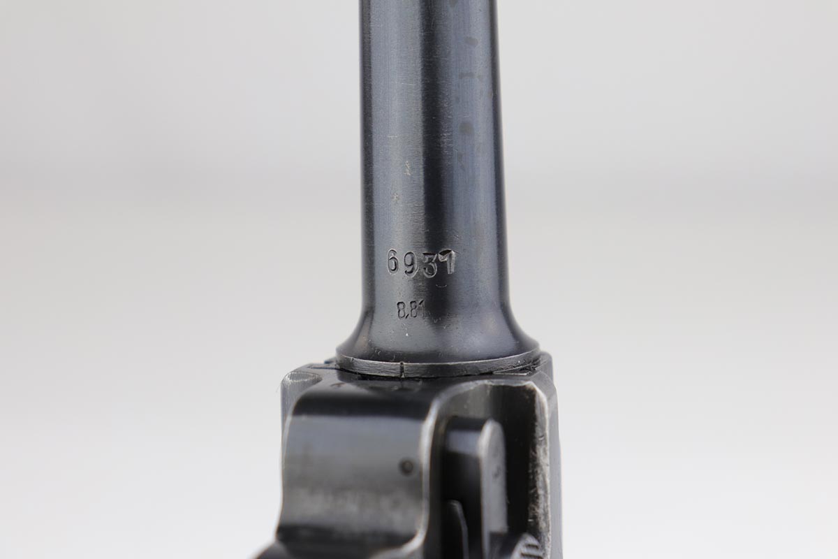 5/23/19 – This is an all matching and original Black Widow Mauser Luger from 1941. All numbered parts are matching, and pistol has correct/original Black Widow style grips and magazine. Bluing rates at 85-90% with thinning and high edge wear in a few areas, and some finish loss on the frame behind the safety. Very nice grips with only minor age and handling wear. Unfortunately, the bore on this one wasn’t cared for very well and there is notable freckling and frost throughout.