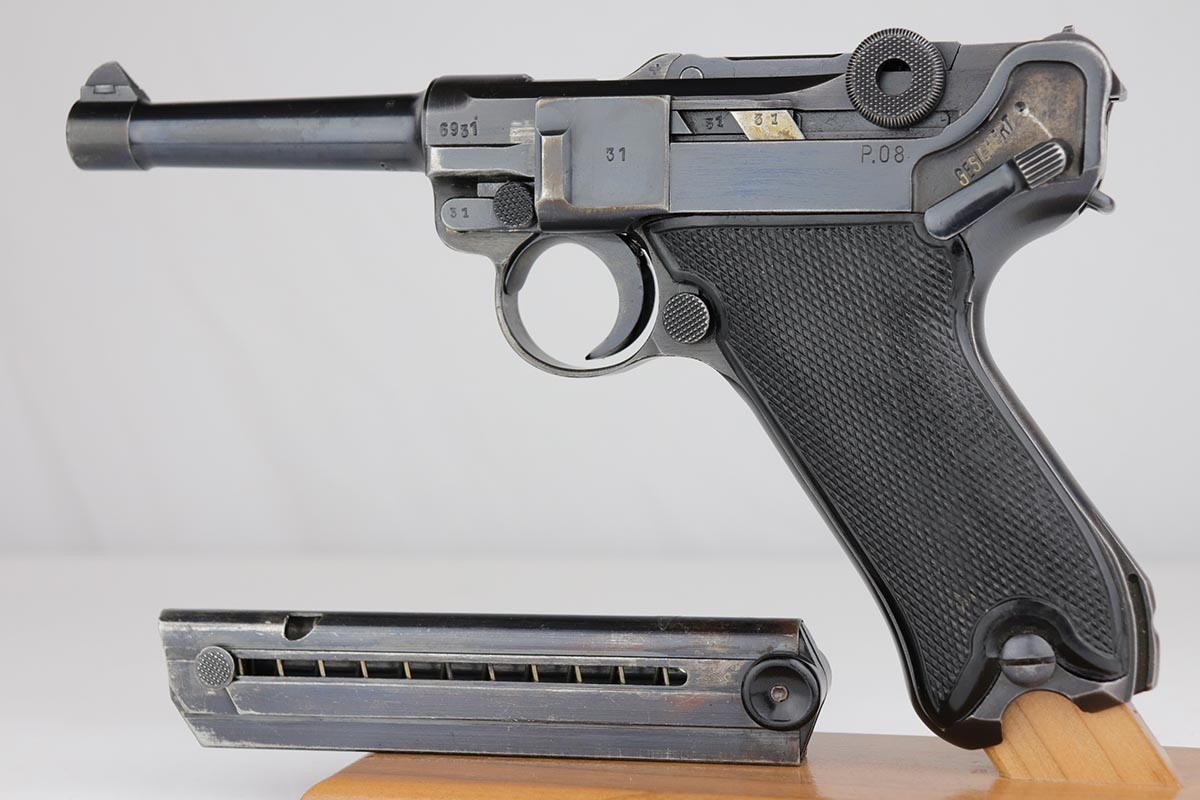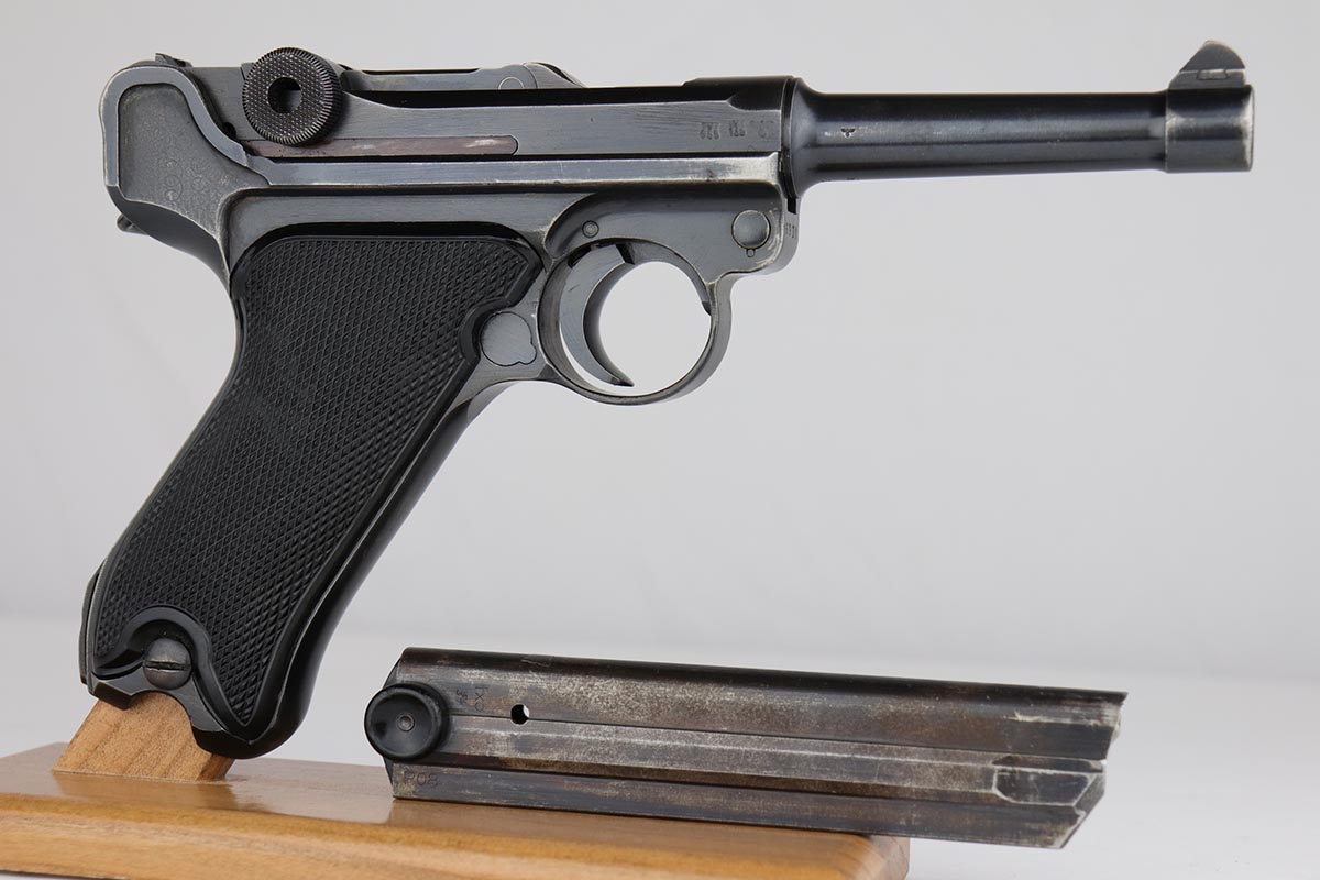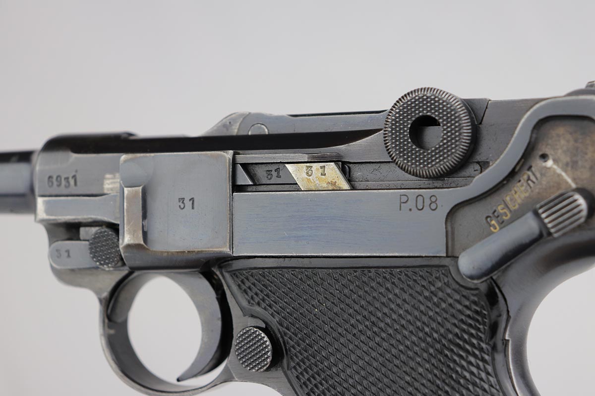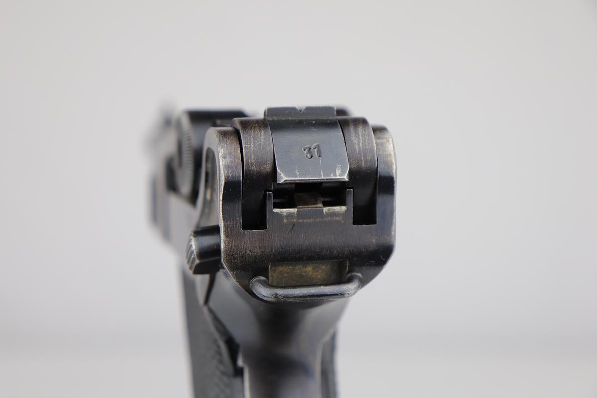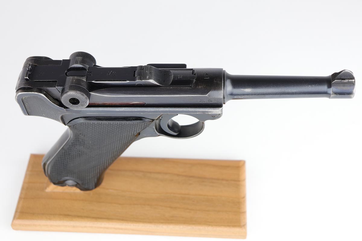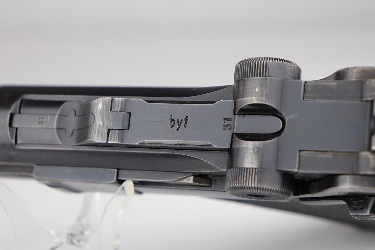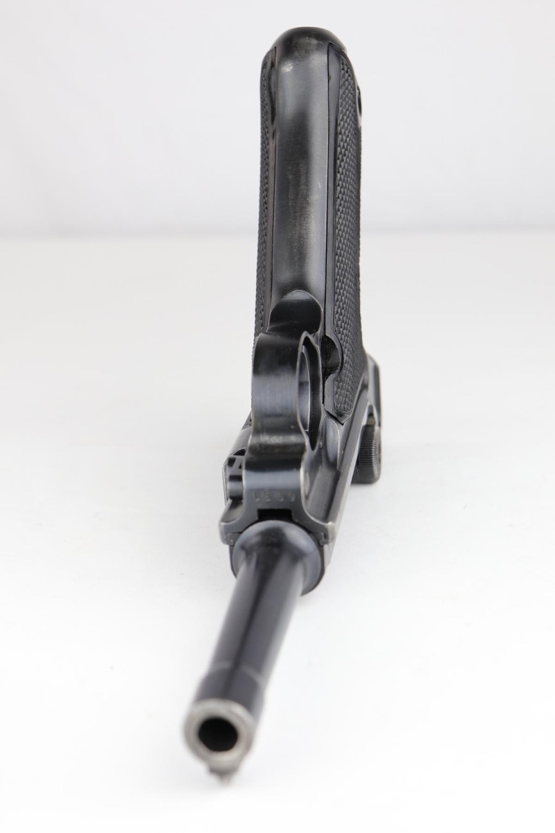 5/23/19 – This is an all matching and original Black Widow Mauser Luger from 1941. All numbered parts are matching, and pistol has correct/original Black Widow style grips and magazine. Bluing rates at 85-90% with thinning and high edge wear in a few areas, and some finish loss on the frame behind the safety. Very nice grips with only minor age and handling wear. Unfortunately, the bore on this one wasn’t cared for very well and there is notable freckling and frost throughout.