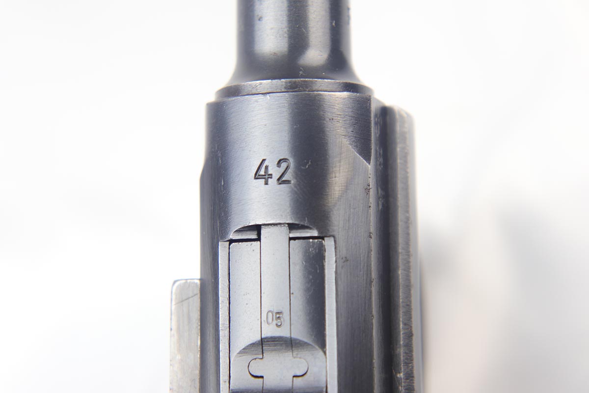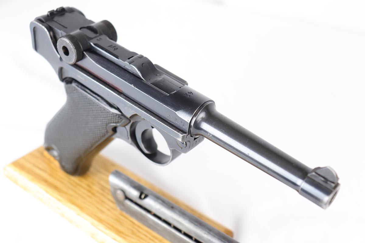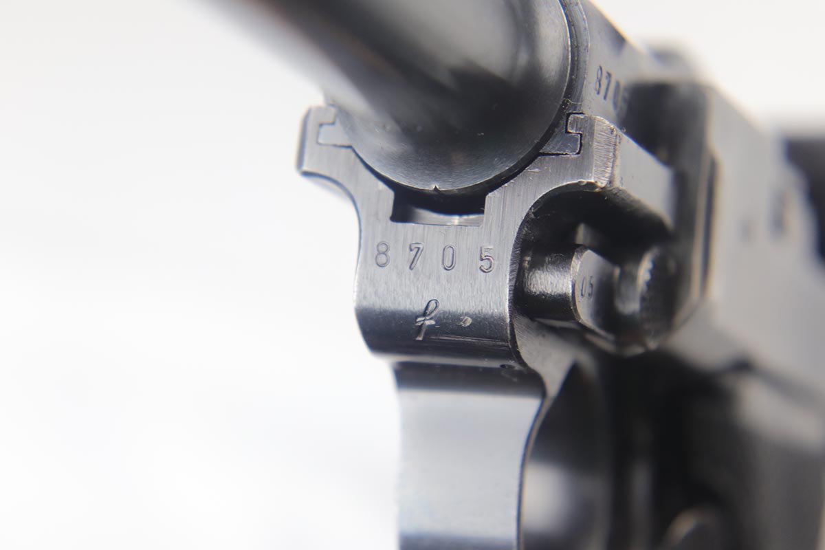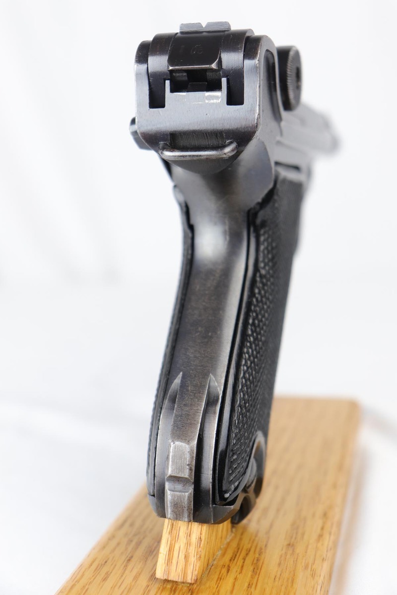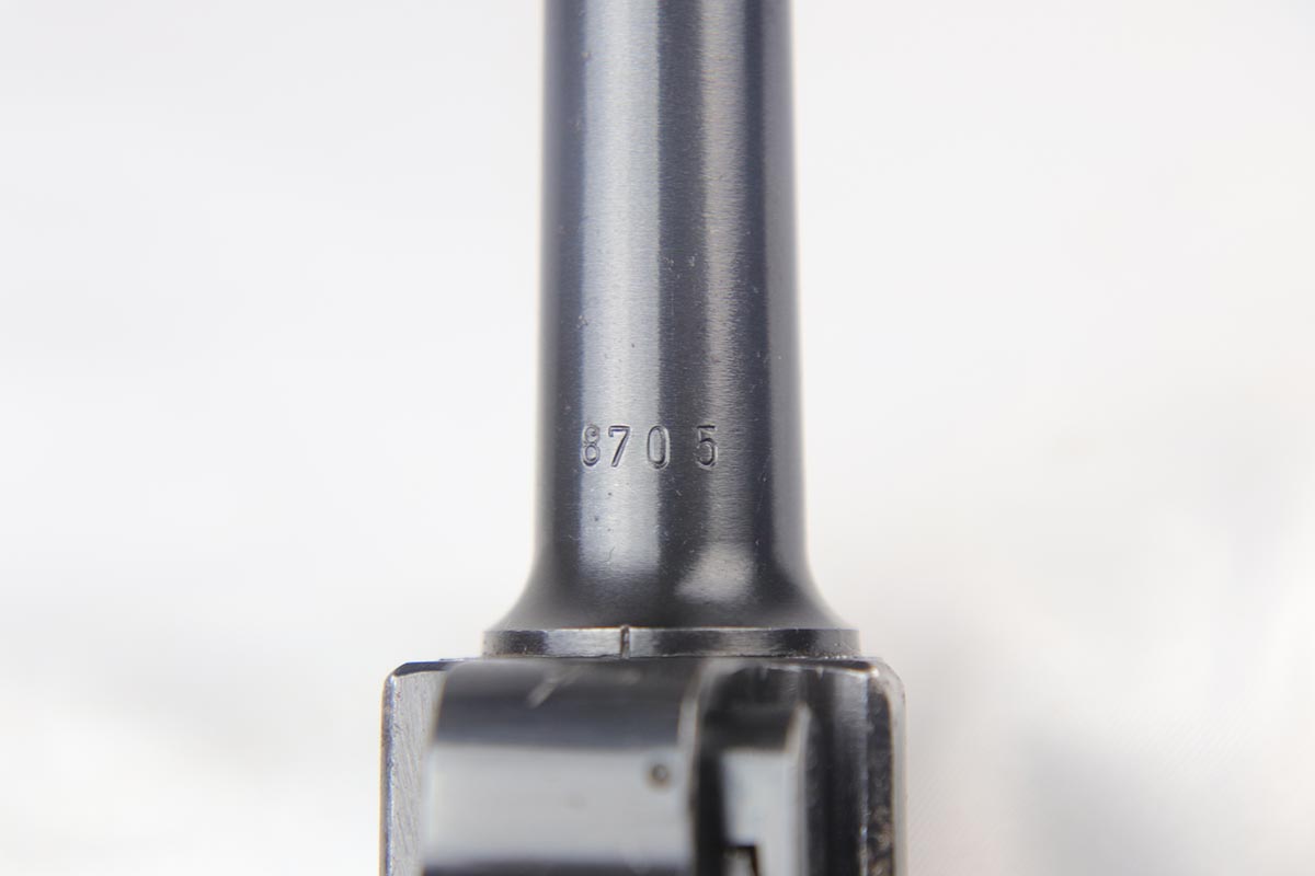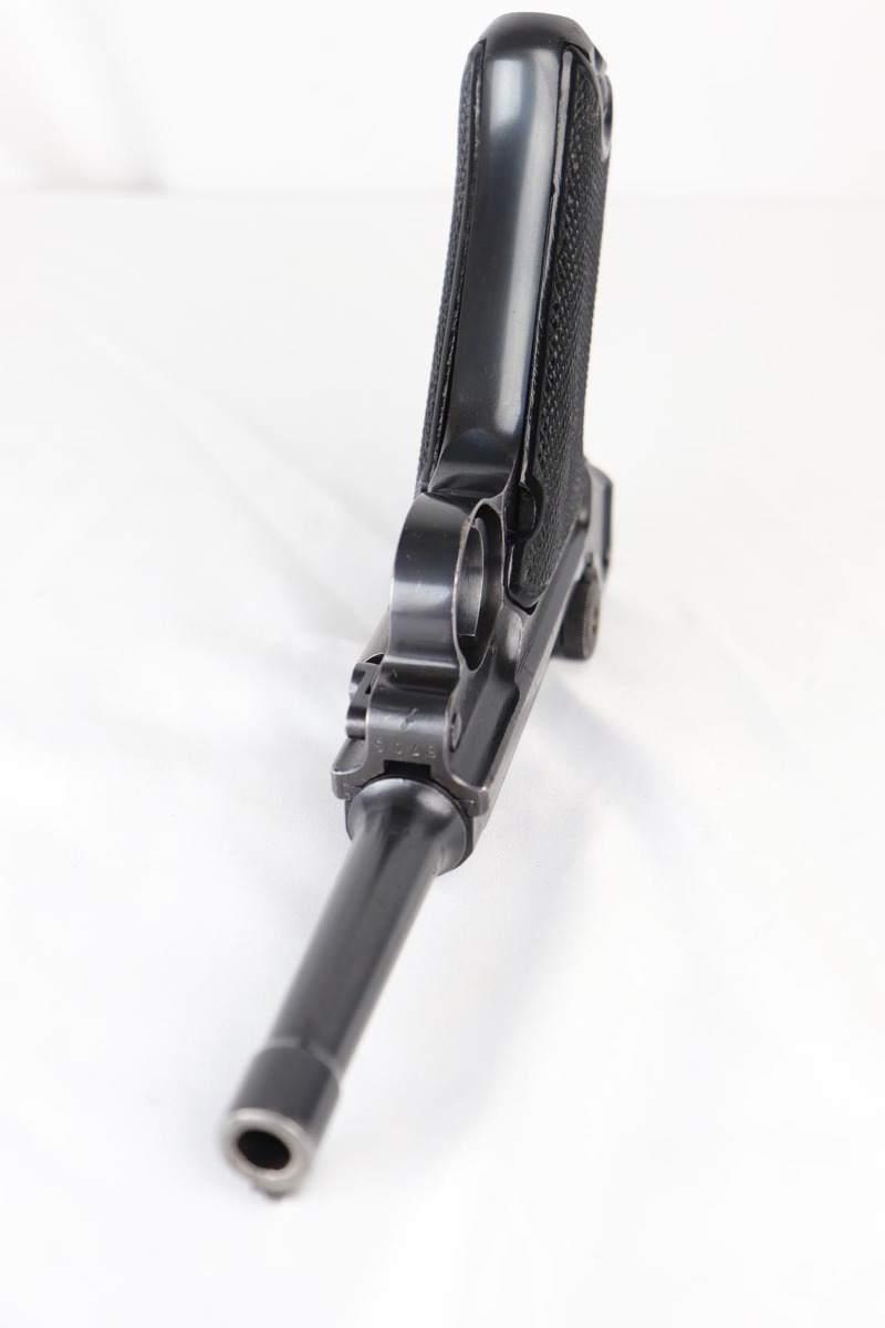9/19/18 – This is an all matching and original Black Widow Mauser Luger from 1942. The original finish rates at about 93-94% with the majority of wear on the sideplate, stock lug and muzzle. Original Black Widow style grips and magazine. The magazine is in excellent shape, the grips do show some age. Bore has mild frosting but no major flaws.