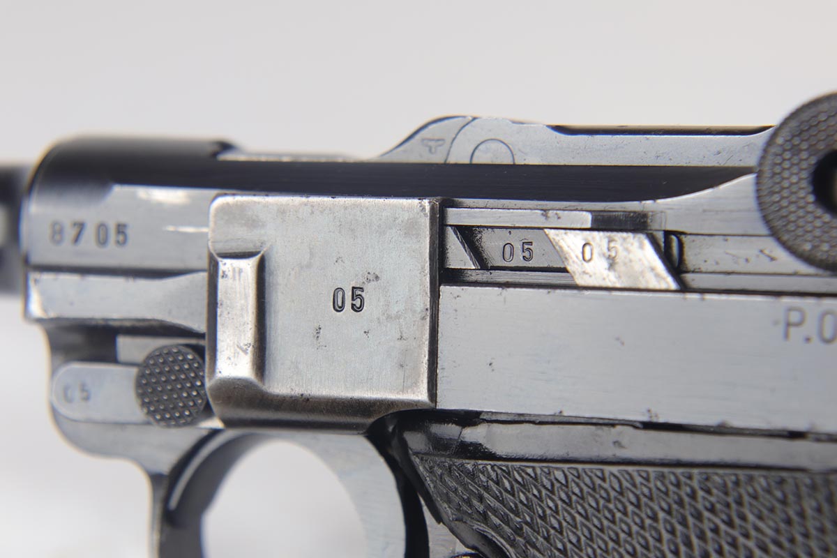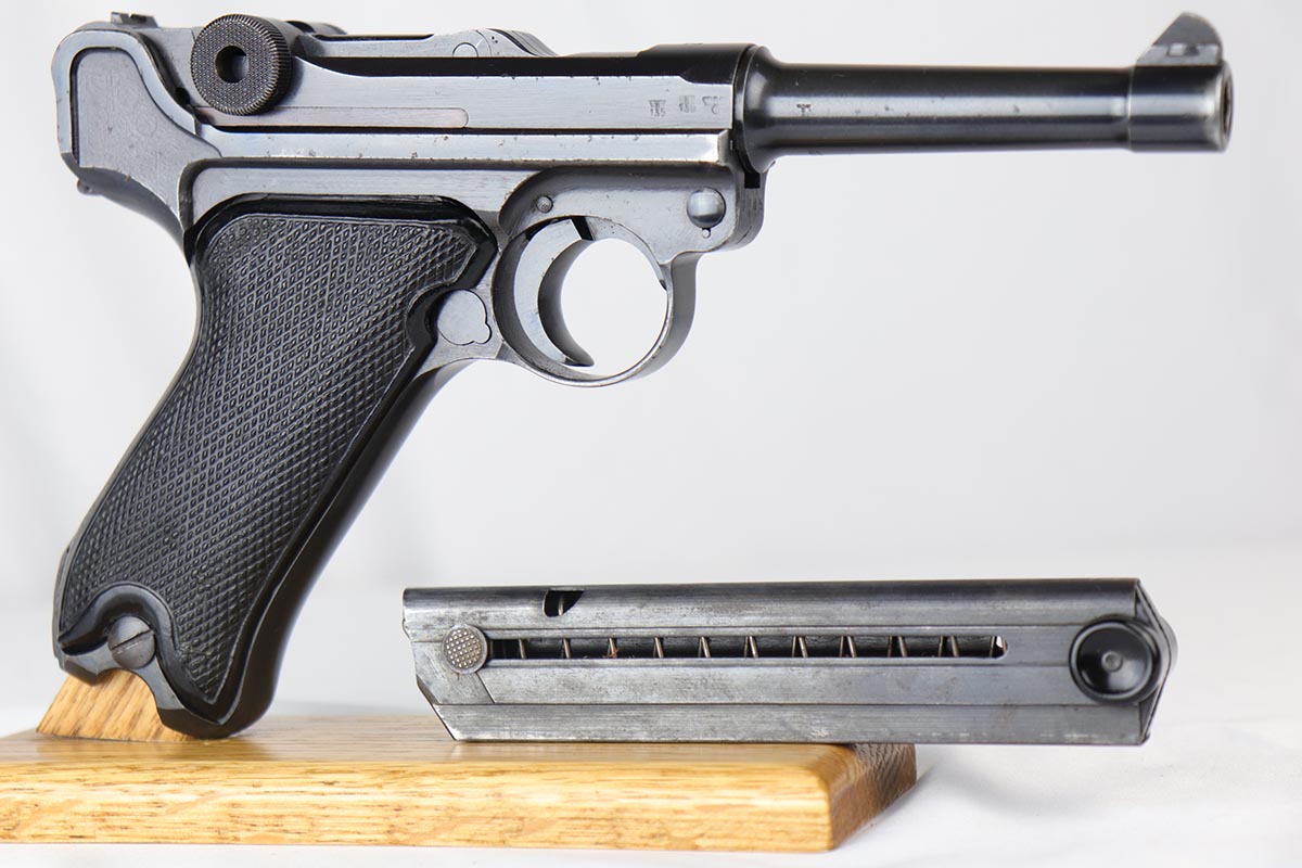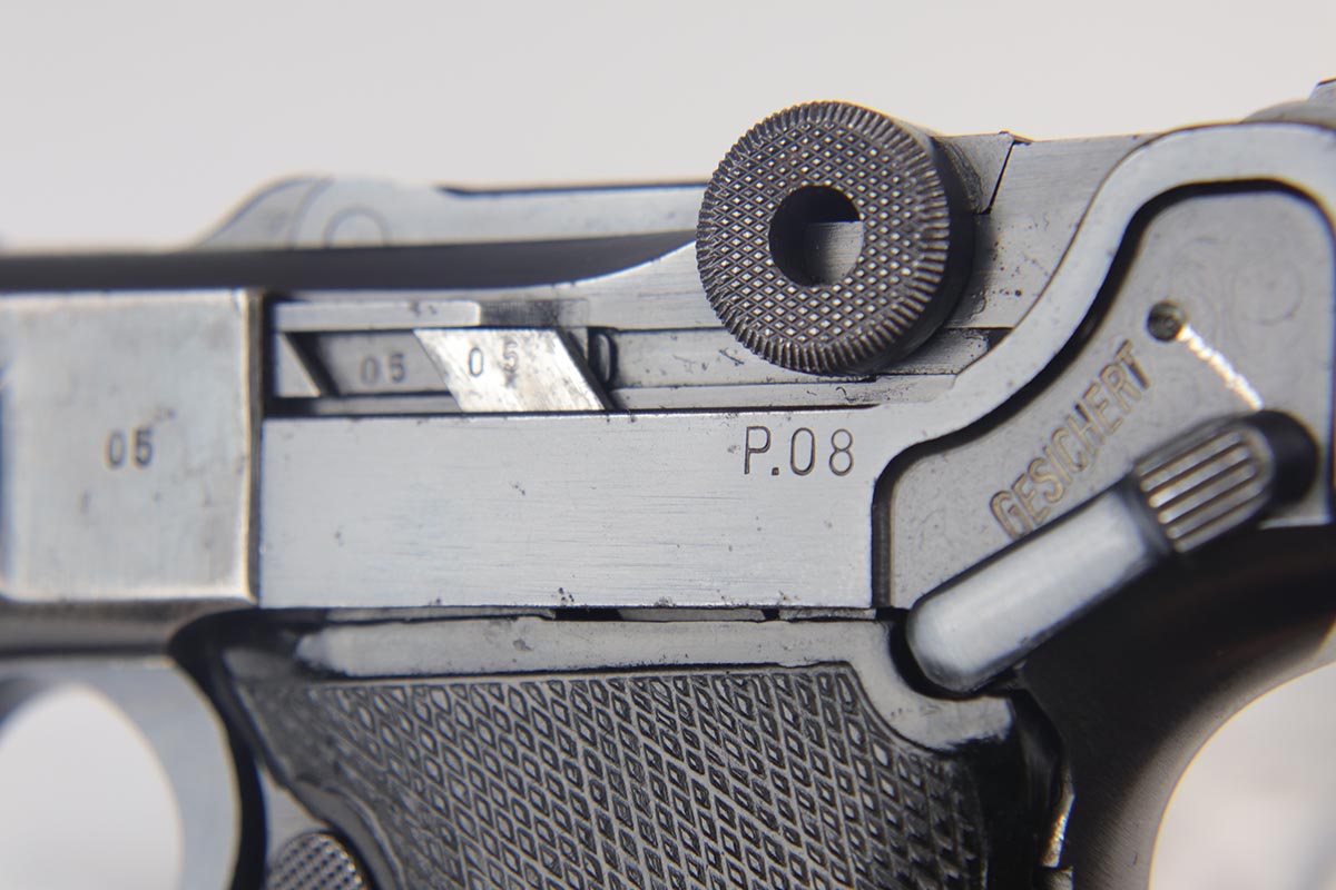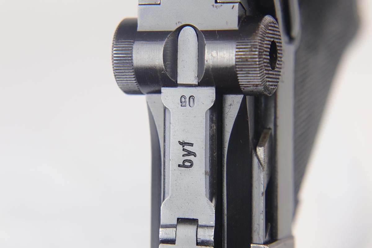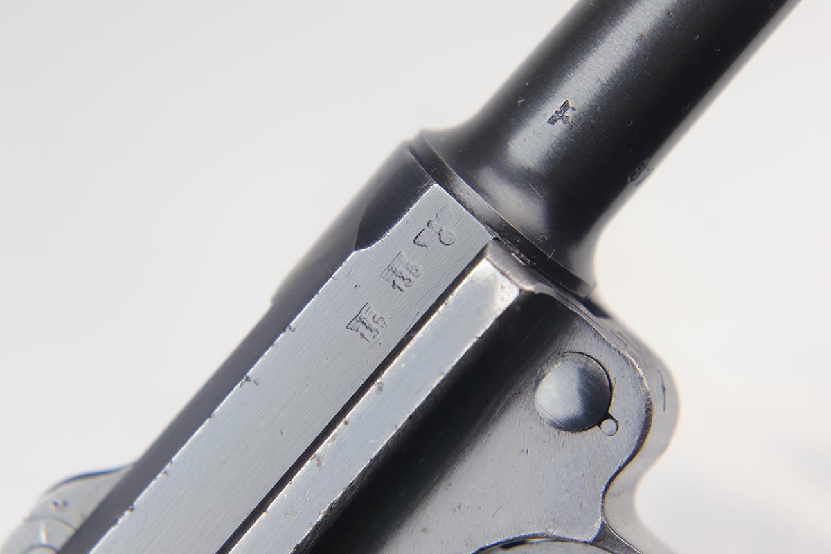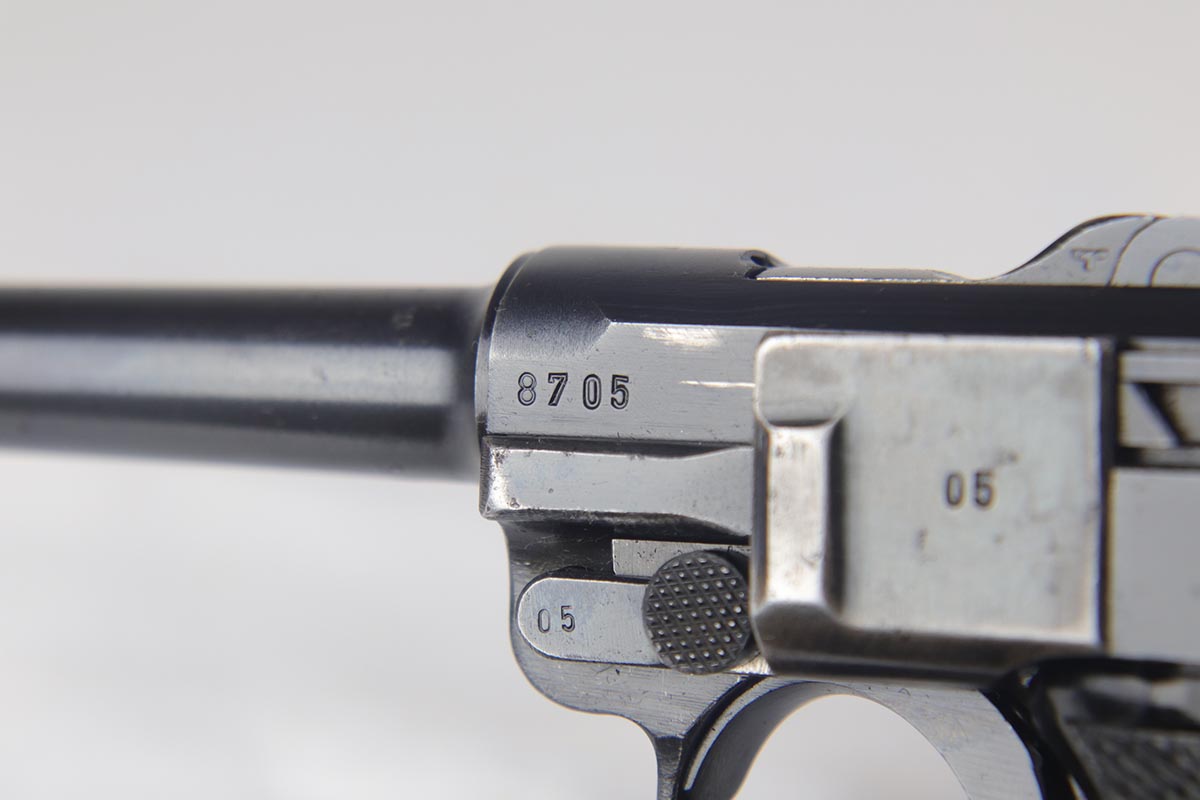 9/19/18 – This is an all matching and original Black Widow Mauser Luger from 1942. The original finish rates at about 93-94% with the majority of wear on the sideplate, stock lug and muzzle. Original Black Widow style grips and magazine. The magazine is in excellent shape, the grips do show some age. Bore has mild frosting but no major flaws.
