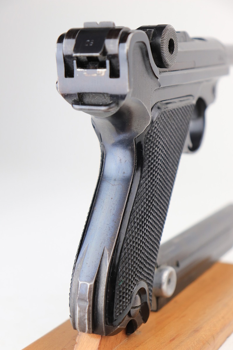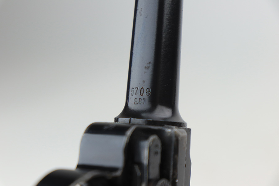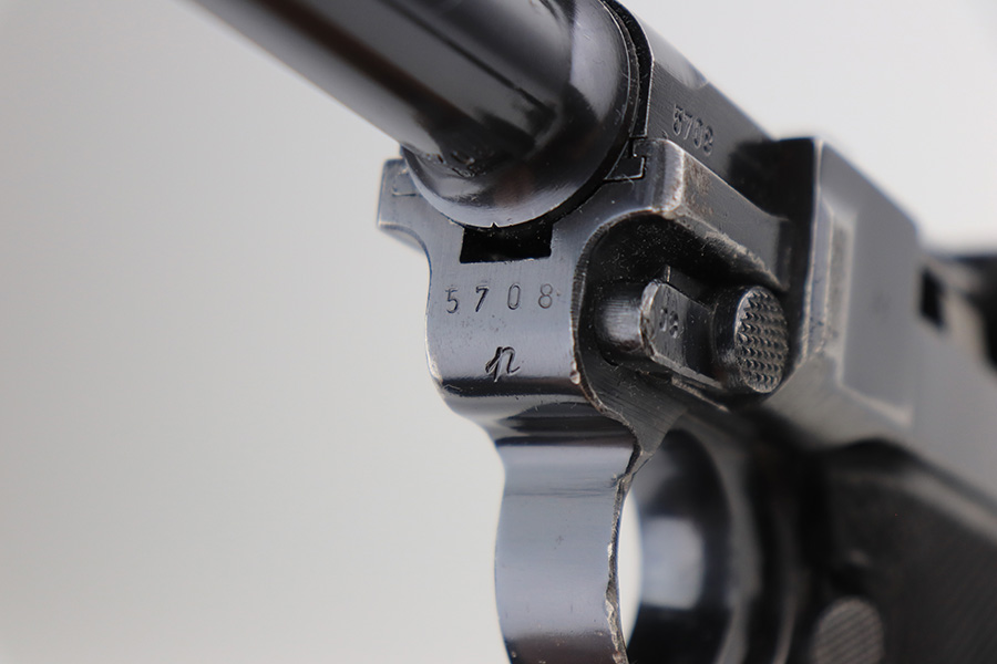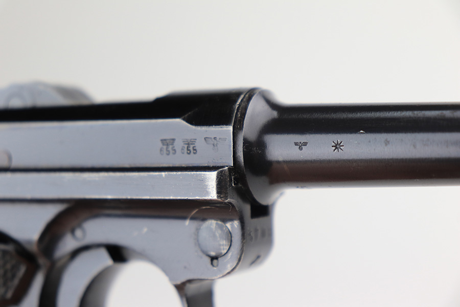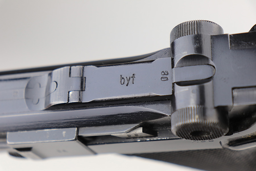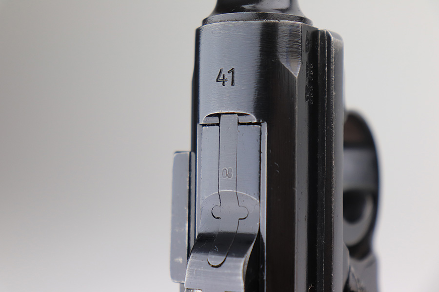 3/16/22 – This is an excellent example of a BYF 41 “Black Widow” Mauser Luger issued to the Nazi military in 1941. The gun is all matching and has the proper “Eagle 655” Nazi military acceptance proofs on the right side of the slide. There is an “asterisk” marking on the right side of the barrel, indicating the barrel failed initial inspection and was sent back to the factory for repair. This one comes with one original matching-numbered magazine and is fitted with a pair of iconic period-correct “Black Widow” black bakelite grips. The gun has retained about 95-96% of its original finish. There are areas of minor wear on the side plate, side rails, and around the muzzle. There are tiny handling marks/scratches on both grip straps, and there is a number very lightly scratched into the front strap. The bore has great rifling, but there is minor freckling throughout.