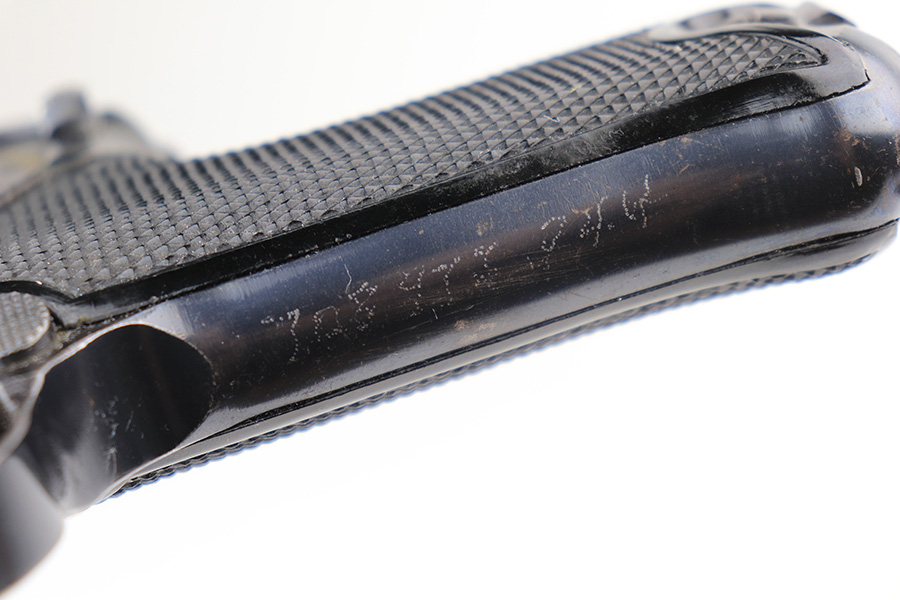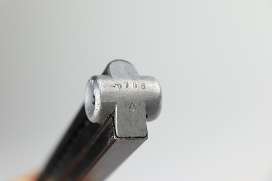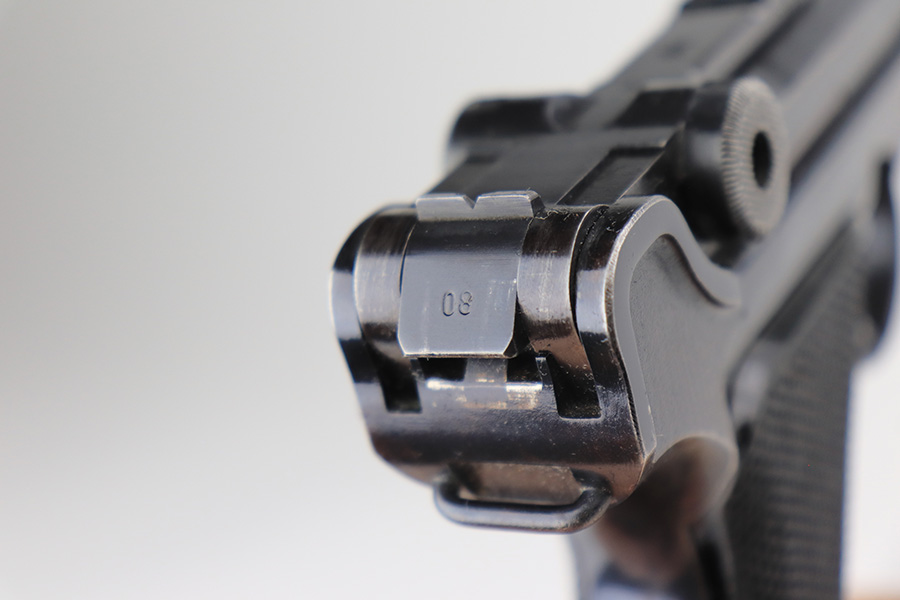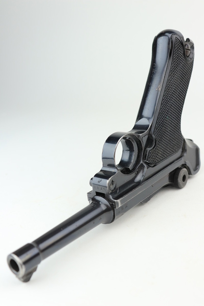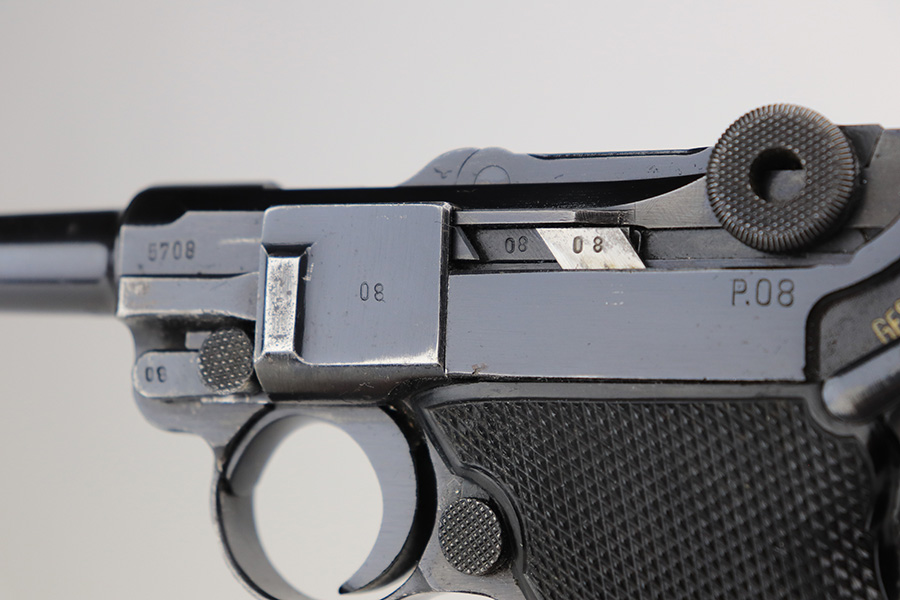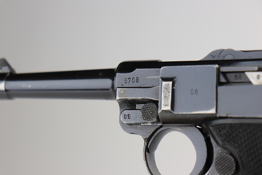 3/16/22 – This is an excellent example of a BYF 41 “Black Widow” Mauser Luger issued to the Nazi military in 1941. The gun is all matching and has the proper “Eagle 655” Nazi military acceptance proofs on the right side of the slide. There is an “asterisk” marking on the right side of the barrel, indicating the barrel failed initial inspection and was sent back to the factory for repair. This one comes with one original matching-numbered magazine and is fitted with a pair of iconic period-correct “Black Widow” black bakelite grips. The gun has retained about 95-96% of its original finish. There are areas of minor wear on the side plate, side rails, and around the muzzle. There are tiny handling marks/scratches on both grip straps, and there is a number very lightly scratched into the front strap. The bore has great rifling, but there is minor freckling throughout.