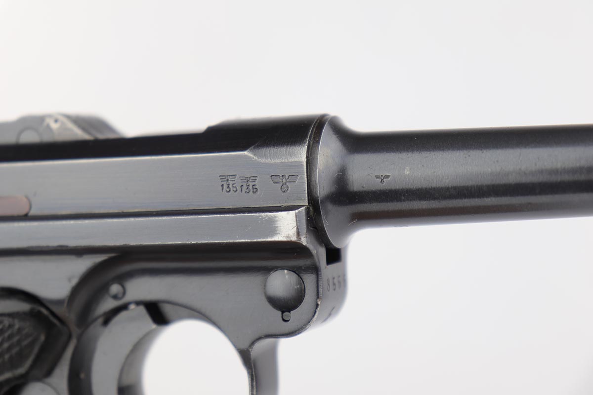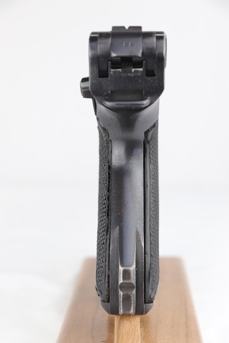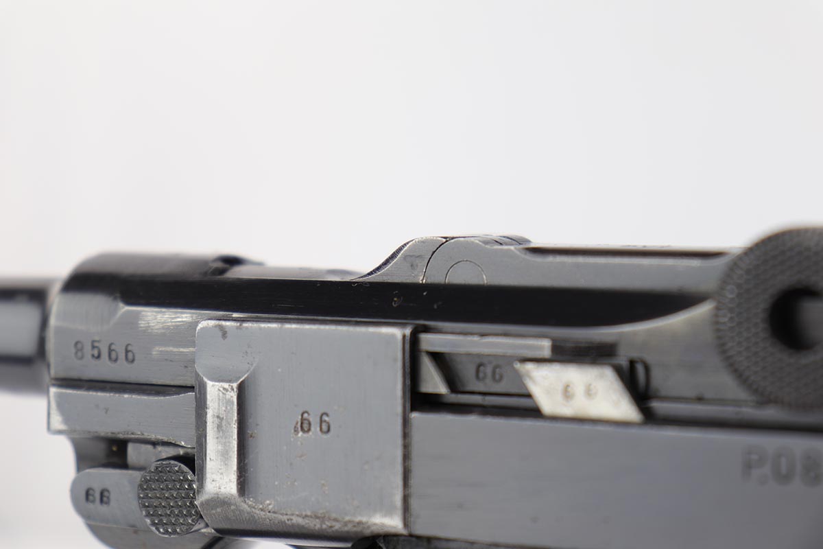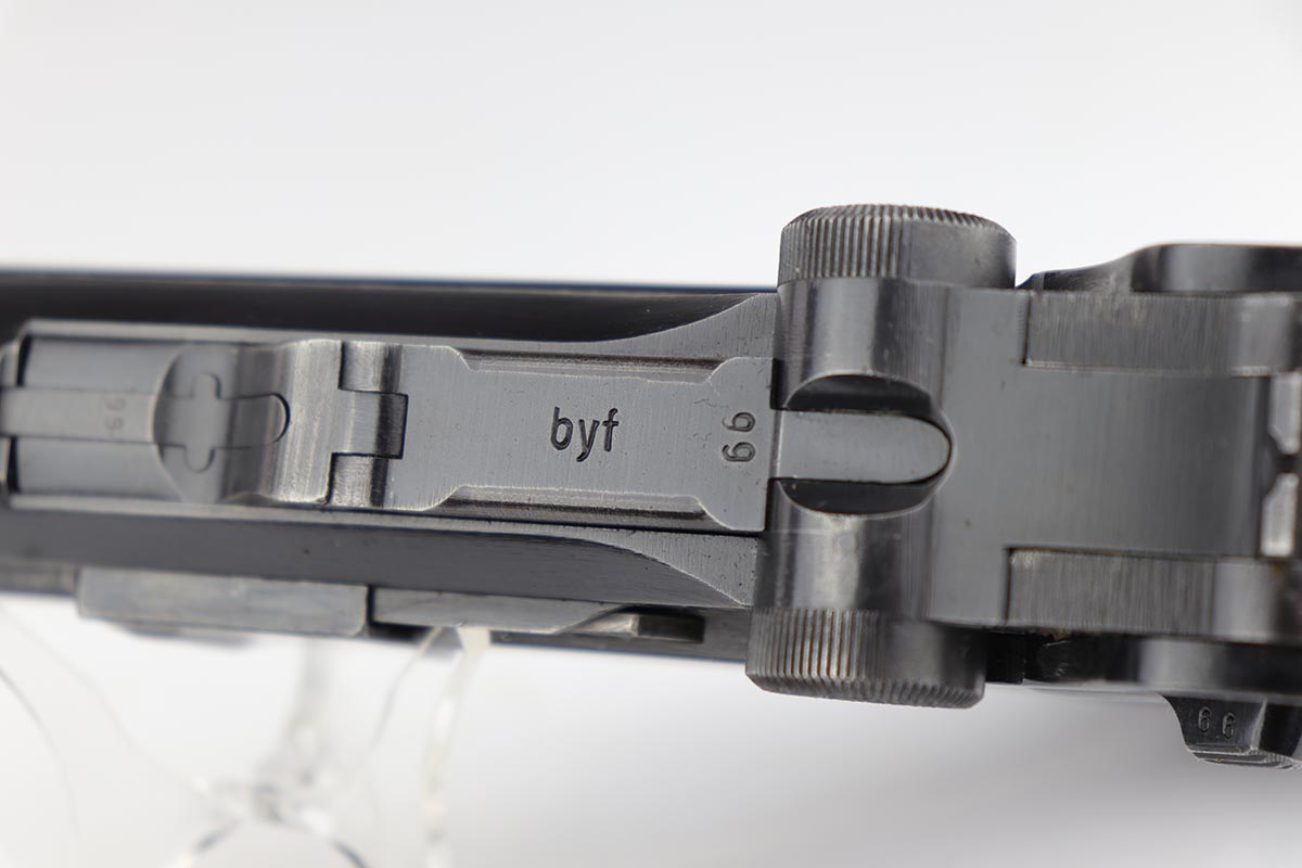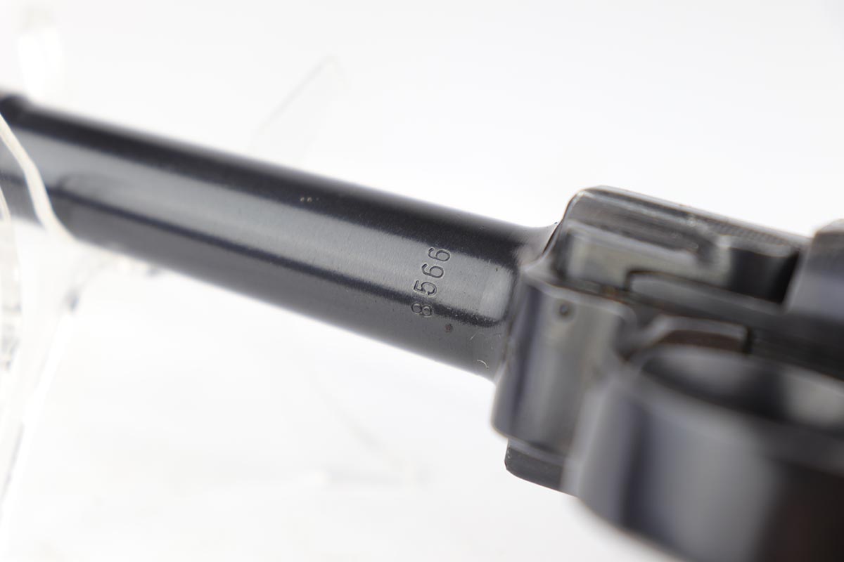 4/4/19 – This is an original Mauser BYF 42 “Black Widow” Luger, complete with two original “fxo” stamped black widow magazines, eagle/135 tool, and a pigskin leather holster. The pistol is all correct and matching with about 95+% of bluing still intact. Most of the wear can be found on the side plate and on the back strap of this pistol. The side plate has some speckling around the edges and near the serial number “66”. The back strap has some light browning which is normal strap wear and not excessive. The rest of the frame is excellent with beautiful dark bluing. The barrel has some light wear as well, mostly near the muzzle which is normal. The bore has light signs of use but overall is nice with strong rifling and would function properly with no issues. The grips are original but both show age and handling wear. The holster has some light surface wear and cracking near the front toe, but overall is in great condition and a scarce variation Luger holster.