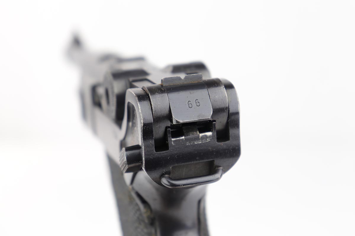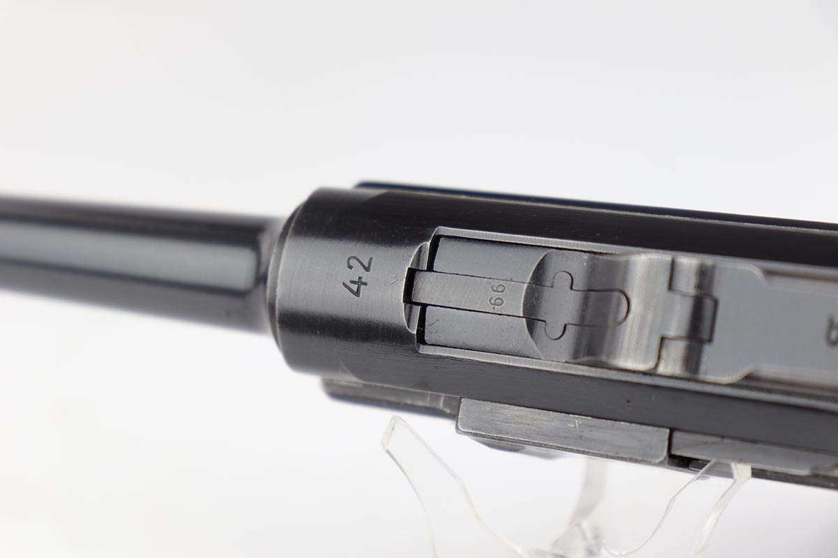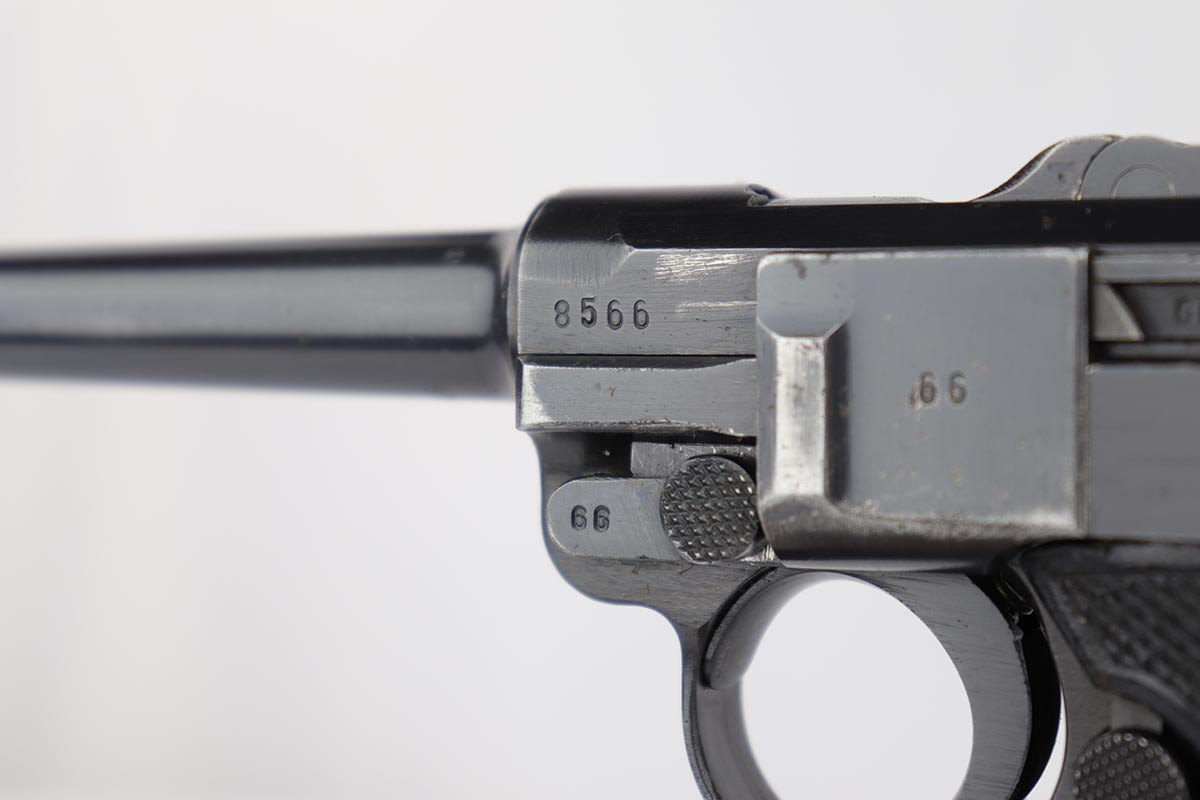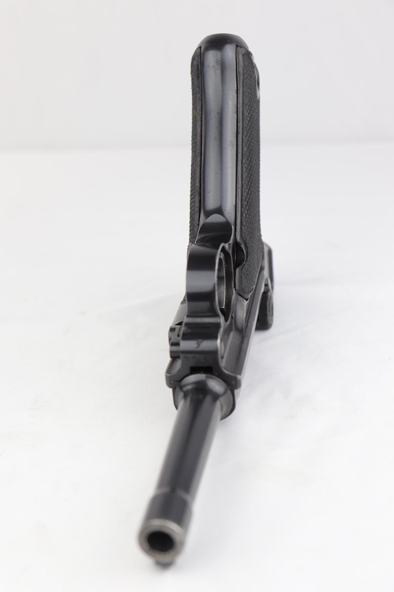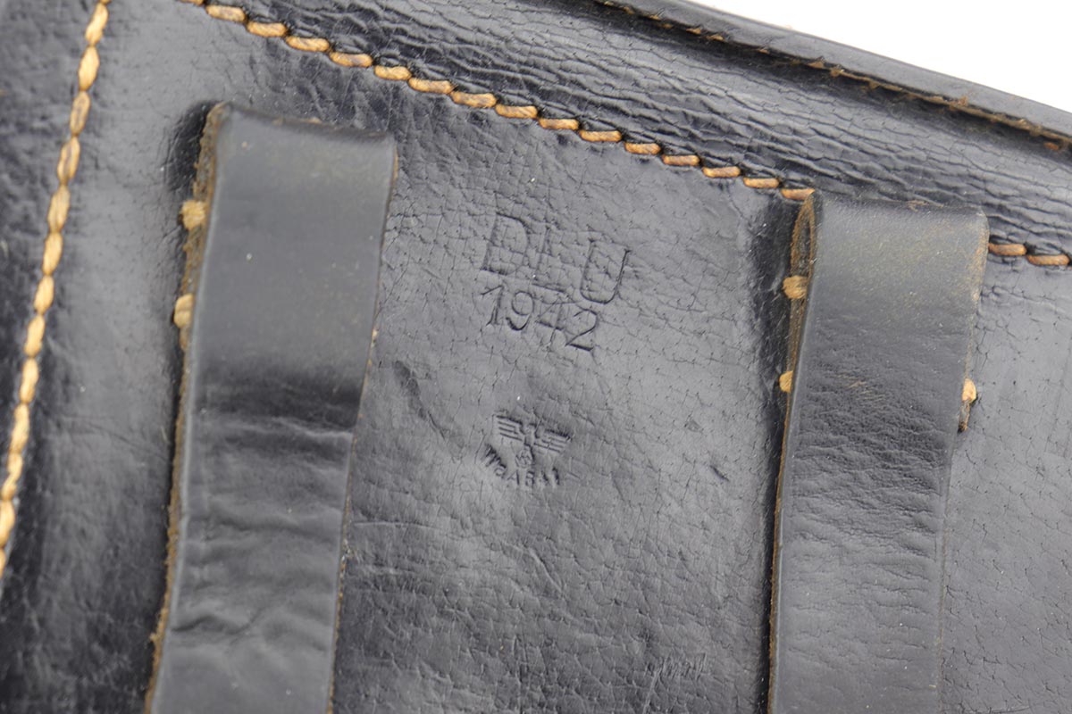 4/4/19 – This is an original Mauser BYF 42 “Black Widow” Luger, complete with two original “fxo” stamped black widow magazines, eagle/135 tool, and a pigskin leather holster. The pistol is all correct and matching with about 95+% of bluing still intact. Most of the wear can be found on the side plate and on the back strap of this pistol. The side plate has some speckling around the edges and near the serial number “66”. The back strap has some light browning which is normal strap wear and not excessive. The rest of the frame is excellent with beautiful dark bluing. The barrel has some light wear as well, mostly near the muzzle which is normal. The bore has light signs of use but overall is nice with strong rifling and would function properly with no issues. The grips are original but both show age and handling wear. The holster has some light surface wear and cracking near the front toe, but overall is in great condition and a scarce variation Luger holster.