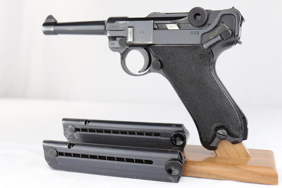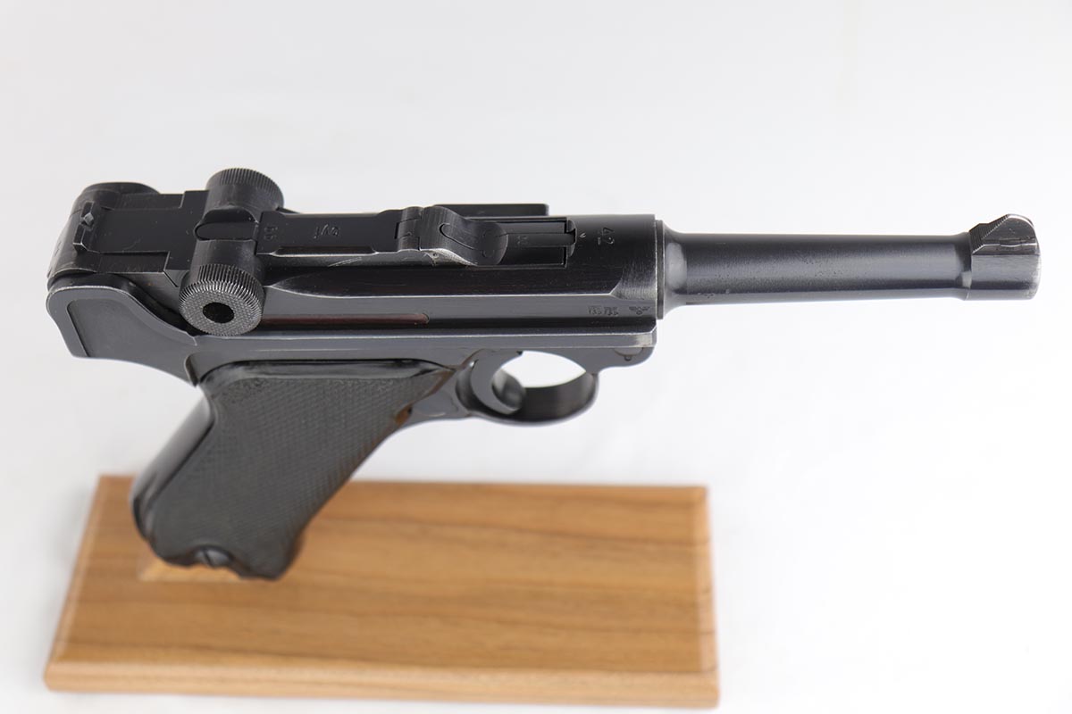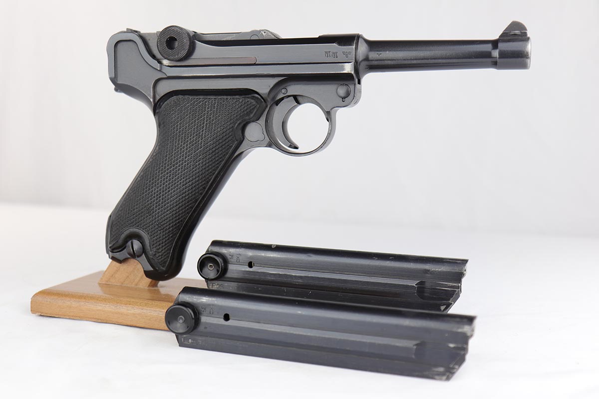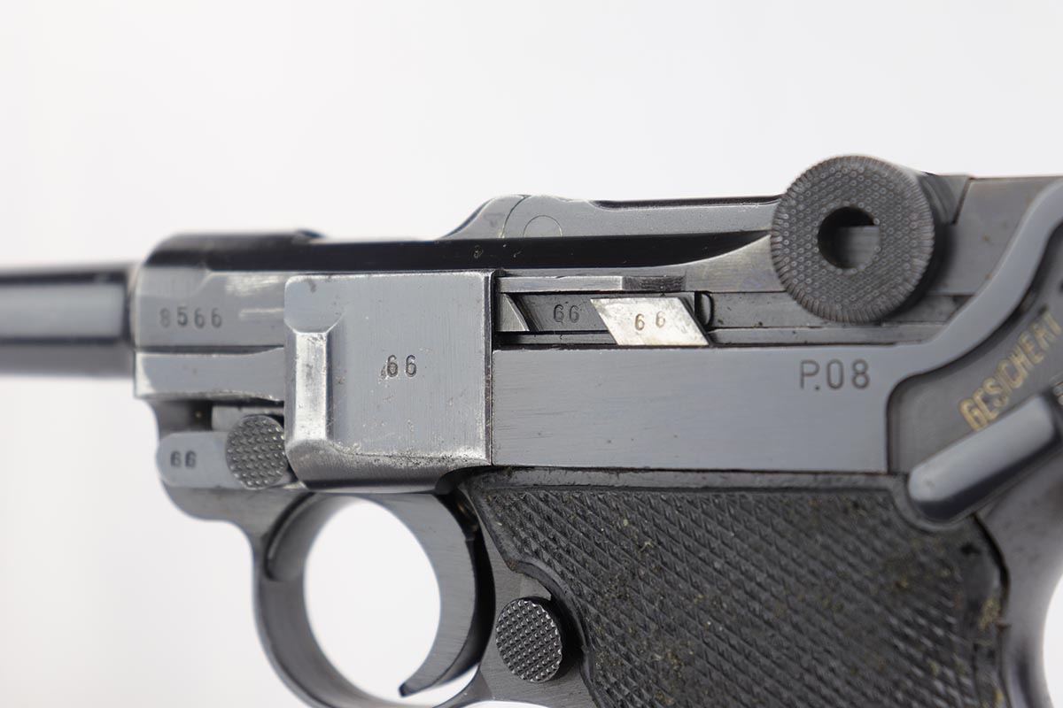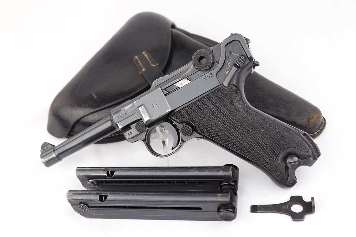 4/4/19 – This is an original Mauser BYF 42 “Black Widow” Luger, complete with two original “fxo” stamped black widow magazines, eagle/135 tool, and a pigskin leather holster. The pistol is all correct and matching with about 95+% of bluing still intact. Most of the wear can be found on the side plate and on the back strap of this pistol. The side plate has some speckling around the edges and near the serial number “66”. The back strap has some light browning which is normal strap wear and not excessive. The rest of the frame is excellent with beautiful dark bluing. The barrel has some light wear as well, mostly near the muzzle which is normal. The bore has light signs of use but overall is nice with strong rifling and would function properly with no issues. The grips are original but both show age and handling wear. The holster has some light surface wear and cracking near the front toe, but overall is in great condition and a scarce variation Luger holster.