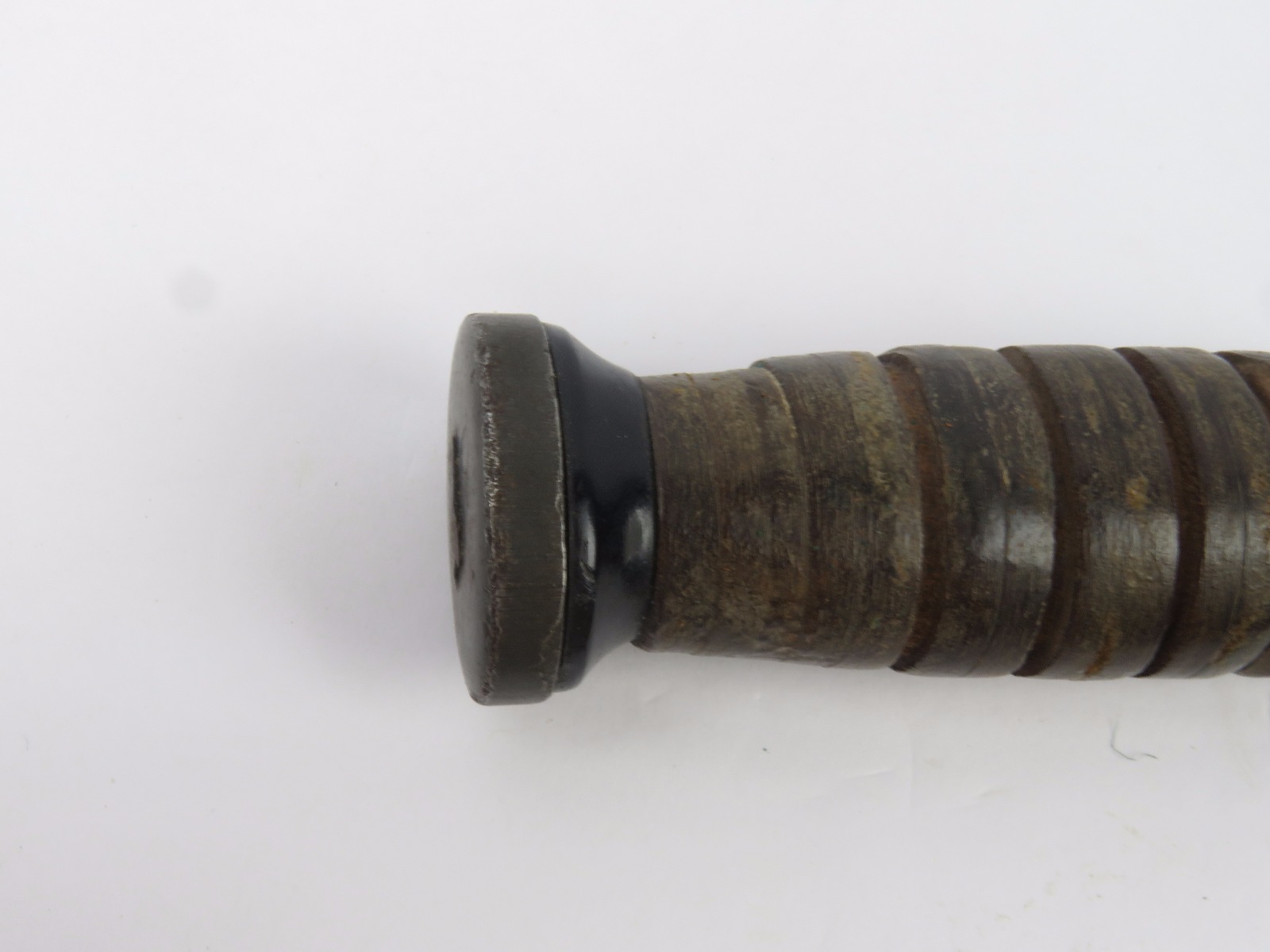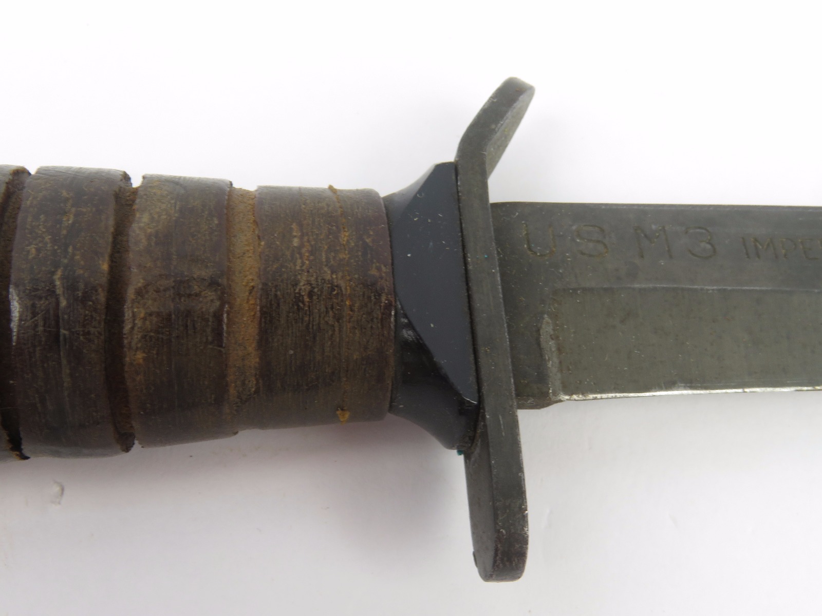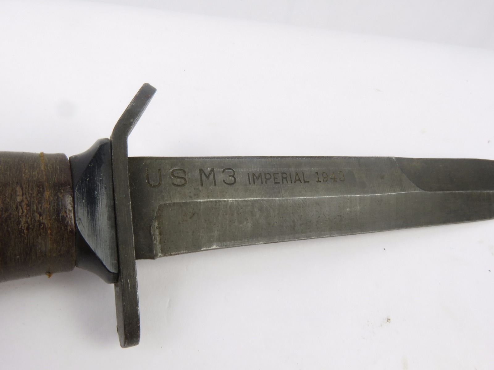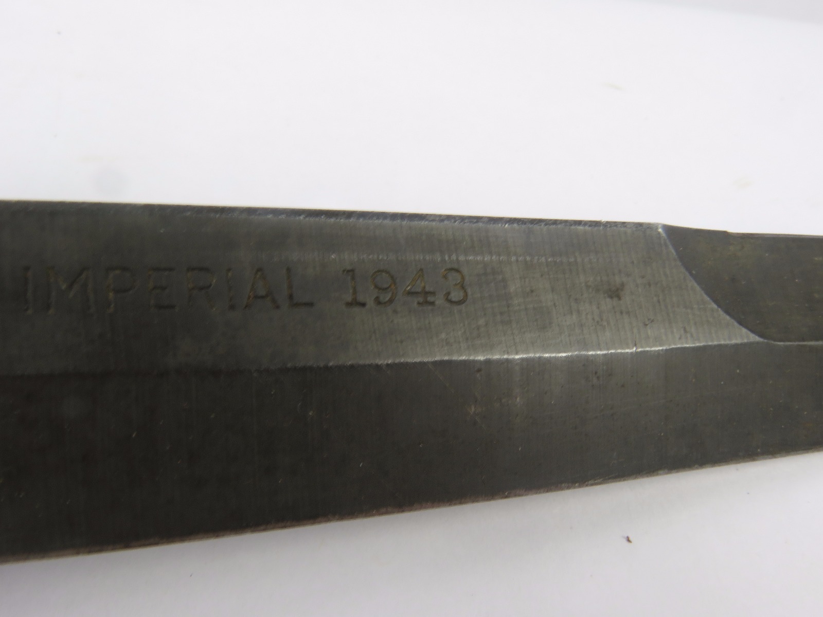 10/25/17 – This is an original WW2 production USM3 fighting knife with an original M6 leather scabbard. The M3 knife is maker stamped by Imperial and dated 1943 on the blade. This is the early, more scarce variation of blade dated knives known as the “first run” of production. The blade is in excellent condition with only minor surface wear. The handle is also excellent, and has black spacers on either side (another rare early feature). The rear spacer does have one hairline crack, but otherwise the spacers are excellent. The blade comes in a beautiful leather M6 scabbard that is maker stamped “L&C” as well as dated 1943. Guaranteed all original and authentic.