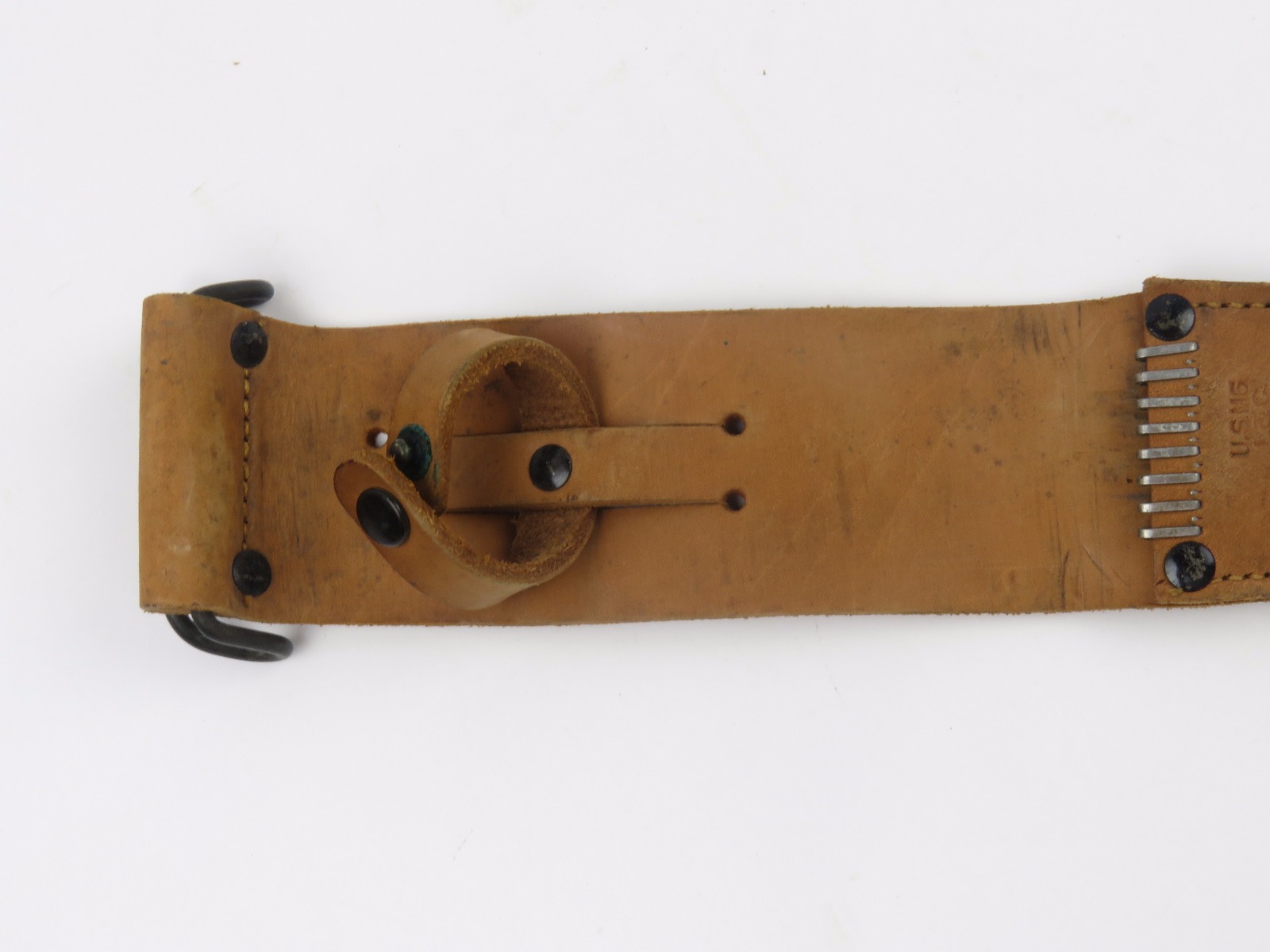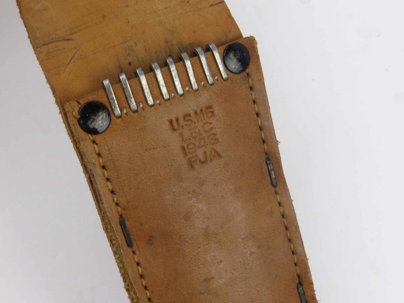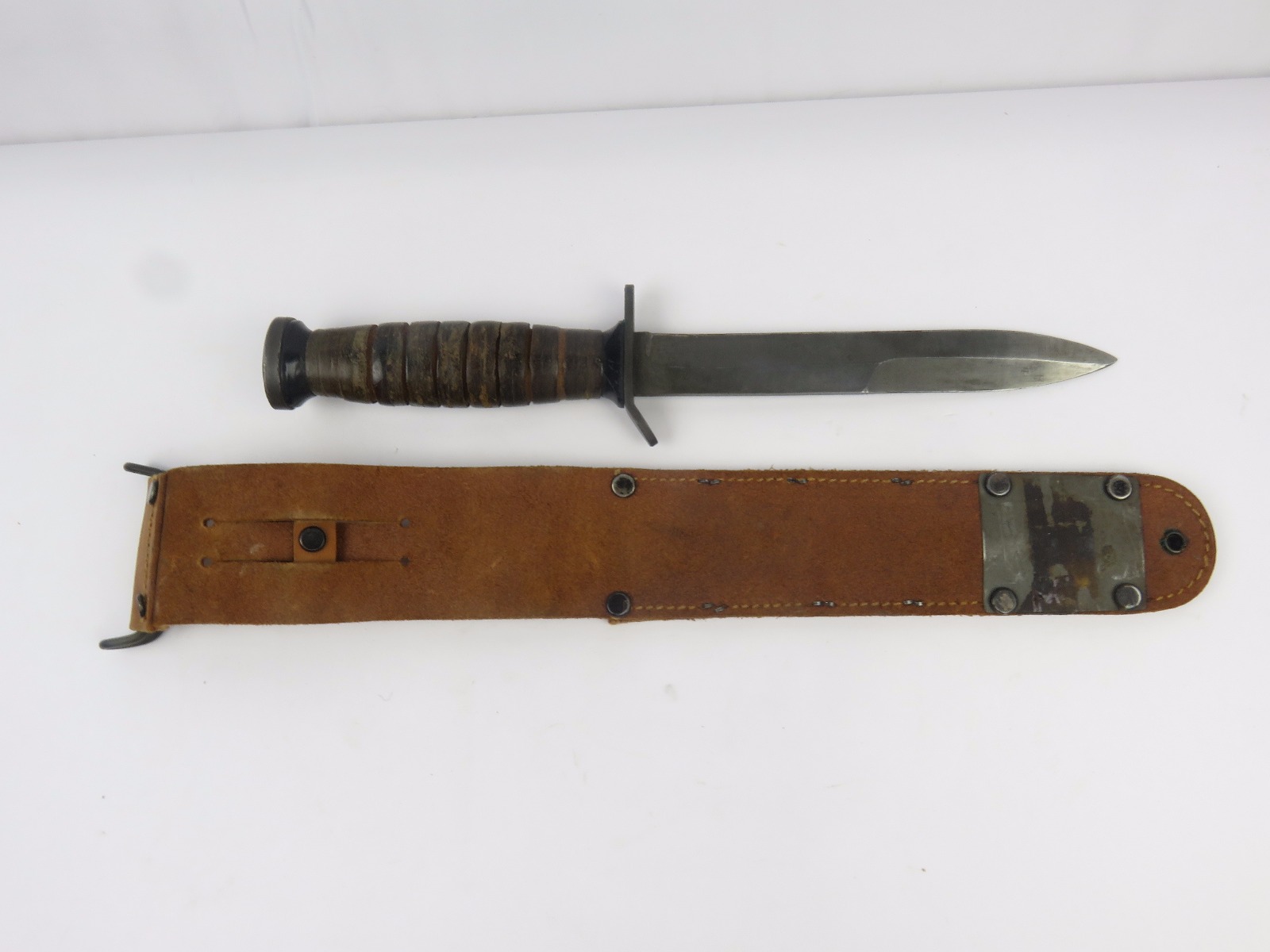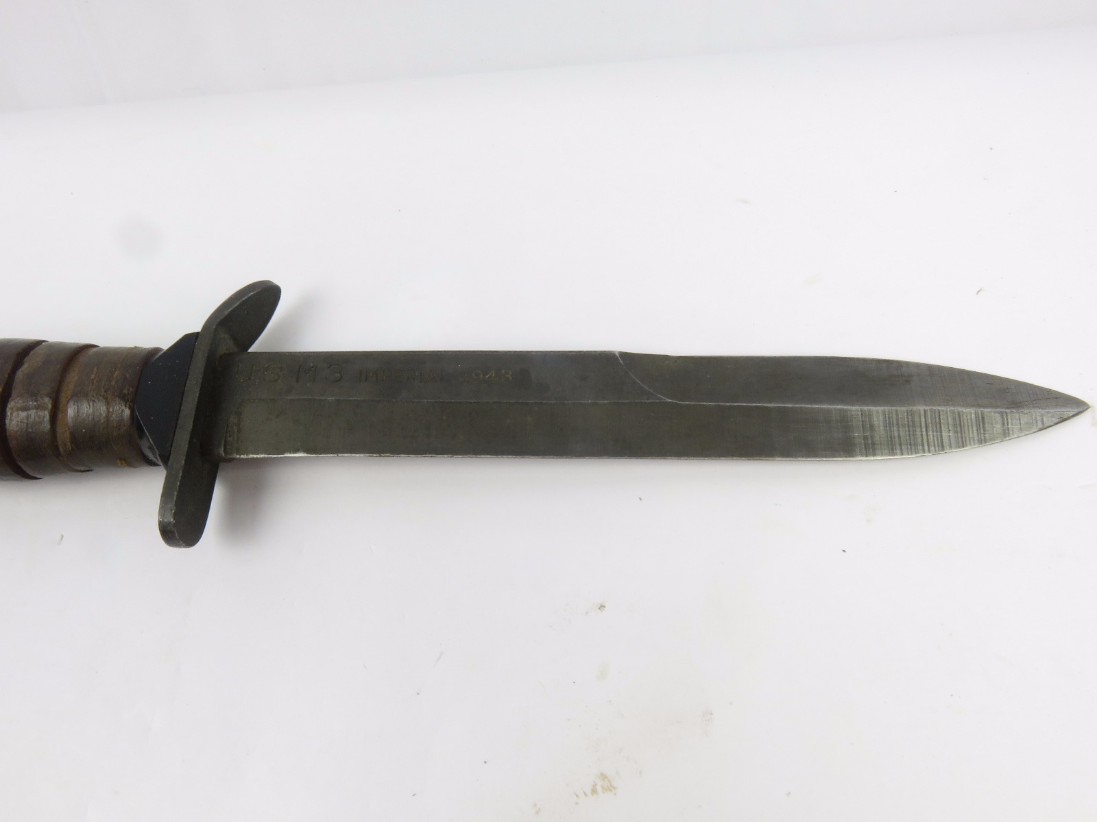 10/25/17 – This is an original WW2 production USM3 fighting knife with an original M6 leather scabbard. The M3 knife is maker stamped by Imperial and dated 1943 on the blade. This is the early, more scarce variation of blade dated knives known as the “first run” of production. The blade is in excellent condition with only minor surface wear. The handle is also excellent, and has black spacers on either side (another rare early feature). The rear spacer does have one hairline crack, but otherwise the spacers are excellent. The blade comes in a beautiful leather M6 scabbard that is maker stamped “L&C” as well as dated 1943. Guaranteed all original and authentic.