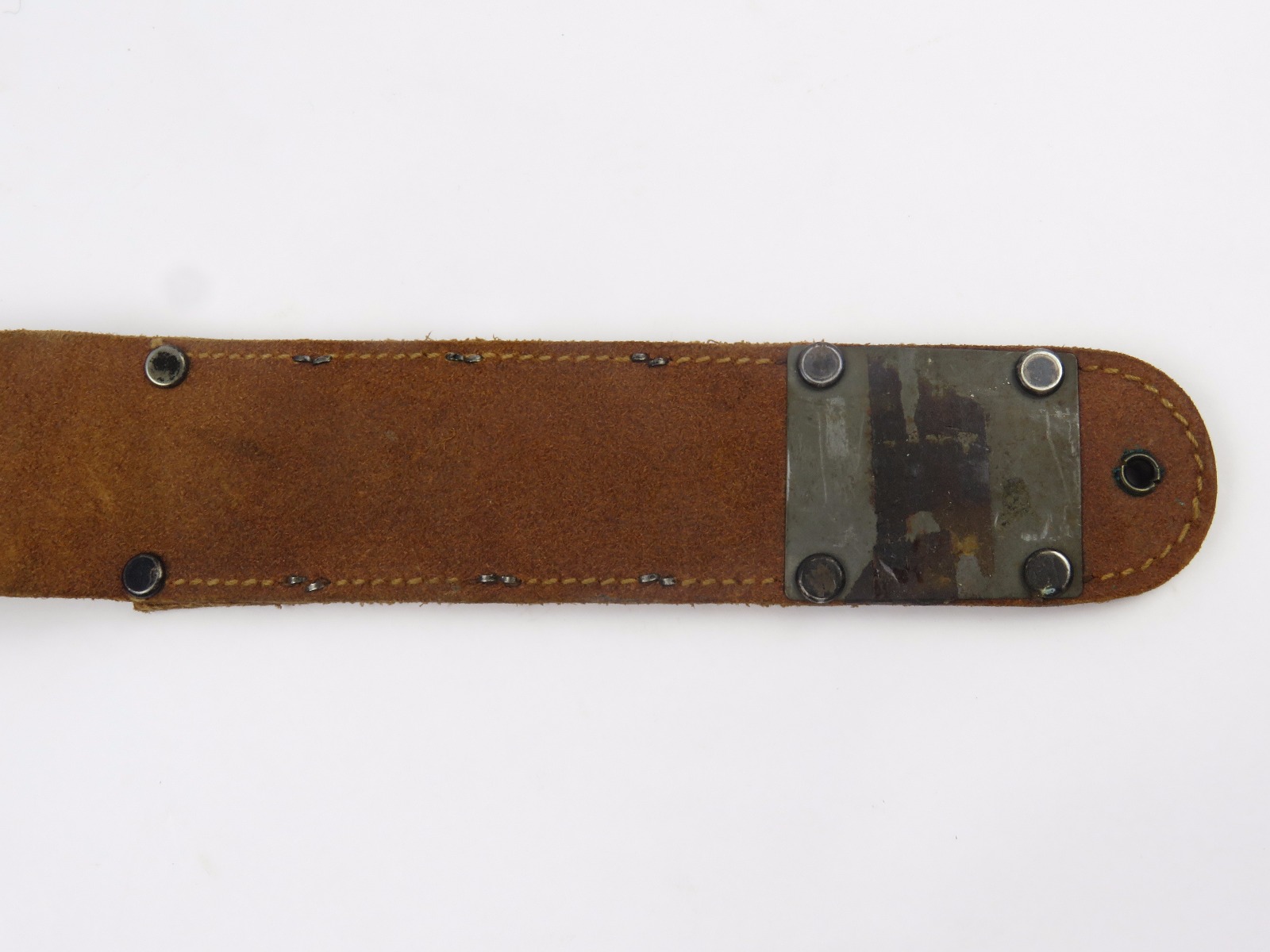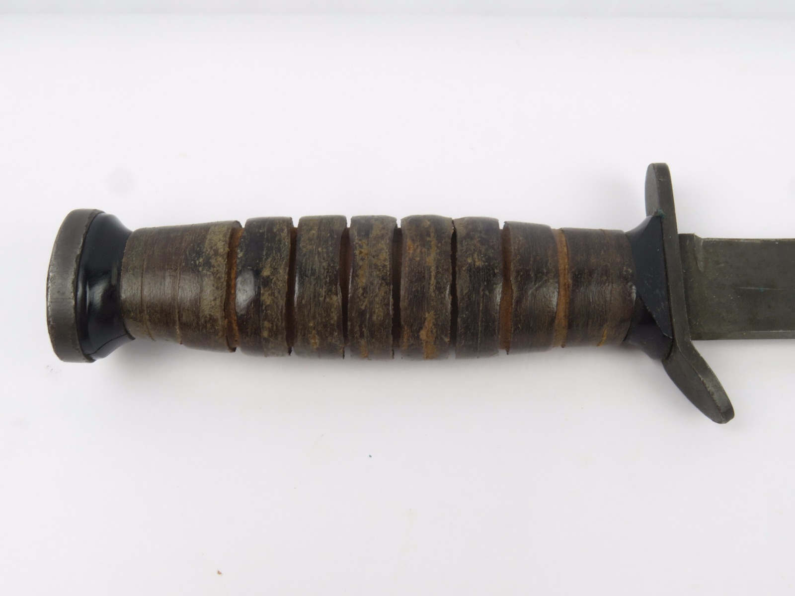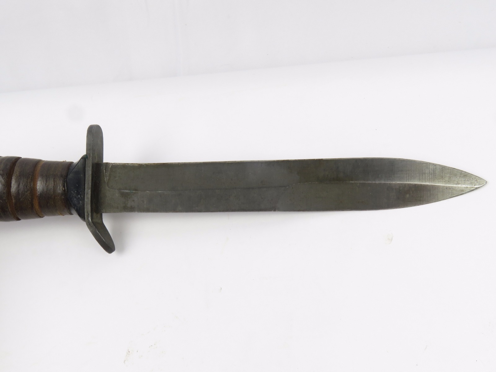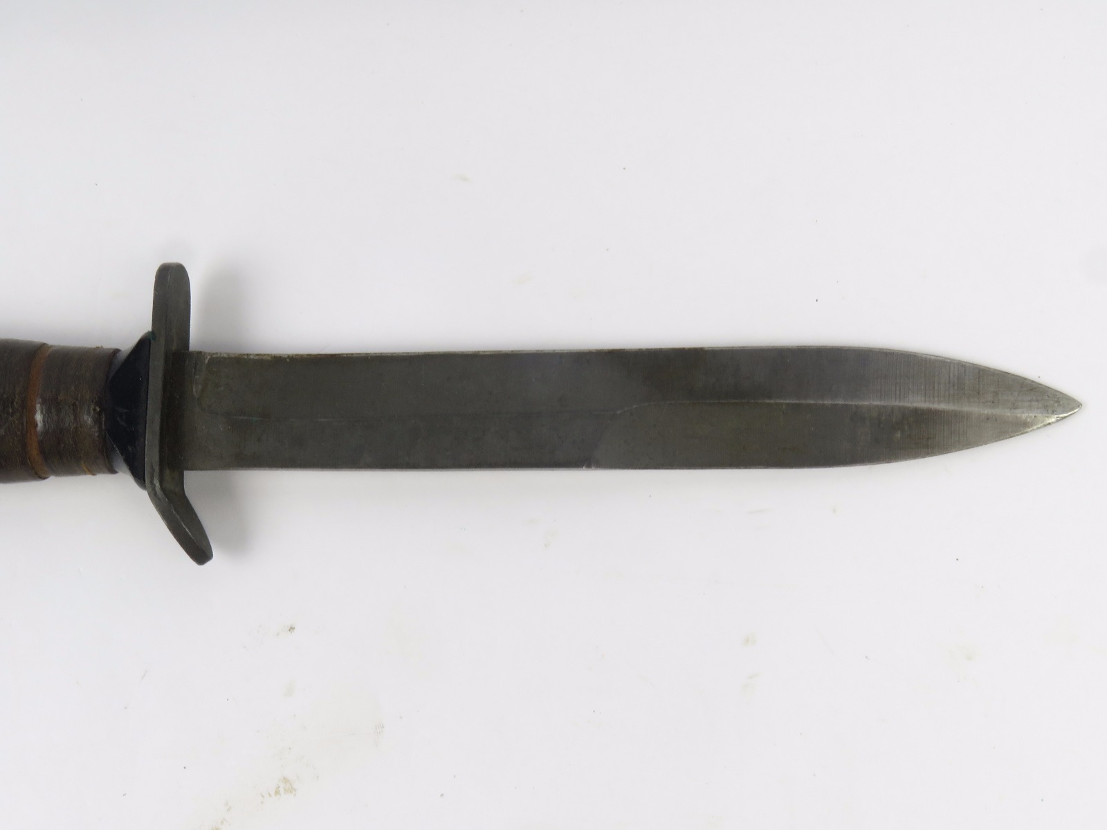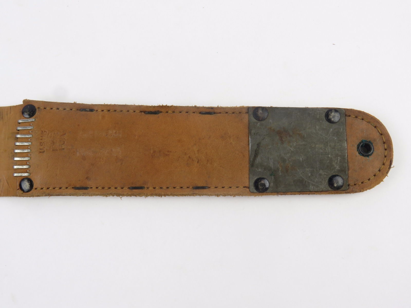 10/25/17 – This is an original WW2 production USM3 fighting knife with an original M6 leather scabbard. The M3 knife is maker stamped by Imperial and dated 1943 on the blade. This is the early, more scarce variation of blade dated knives known as the “first run” of production. The blade is in excellent condition with only minor surface wear. The handle is also excellent, and has black spacers on either side (another rare early feature). The rear spacer does have one hairline crack, but otherwise the spacers are excellent. The blade comes in a beautiful leather M6 scabbard that is maker stamped “L&C” as well as dated 1943. Guaranteed all original and authentic.