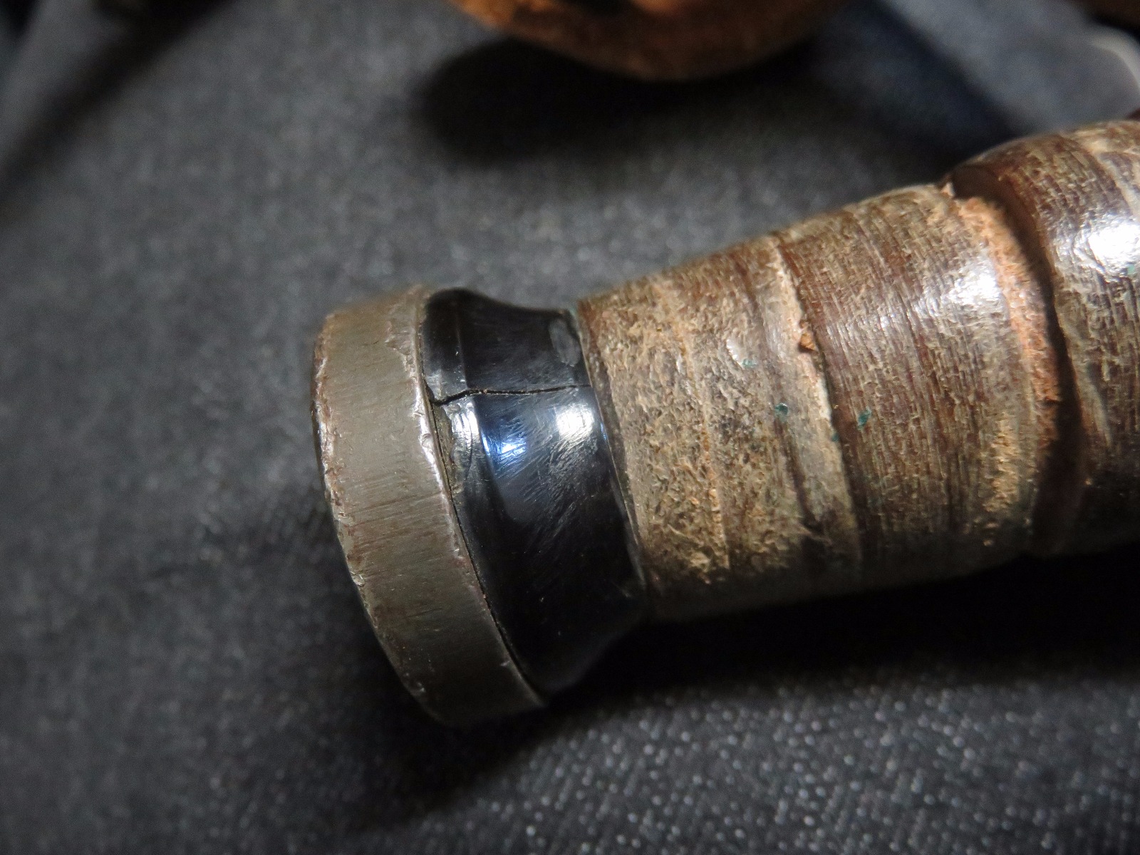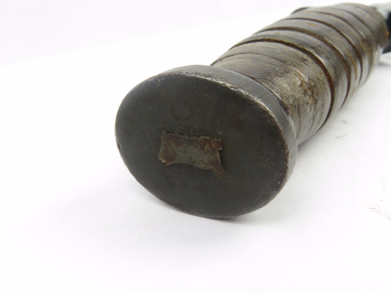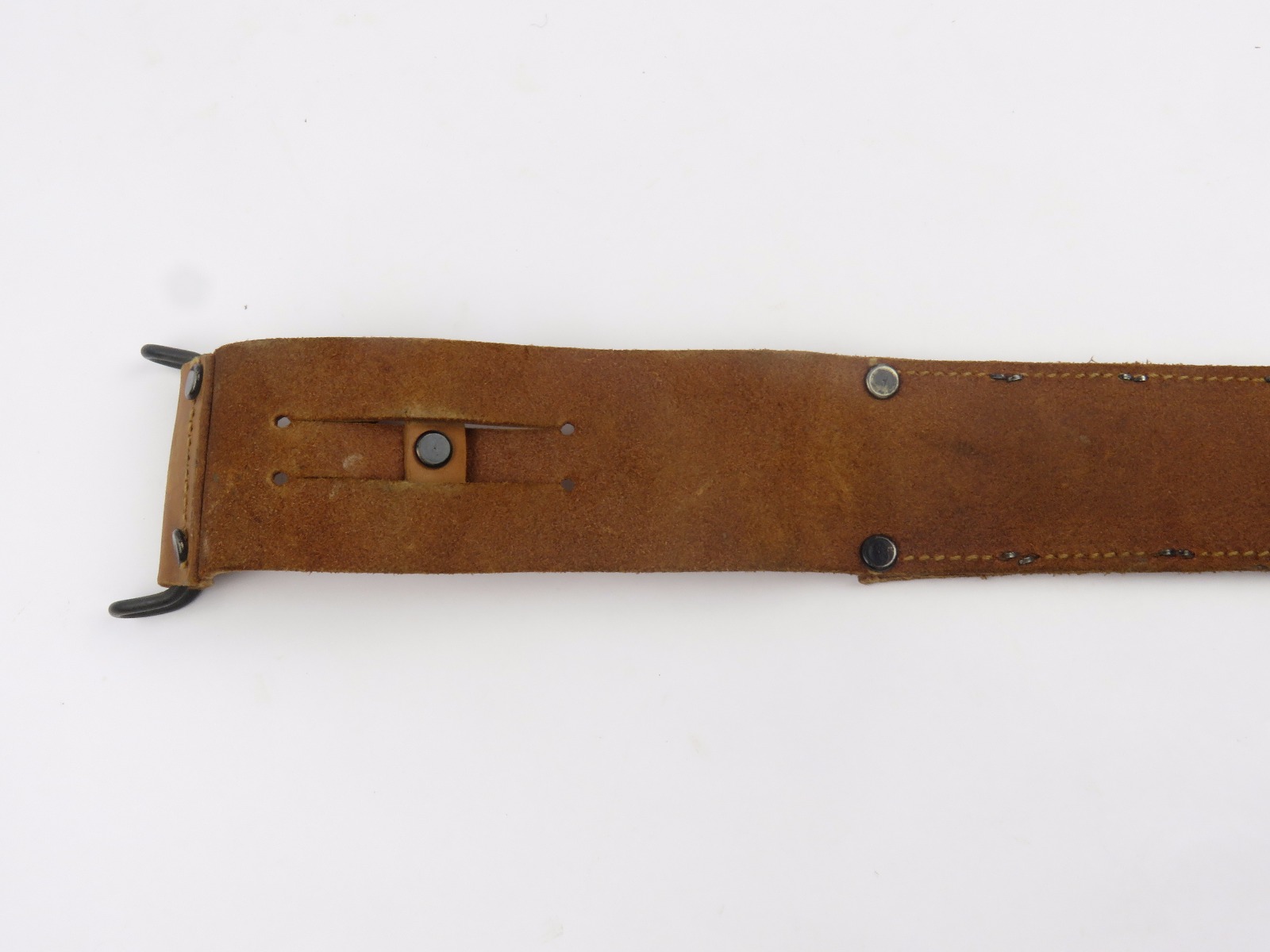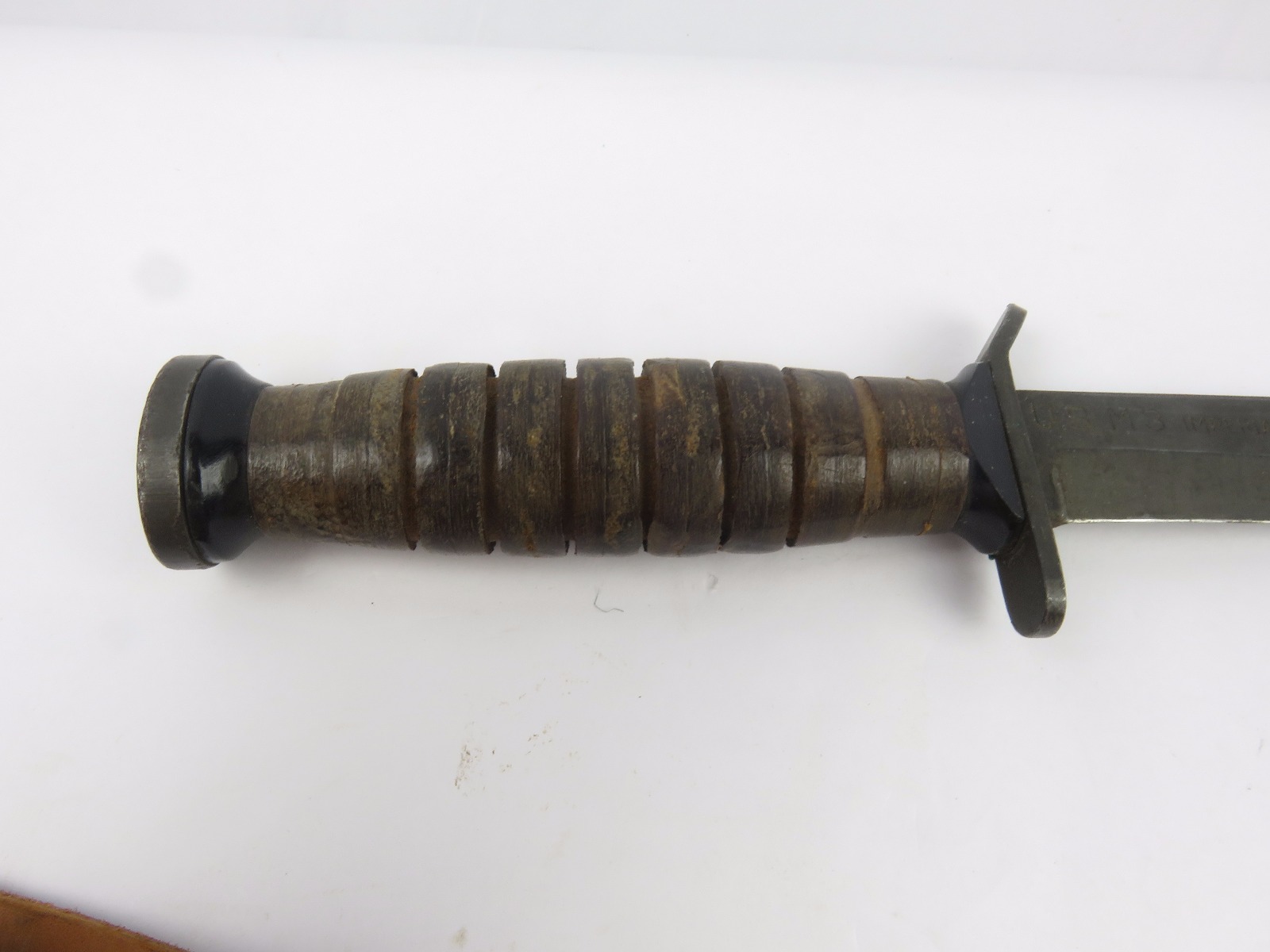 10/25/17 – This is an original WW2 production USM3 fighting knife with an original M6 leather scabbard. The M3 knife is maker stamped by Imperial and dated 1943 on the blade. This is the early, more scarce variation of blade dated knives known as the “first run” of production. The blade is in excellent condition with only minor surface wear. The handle is also excellent, and has black spacers on either side (another rare early feature). The rear spacer does have one hairline crack, but otherwise the spacers are excellent. The blade comes in a beautiful leather M6 scabbard that is maker stamped “L&C” as well as dated 1943. Guaranteed all original and authentic.