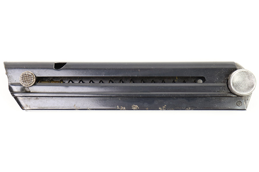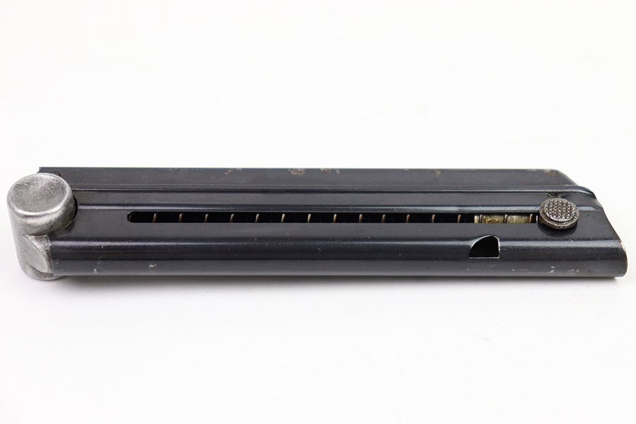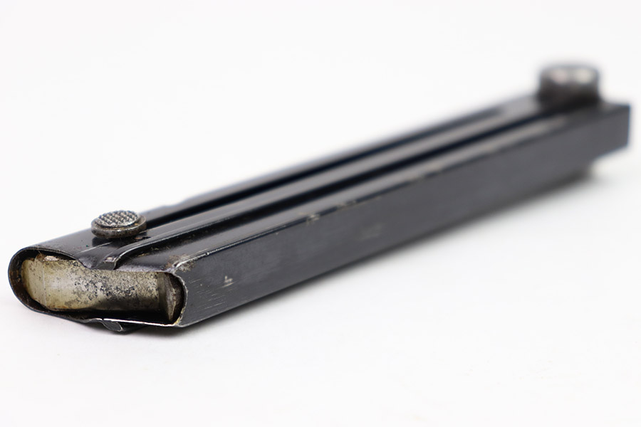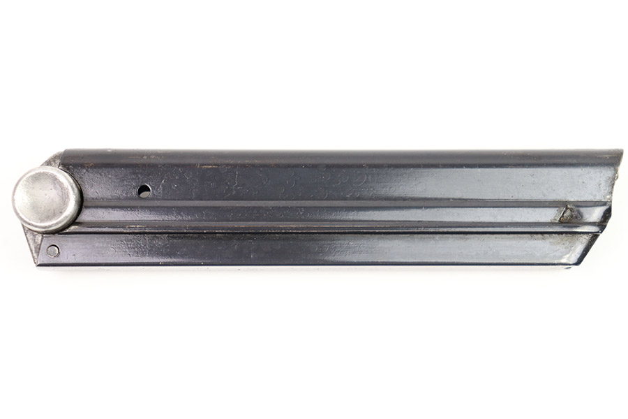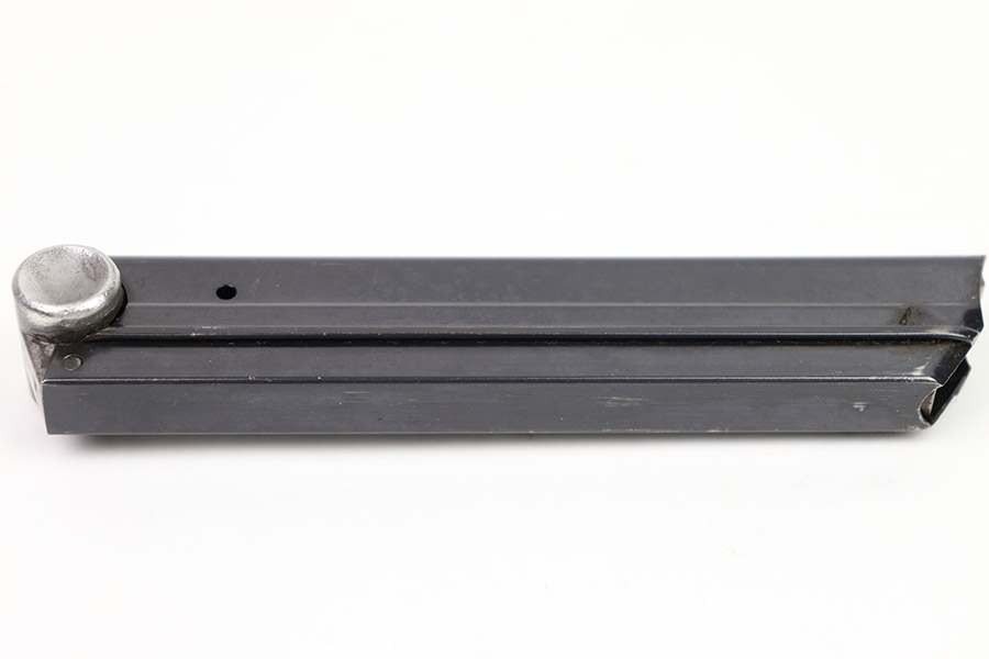 10/31/22 – This is a great example of an original Mauser P.08 Luger magazine from WW2. The blued tube has retained a majority of its finish but there is some splotchy discoloration/patina on the left-hand side of the tube and some oxidation on the right edge of the tube’s spine. There are also small patches of pinpricking on the follower and magazine bottom. The bottom is not serialized, but marked with an eagle 655 proof mark. Extremely desirable variation as it shows no evidence of ever being serial number stamped. The spring is strong and functional.