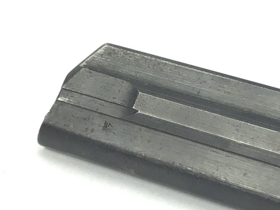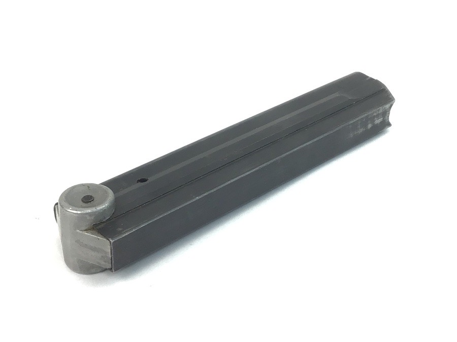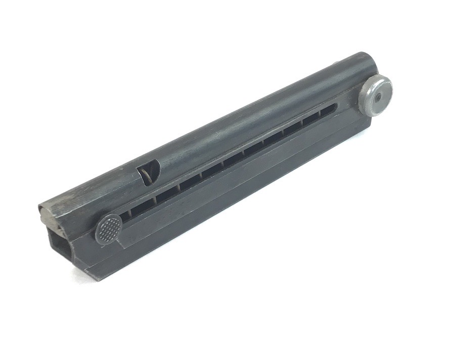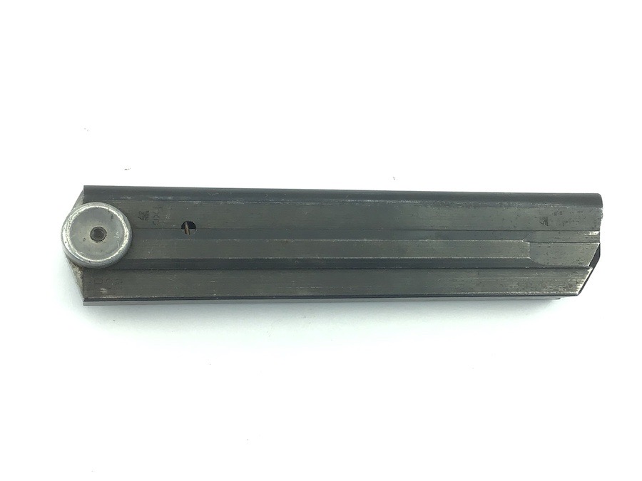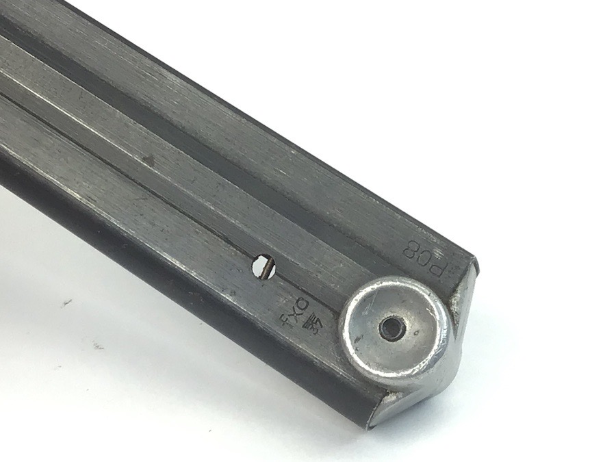 3/13/23 – This is an original WW2 production luger magazine with an aluminum base that has no serial number. The base does not show evidence of grinding or alteration, making this a highly desirable variation (“matching” any pistol). The magazine is in excellent condition overall with no major flaws, rust , or pitting. The side of the tube is “fxo” “P.08”. FXO is a code for Haenel, who made high quality magazines during WW2.