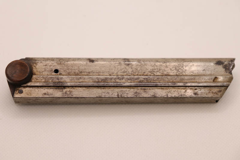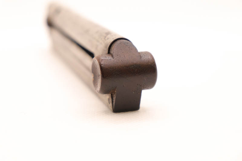 10/17/20 – This is a WW1 era wood bottom Luger magazine. This mag has a blank (not marked/stamped) wood base. Most likely made for a commercial luger. The body shows signs of heavy wear and one of the ears is lightly chipped. However, it is still fully functional with a strong spring.