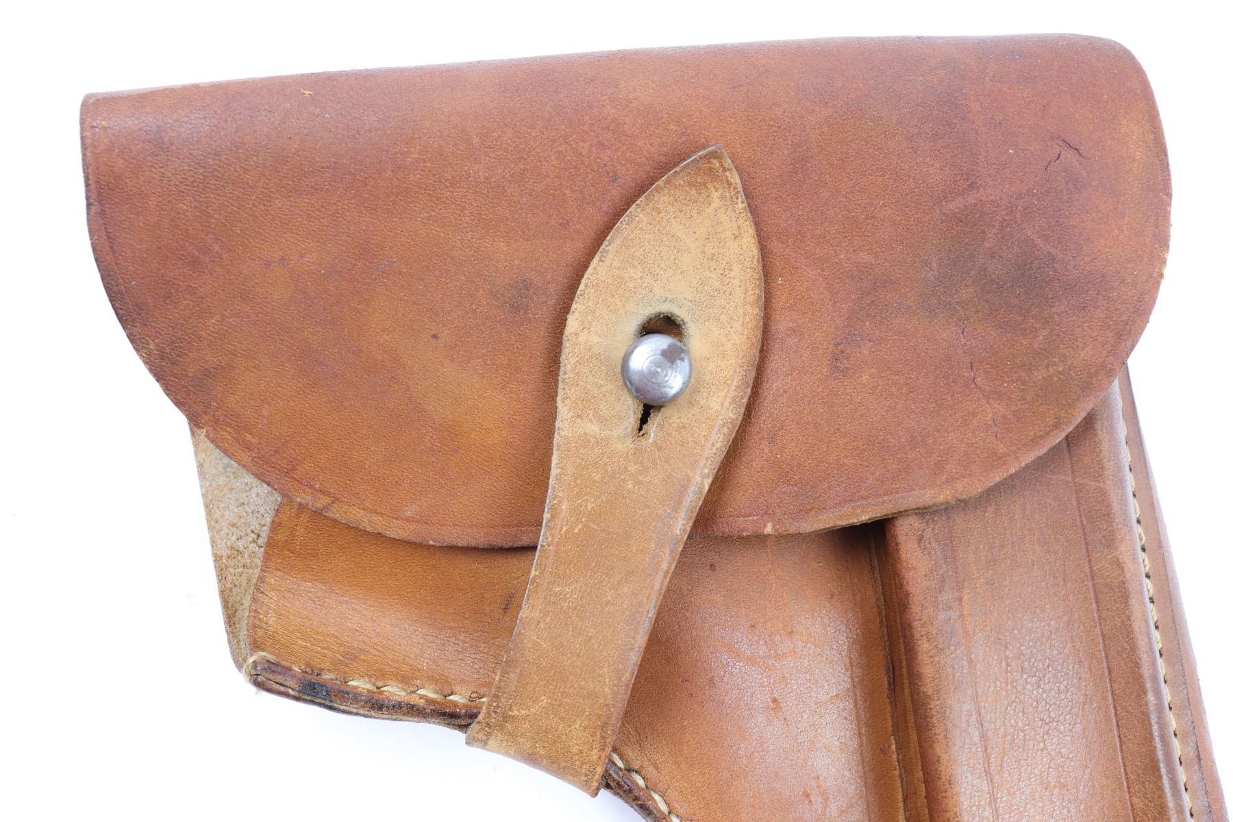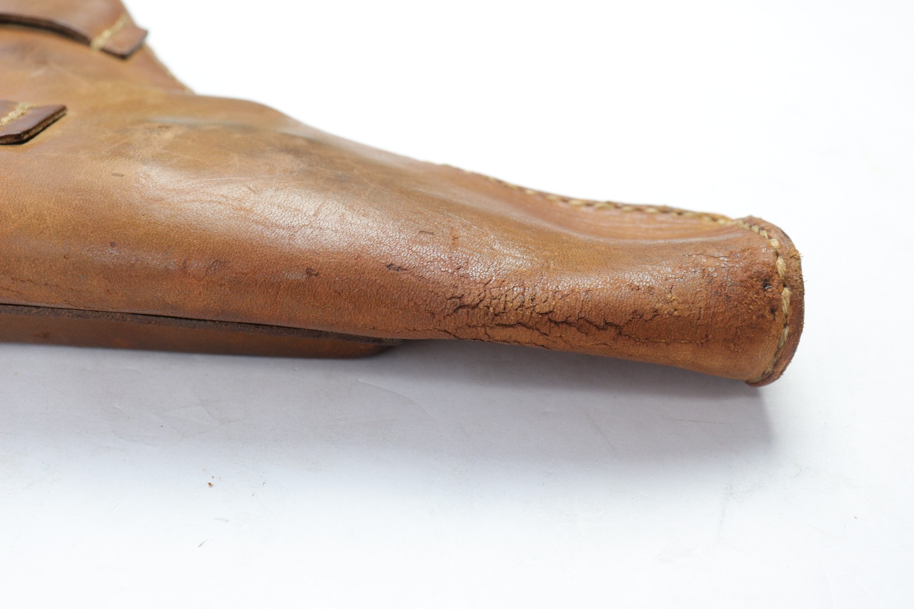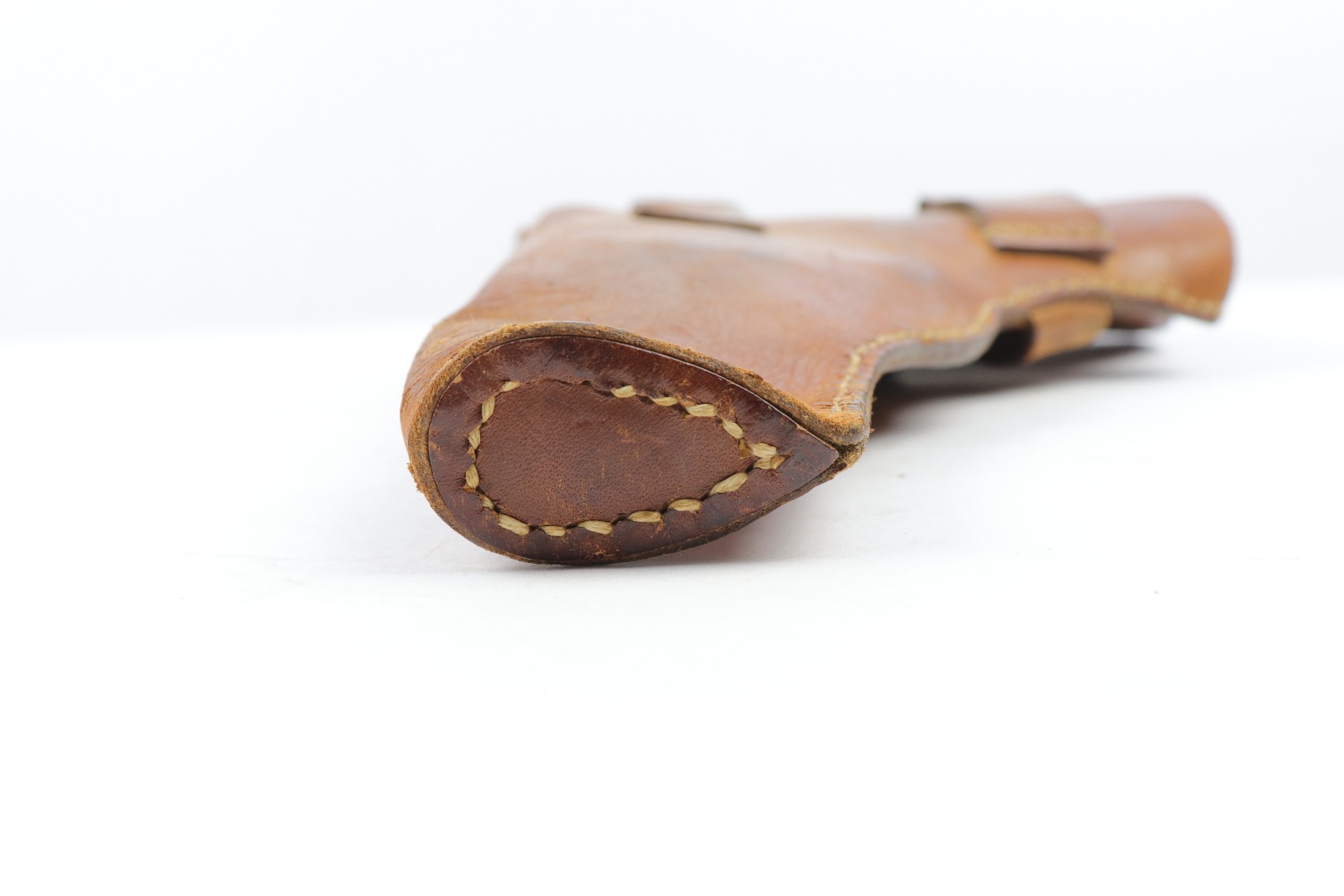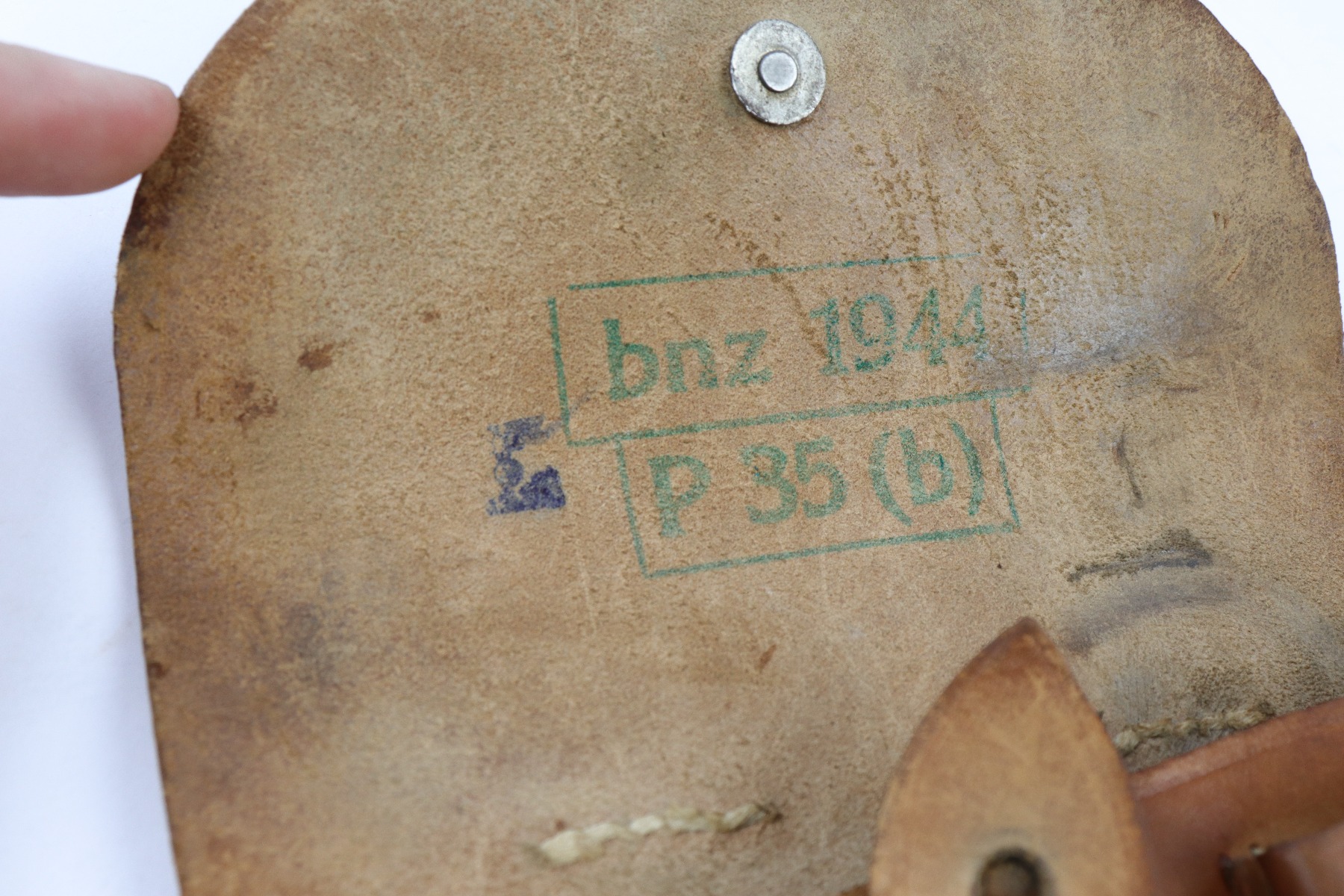 4/10/18 – This is an original BNZ Radom holster from the end of WW2. The holster has light brown leather with some cracking near the toe. There is also light wrinkling on the magazine pouch and a light crack on the top area of leather. The leather feels used and pliable overall, but is clean and has a nice interior ink stamp. There is also an interior waffen proof stamp – see photos. The stitching is all original and in tact. Guaranteed original and authentic.