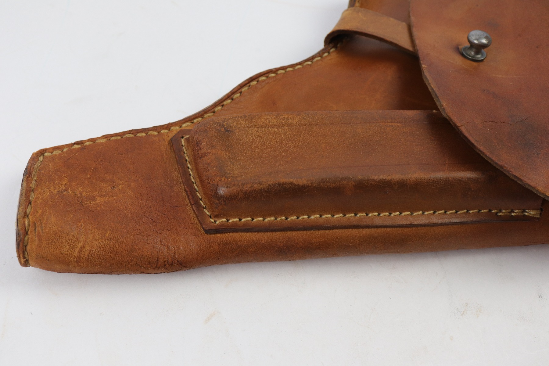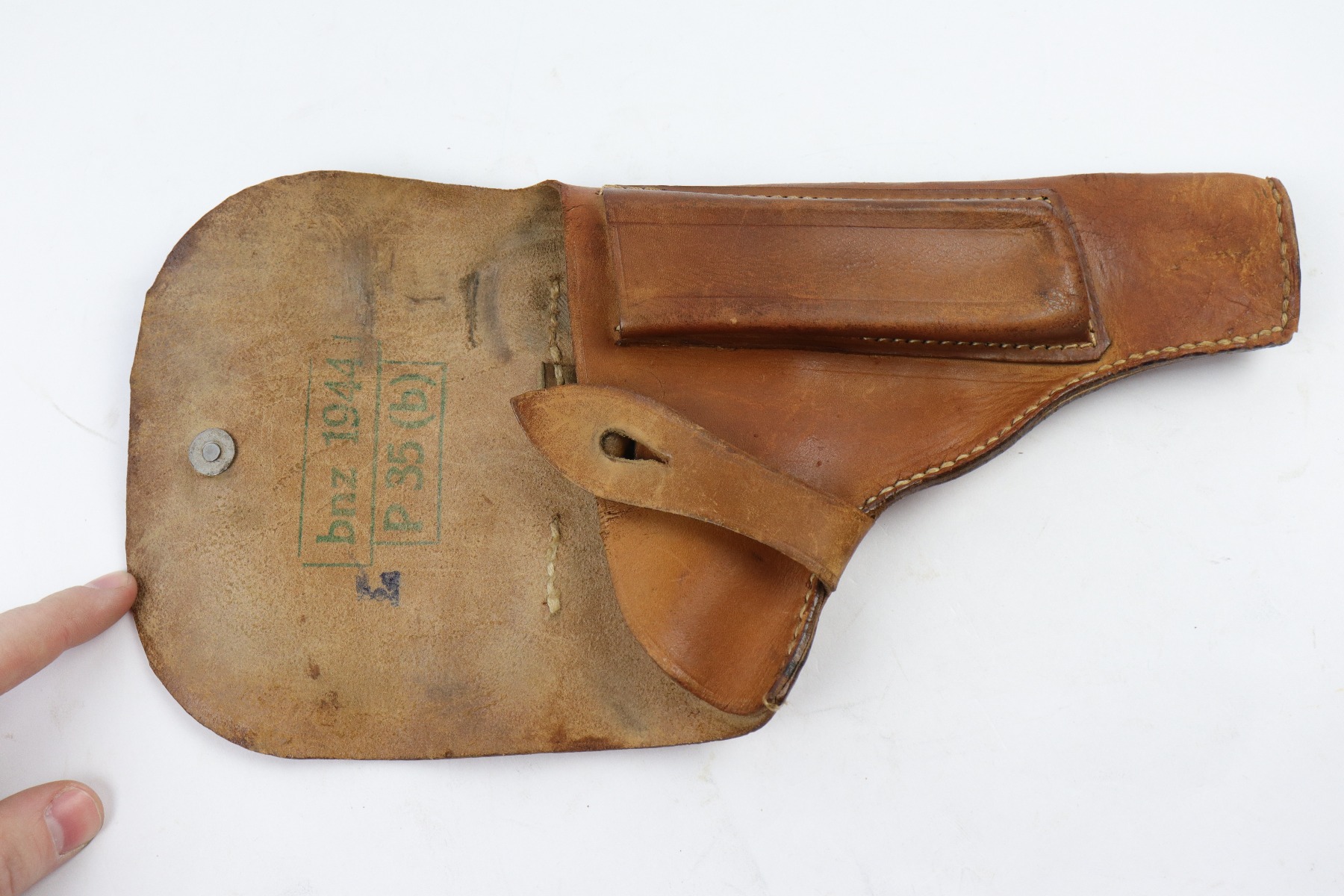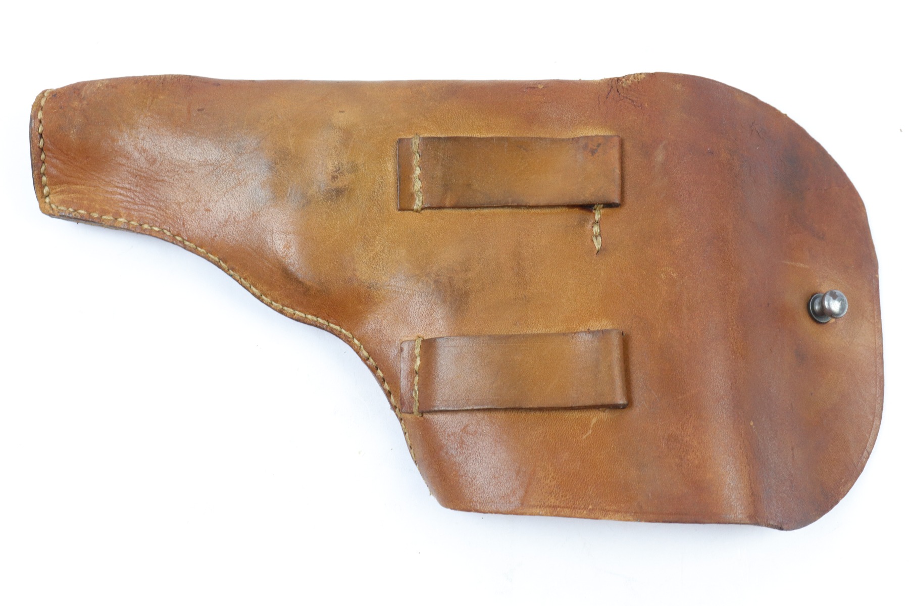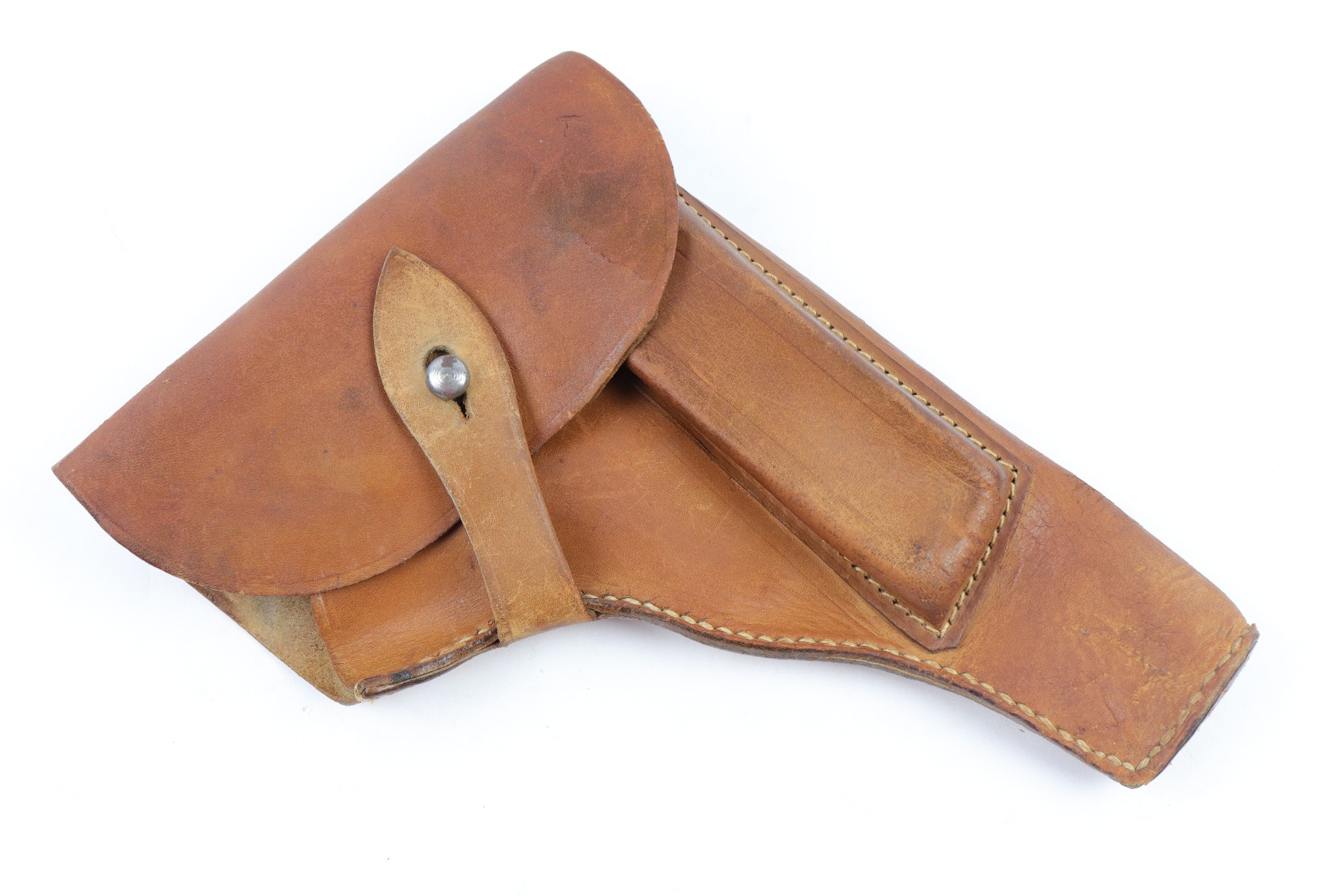 4/10/18 – This is an original BNZ Radom holster from the end of WW2. The holster has light brown leather with some cracking near the toe. There is also light wrinkling on the magazine pouch and a light crack on the top area of leather. The leather feels used and pliable overall, but is clean and has a nice interior ink stamp. There is also an interior waffen proof stamp – see photos. The stitching is all original and in tact. Guaranteed original and authentic.