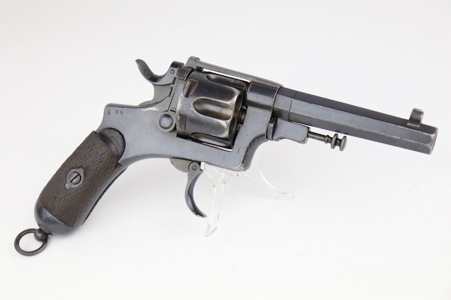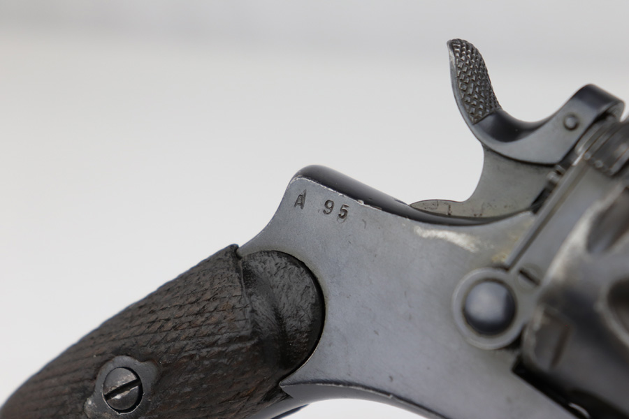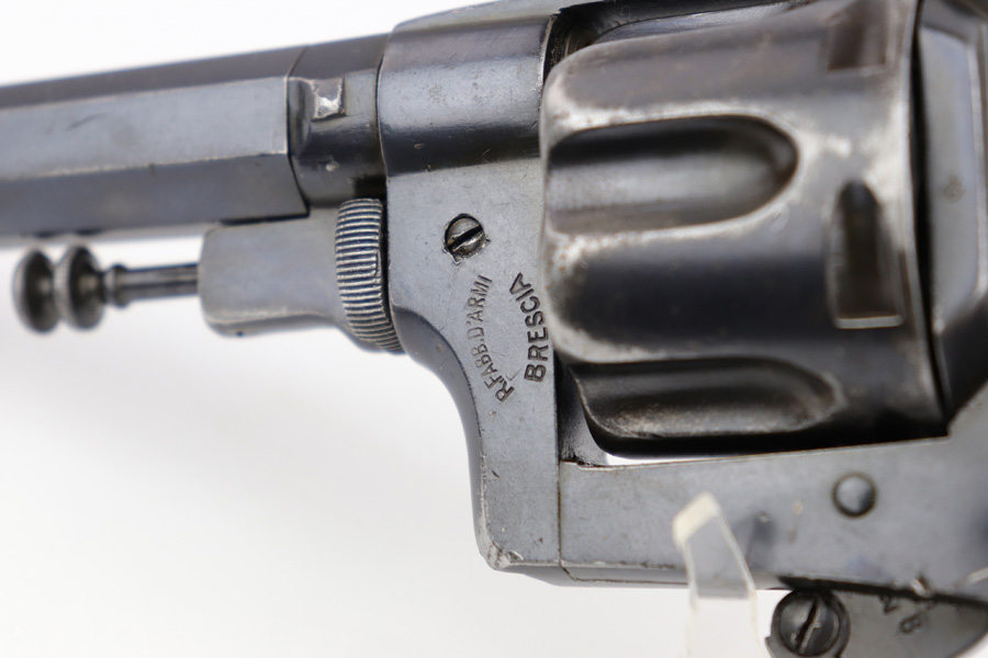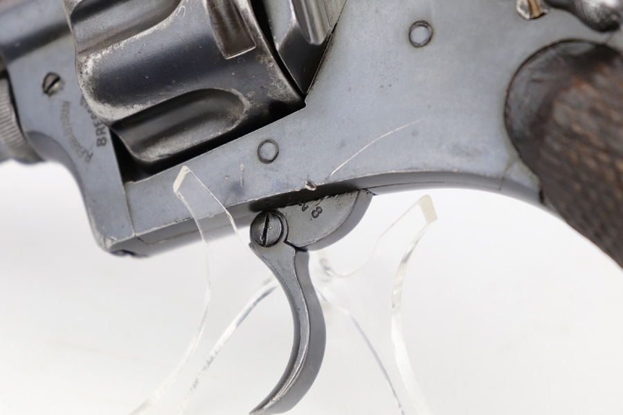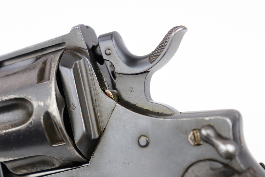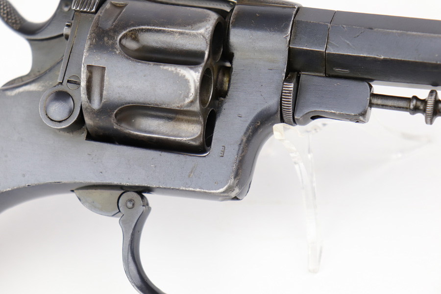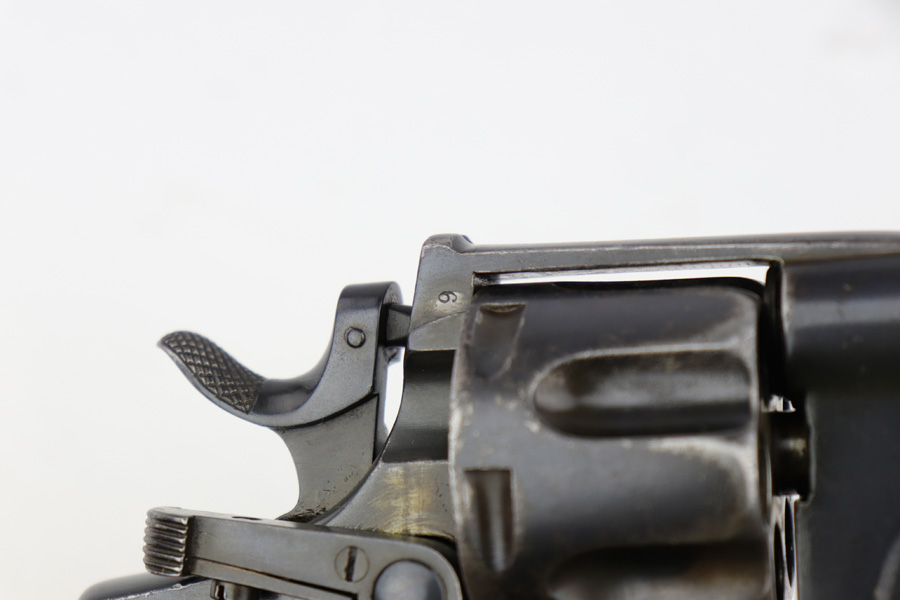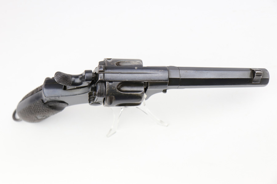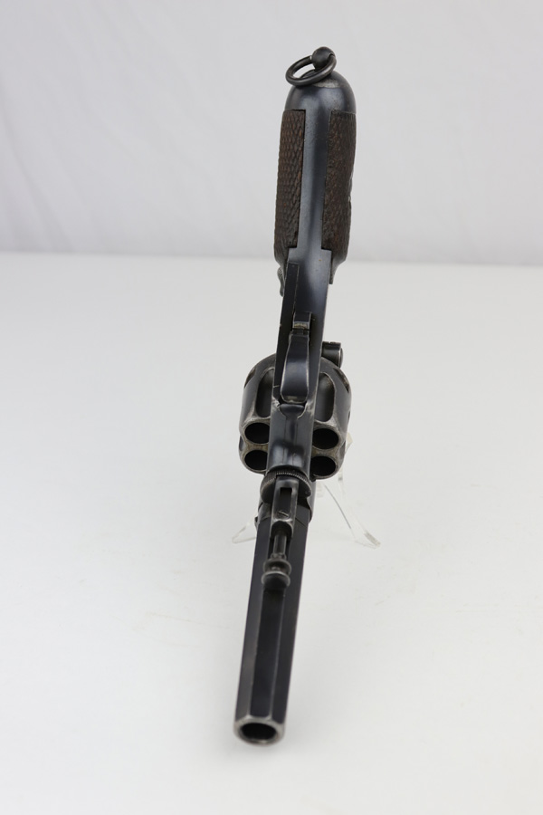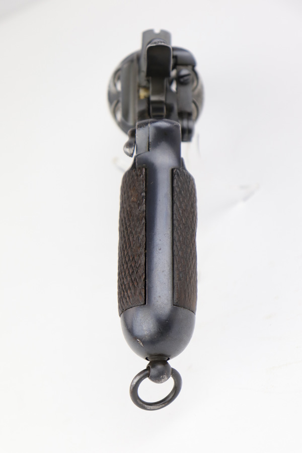 6/10/19 – This is an original antique revolver made by Bodeo, known as the model 1889. The revolver is mechanically sound and all original with a tight action and excellent lockup. The bore is very nice as well 8.5/10 with some minor residue and signs of use but very clean given the gun’s age. The finish is about 93-95% overall with some bluing loss on the edges of the barrel, and bluing loss on the cylinder as well. No rust or pitting. Nice original wood grips.