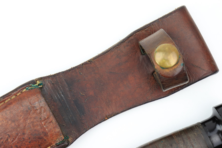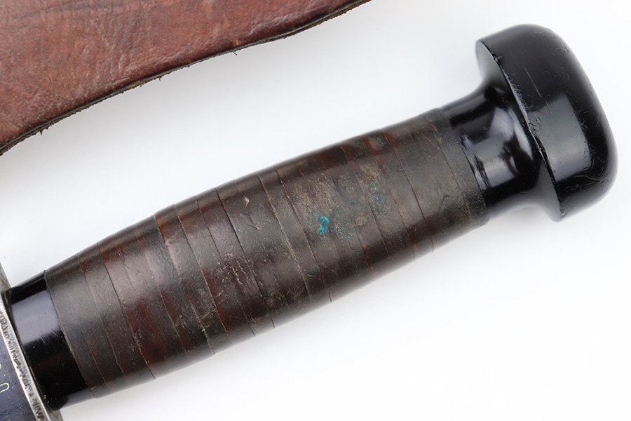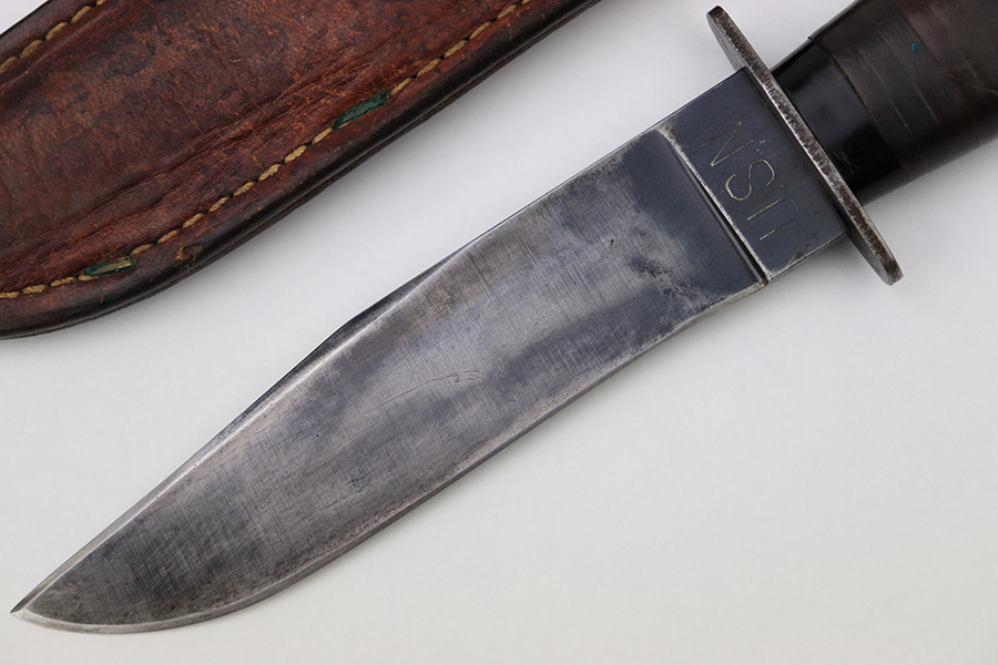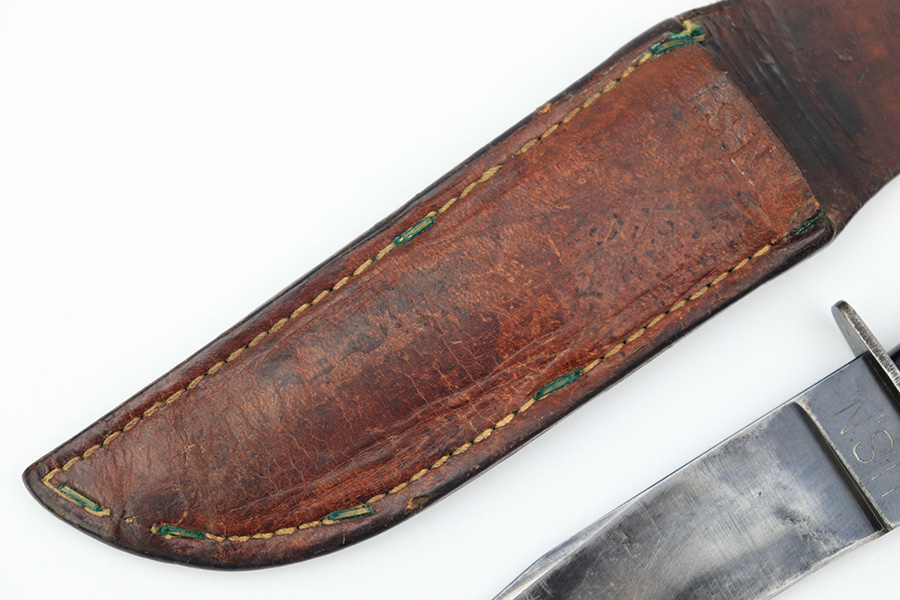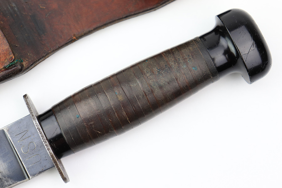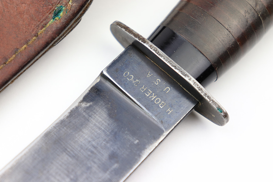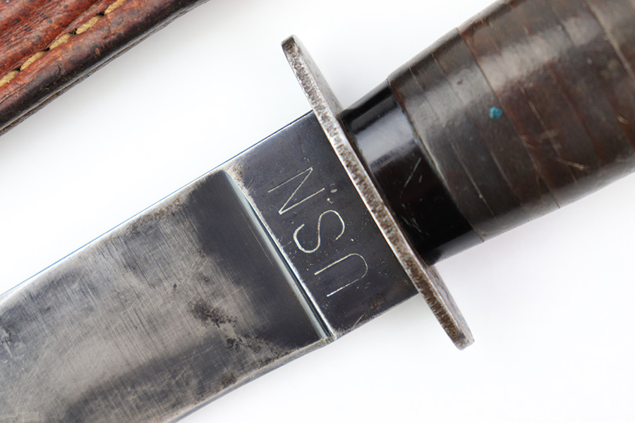 7/7/22 – This is an original, fairly scarce variation Mark 1 USN knife by Boker. The blade is maker stamped on the ricasso, as well as USN stamped. The original finish is thinned throughout but still present as shown. No signs of sharpening but there are mild use scratches and normal signs of use wear. the handle has black plastic spacers that are indicative of later wartime production. Comes with a USN stamped leather scabbard.