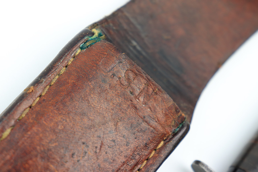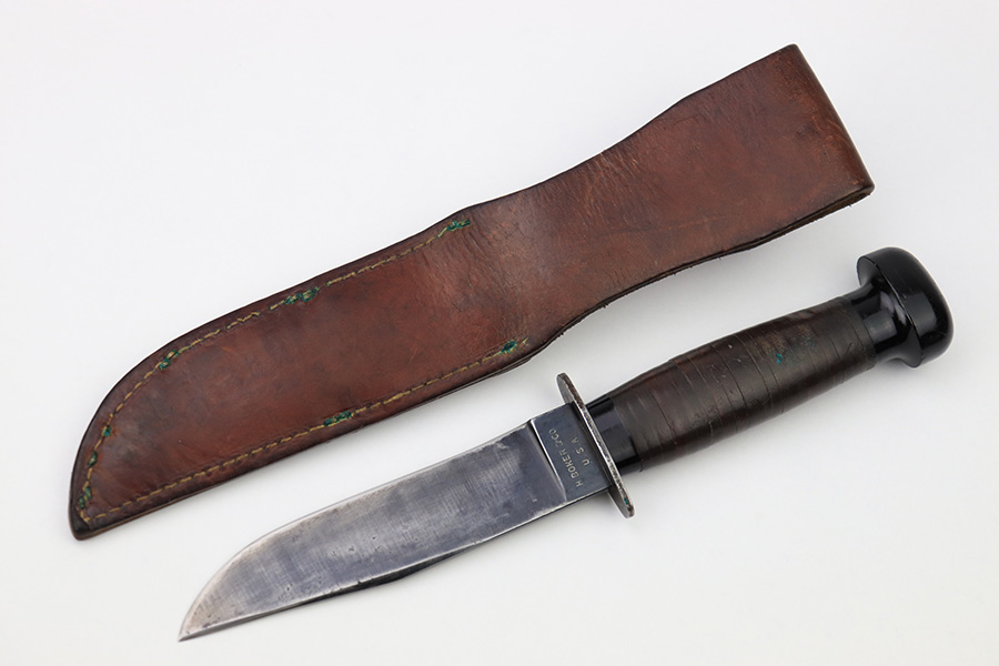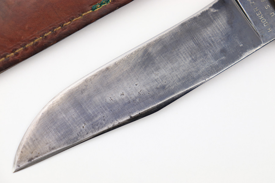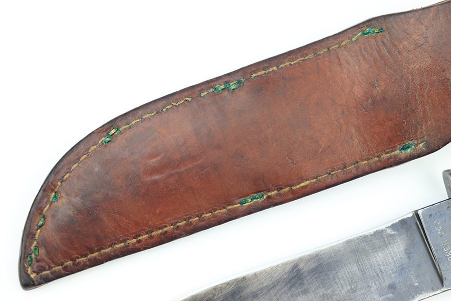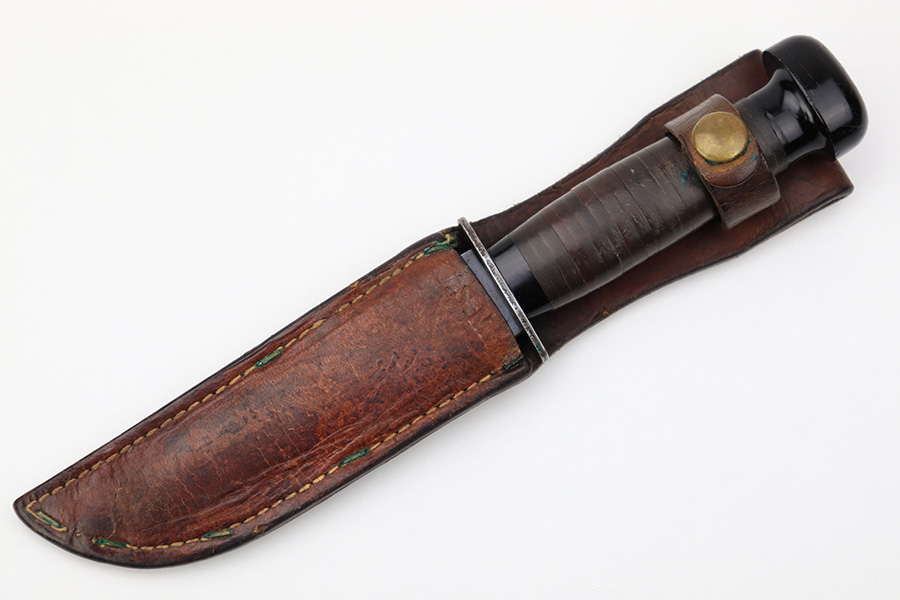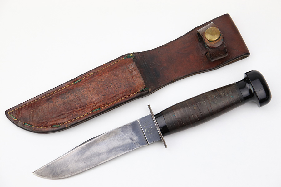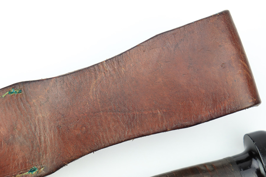 7/7/22 – This is an original, fairly scarce variation Mark 1 USN knife by Boker. The blade is maker stamped on the ricasso, as well as USN stamped. The original finish is thinned throughout but still present as shown. No signs of sharpening but there are mild use scratches and normal signs of use wear. the handle has black plastic spacers that are indicative of later wartime production. Comes with a USN stamped leather scabbard.