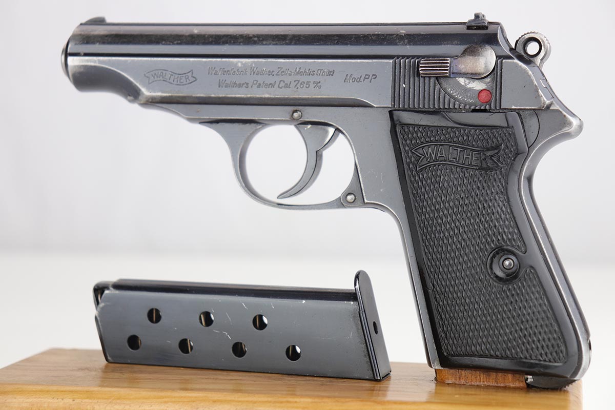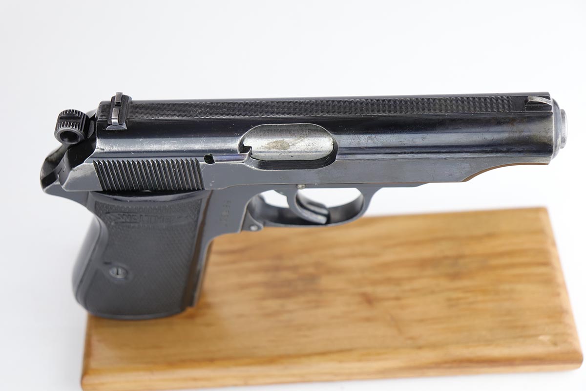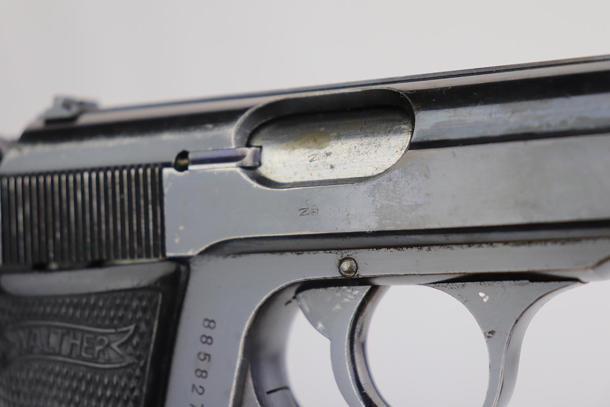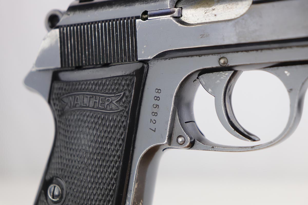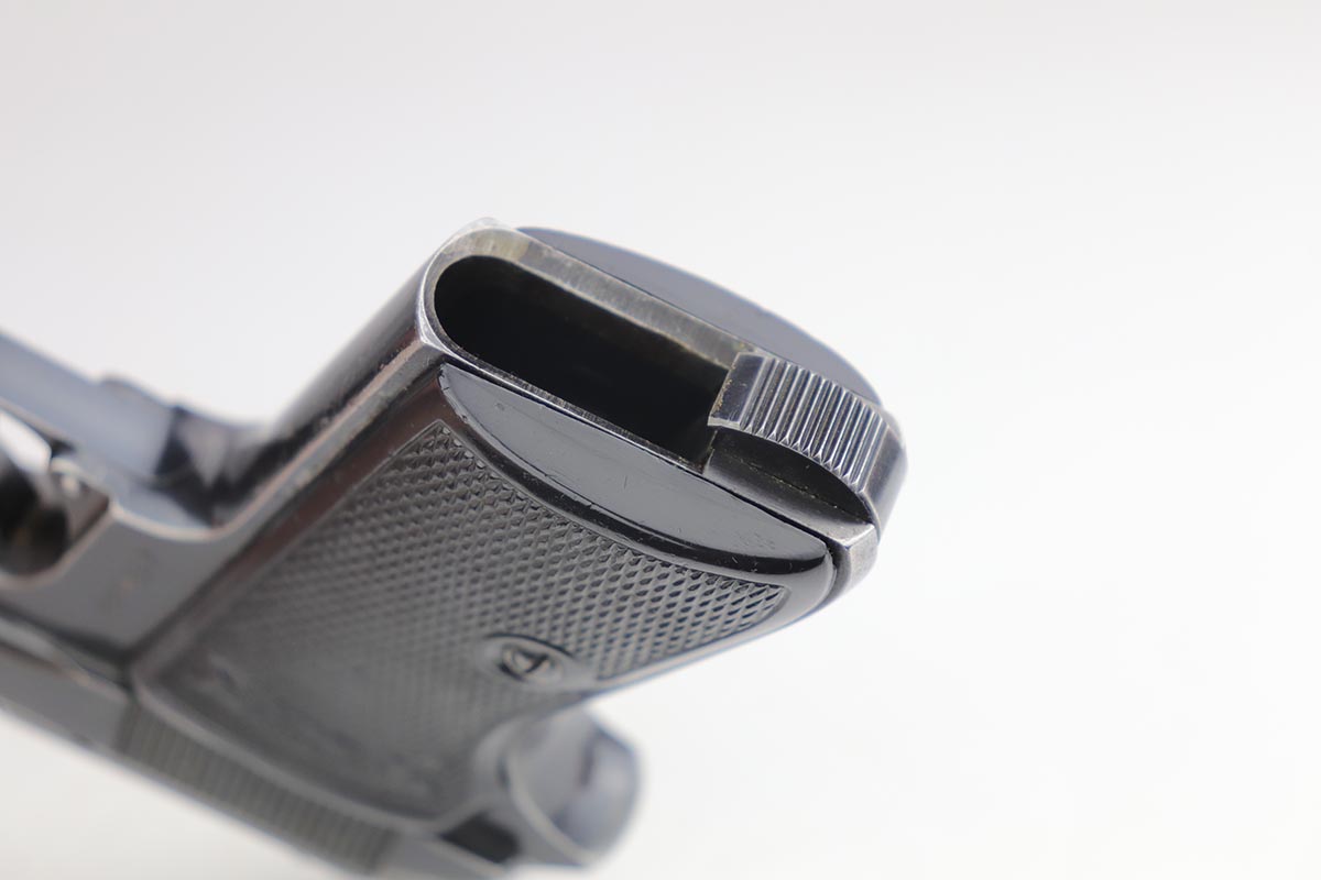 9/16/19 – This is a very rare Walther PP in 7.65mm with a bottom release for the magazine. It is an early variation at the start of the police PDM’s. We believe that pistols like these, sometimes referred to as “BMR” PP’s, are an overrun of the PDM production in the Walther factory. The pistol has a fluted barrel and 90 degree safety. The pistol shows some honest holster wear and is about 85-90%. No rust or pitting. The wear is general thinning, edge wear, and strap wear. All parts are matching and it has a very nice bore that rates 9/10 overall. The magazine is correct and does not have the notch for bottom release, but still period correct.
