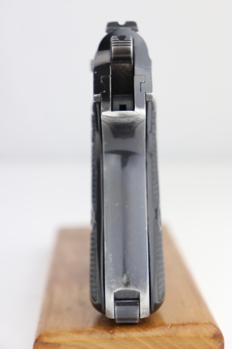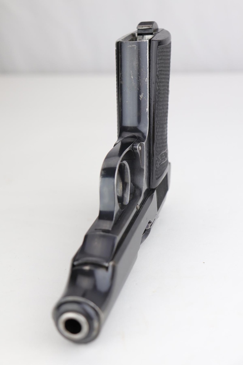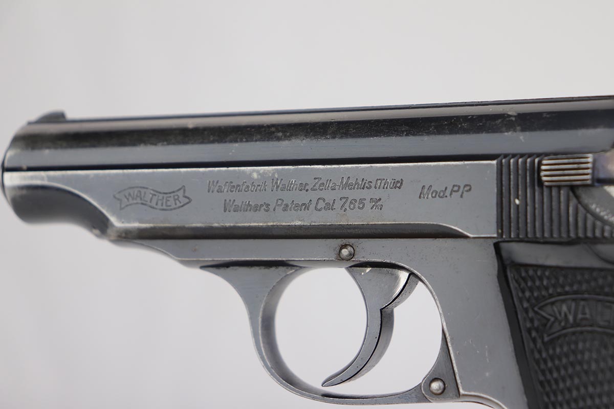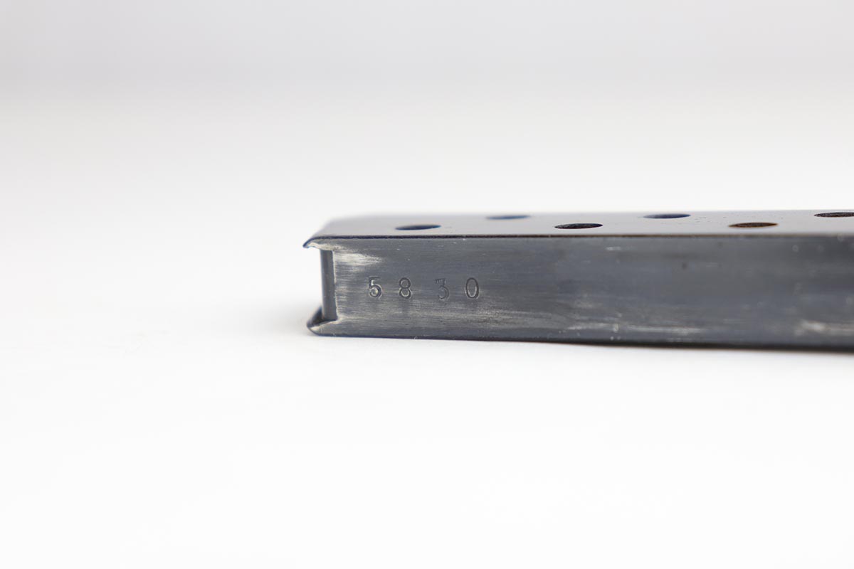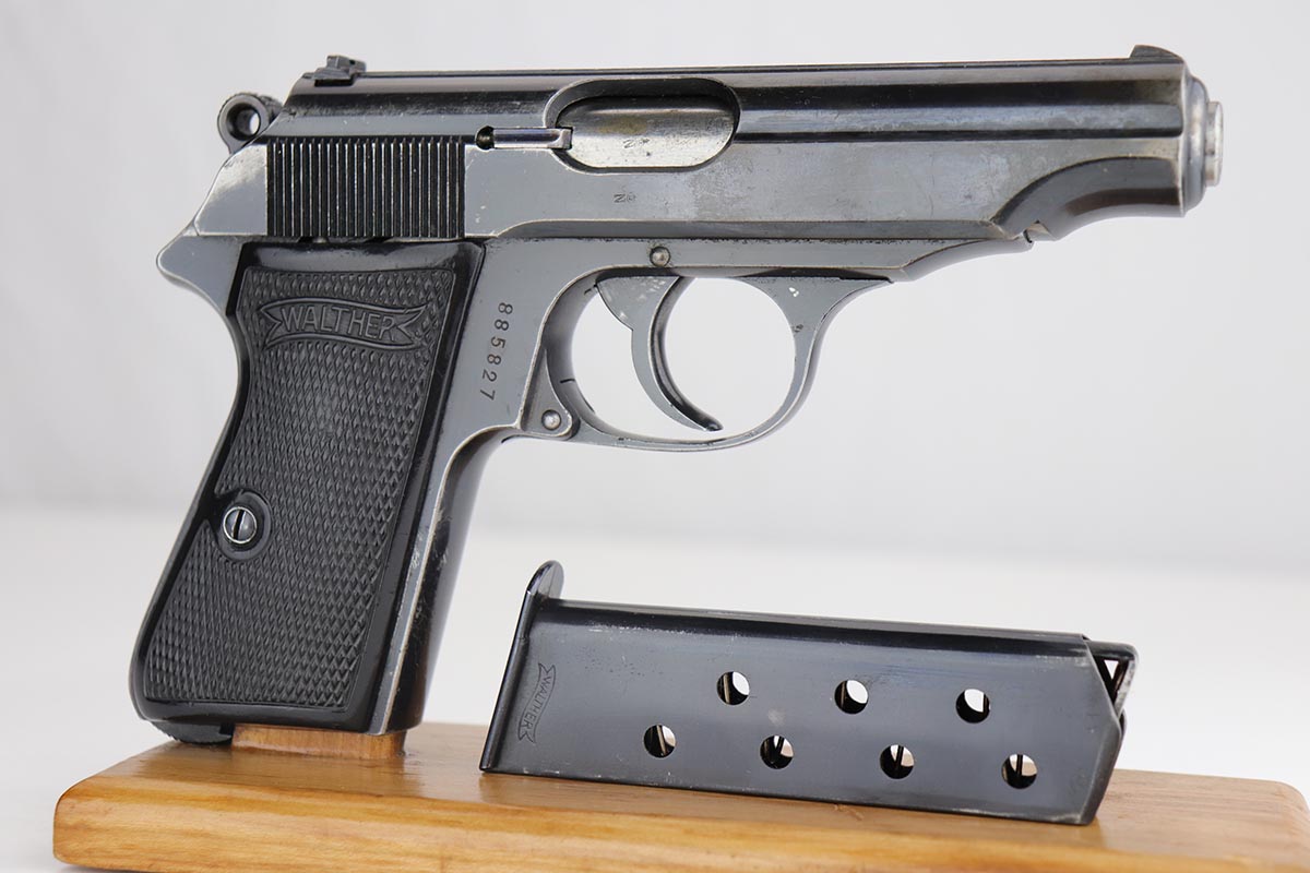 9/16/19 – This is a very rare Walther PP in 7.65mm with a bottom release for the magazine. It is an early variation at the start of the police PDM’s. We believe that pistols like these, sometimes referred to as “BMR” PP’s, are an overrun of the PDM production in the Walther factory. The pistol has a fluted barrel and 90 degree safety. The pistol shows some honest holster wear and is about 85-90%. No rust or pitting. The wear is general thinning, edge wear, and strap wear. All parts are matching and it has a very nice bore that rates 9/10 overall. The magazine is correct and does not have the notch for bottom release, but still period correct.
