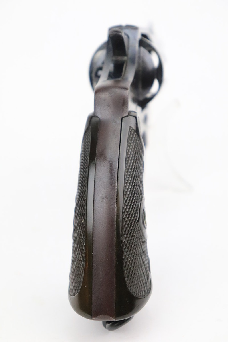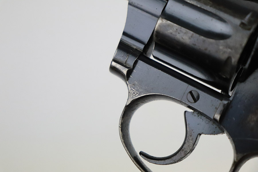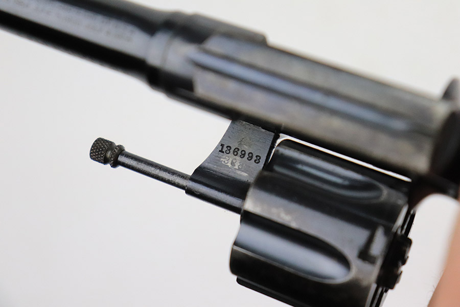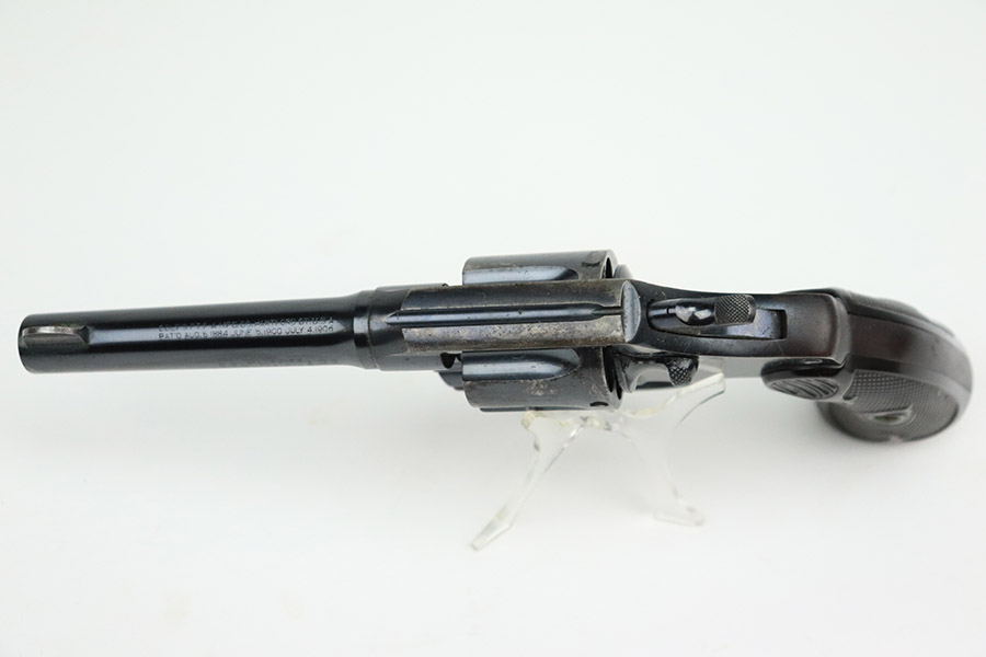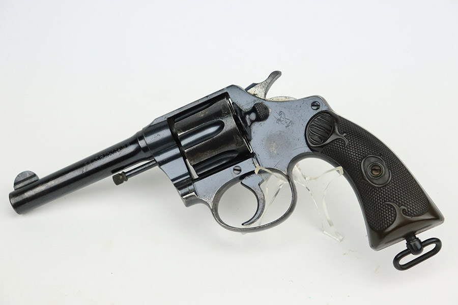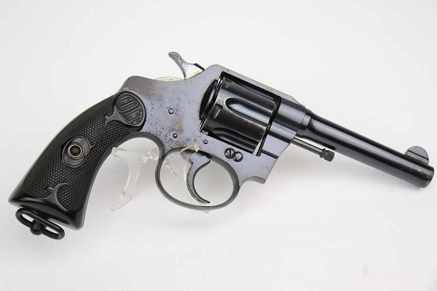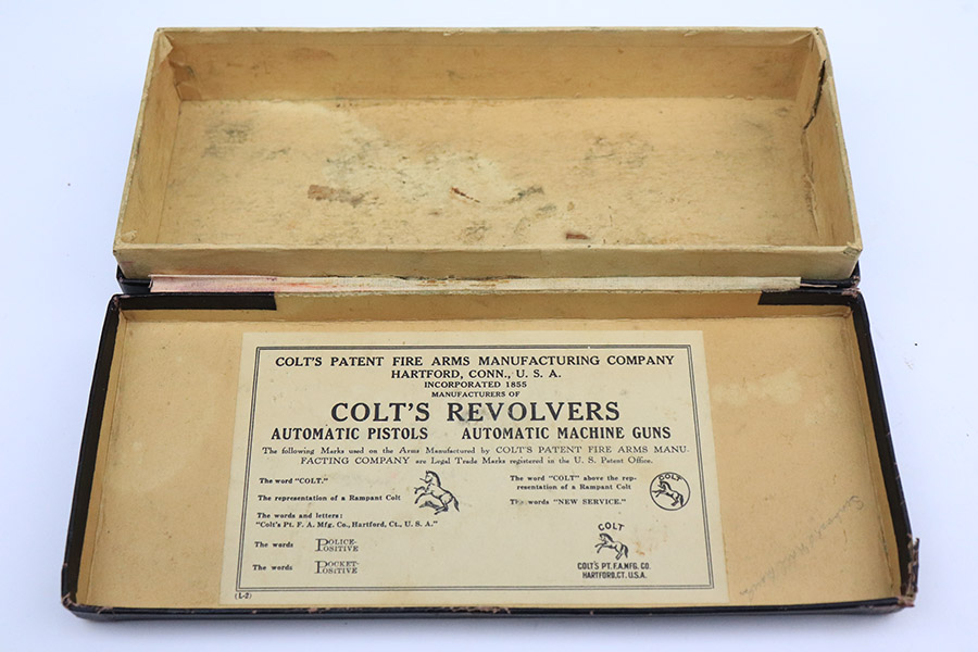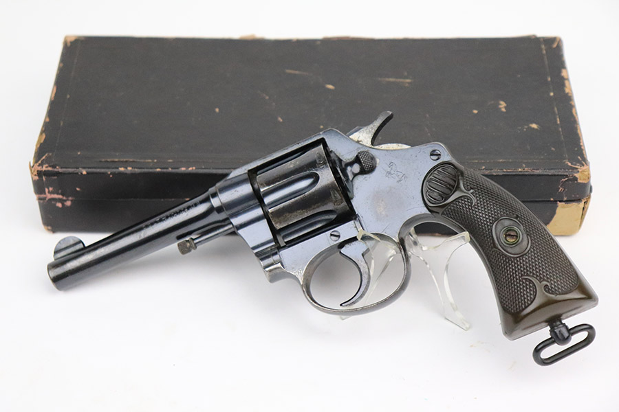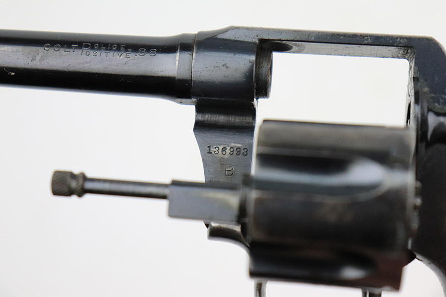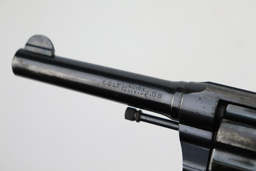 11/16/22 – This is a Colt Police Positive Revolver, manufactured in 1921 and chambered in .38 caliber. The gun is all matching and comes with a period-correct box that is not matching – the box is fairly torn along the edges. The gun itself has retained about 90% of its original high polish finish with areas of light spotty wear around the muzzle, along the barrel, on the left side of the frame, and on the cylinder. While there isn’t much actual finish loss, there is spotty oxidation throughout (most noticeable on the right side of the frame) and brown patina on both grip straps. Comes with very nice blackish-brown grips. Excellent bore with strong rifling. The cylinder is tight, and the action is smooth.