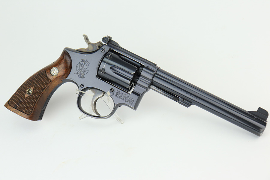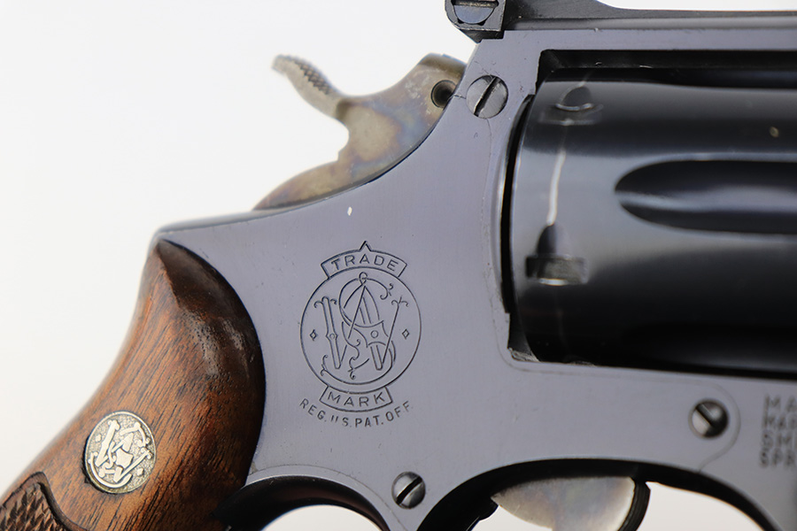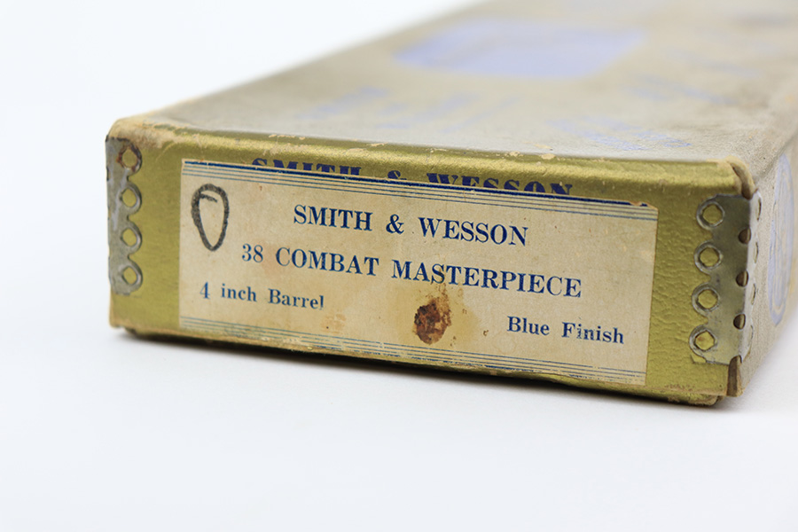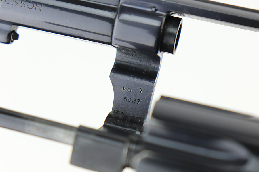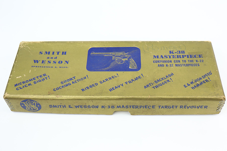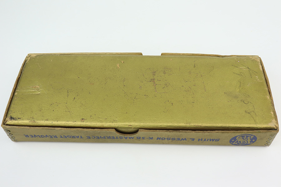 4/20/22 – This is an excellent example of a Smith & Wesson K-38 revolver, manufactured in 1950 and chambered in .38 Special. It is a matching and comes with period correct box (not matching to the gun) and original cleaning kit. The gun has retained about 96% of its original bluing. Most of the finish loss is along the left side of the barrel, but there is also some minor muzzle wear, minor wear on the underside of the trigger guard, and a light roll mark on the cylinder. Very nice case-hardening on the trigger and hammer. The cylinder is tight, and the action is very smooth. Comes with excellent period-correct wood grips – some tiny dings on the bottom edges. Mint bore.