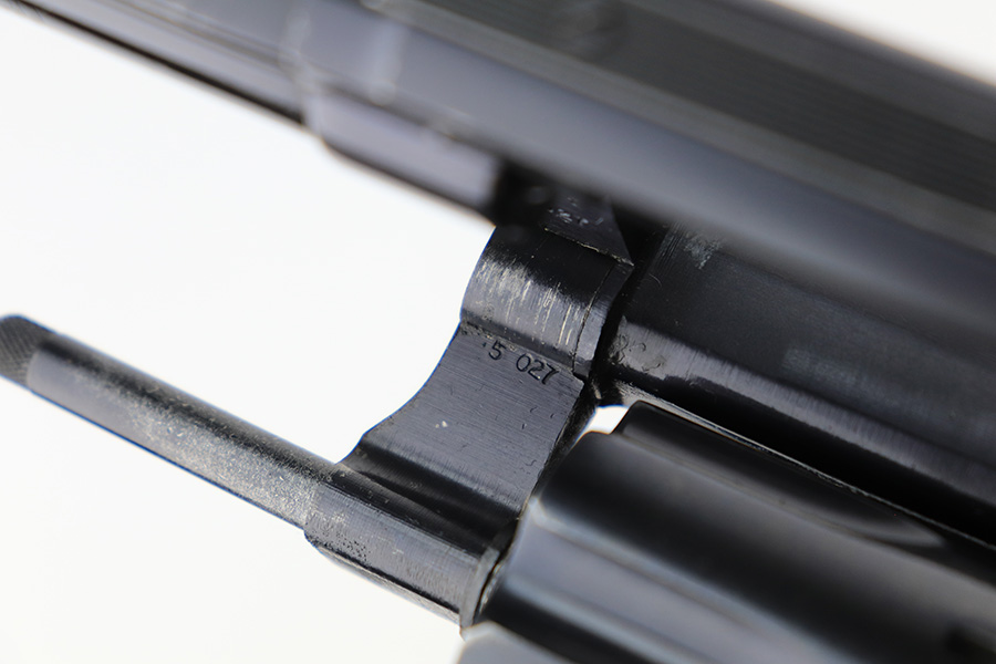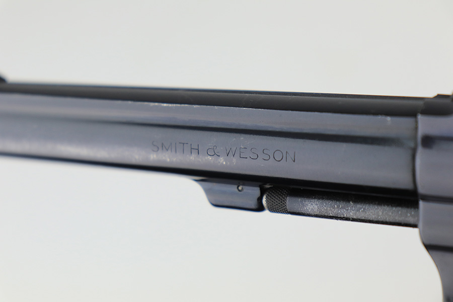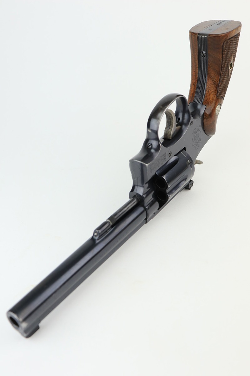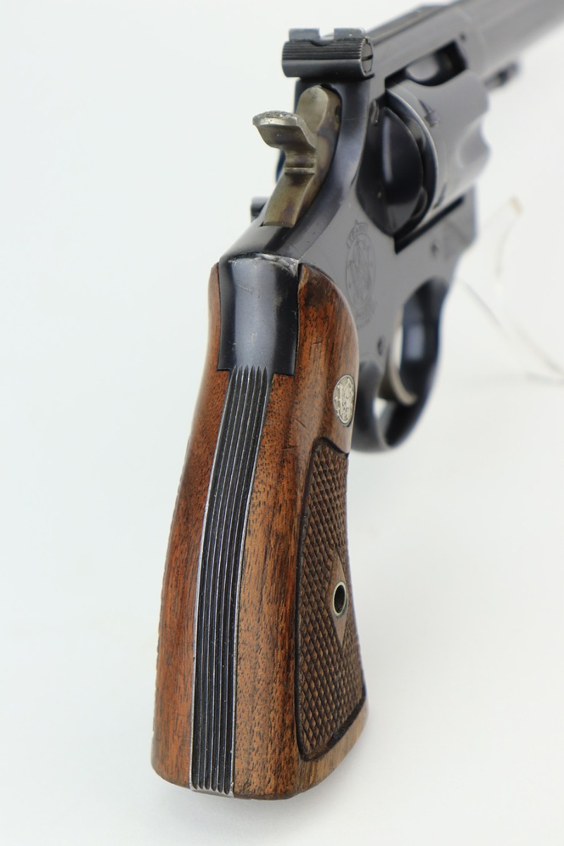 4/20/22 – This is an excellent example of a Smith & Wesson K-38 revolver, manufactured in 1950 and chambered in .38 Special. It is a matching and comes with period correct box (not matching to the gun) and original cleaning kit. The gun has retained about 96% of its original bluing. Most of the finish loss is along the left side of the barrel, but there is also some minor muzzle wear, minor wear on the underside of the trigger guard, and a light roll mark on the cylinder. Very nice case-hardening on the trigger and hammer. The cylinder is tight, and the action is very smooth. Comes with excellent period-correct wood grips – some tiny dings on the bottom edges. Mint bore.