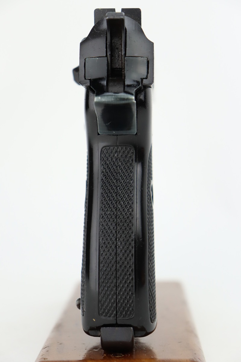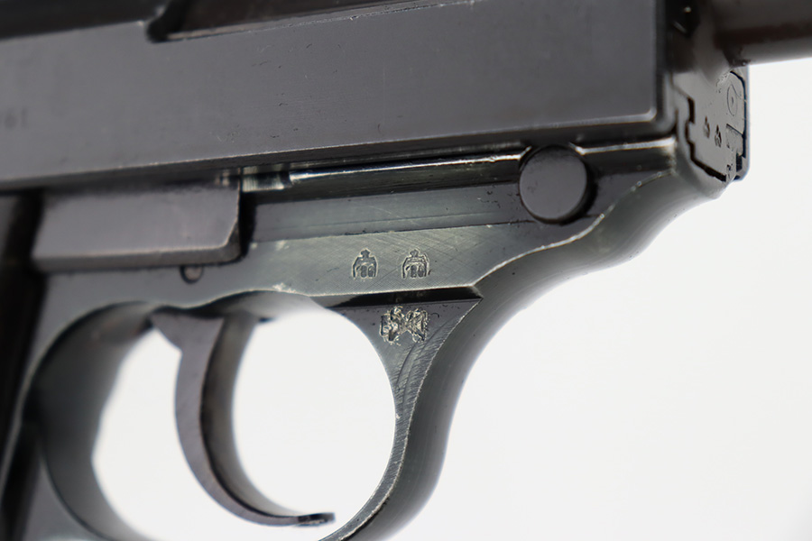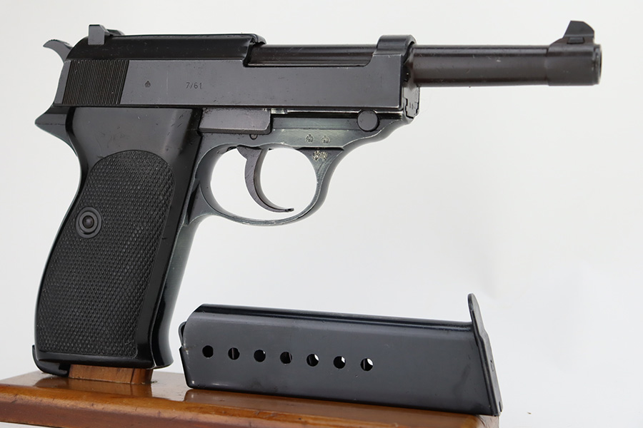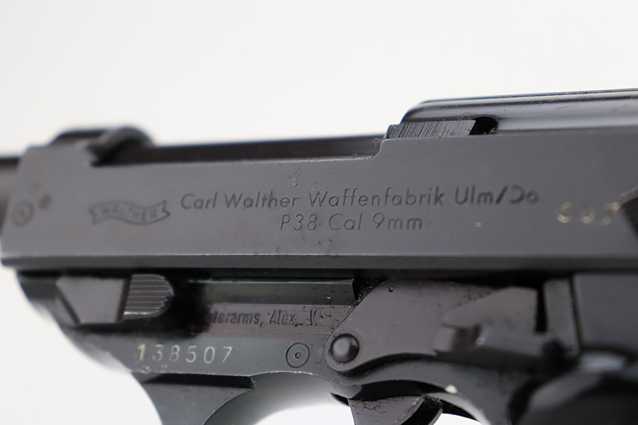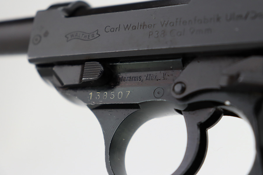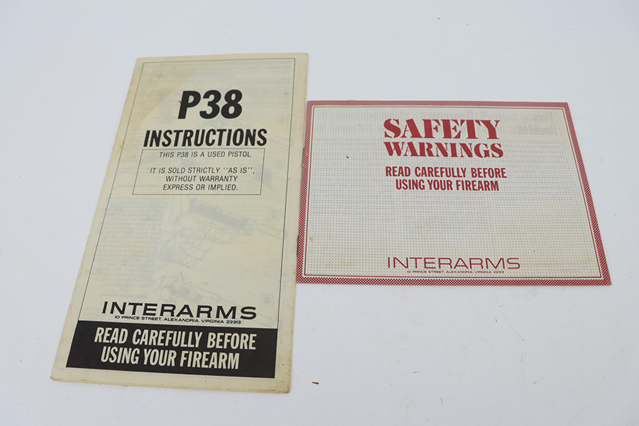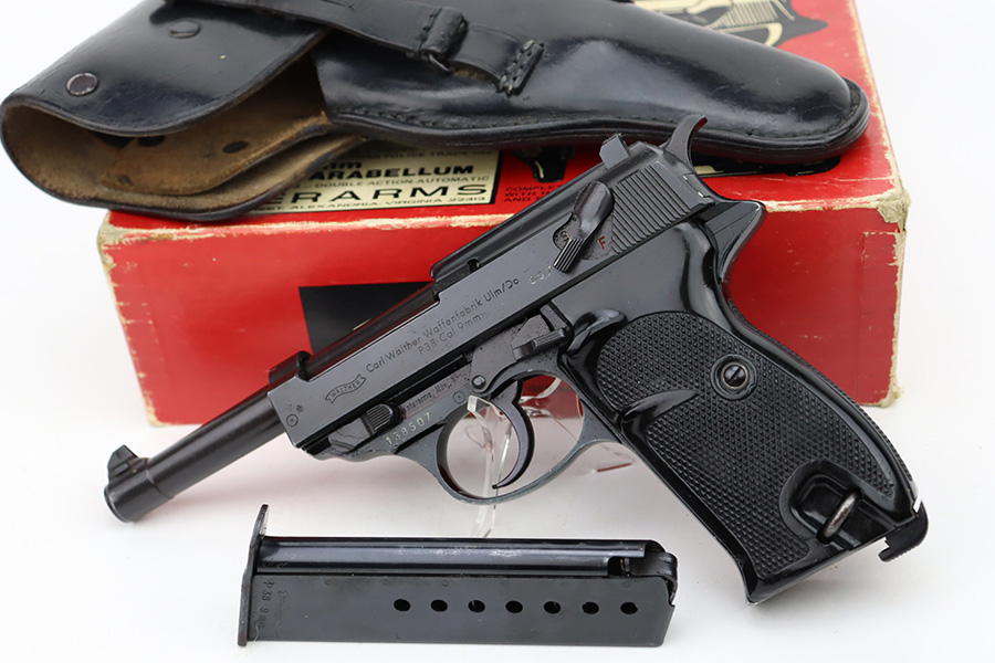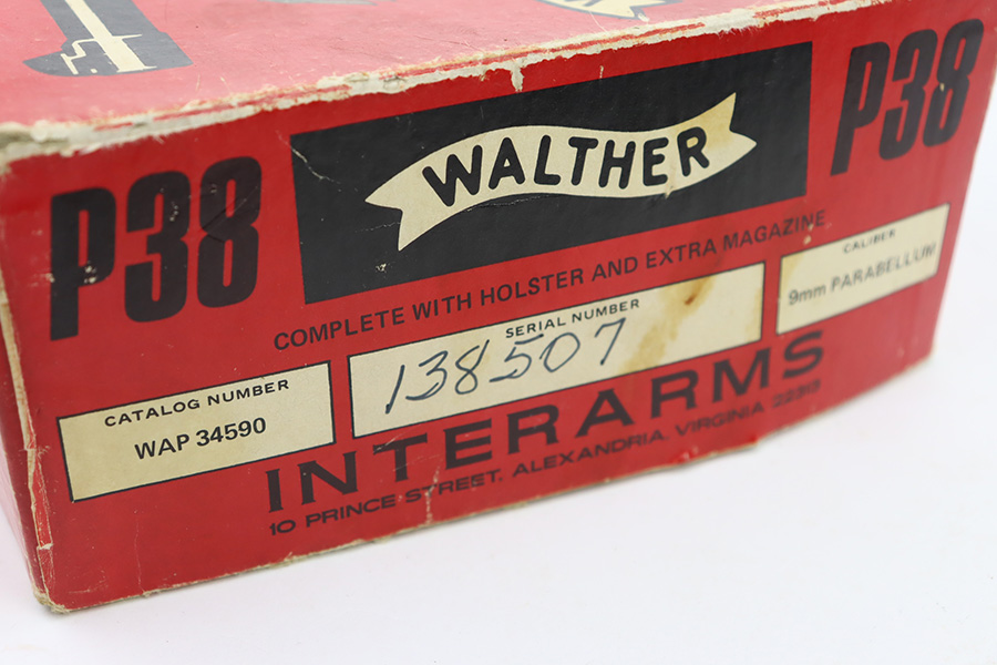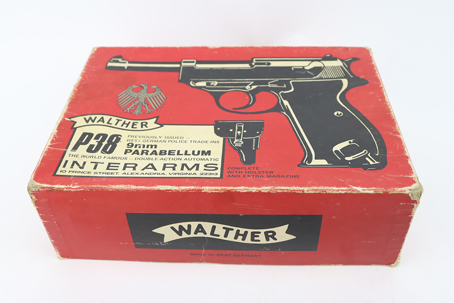 1/3/24 – This is an excellent Walther P.38 manufactured in July of 1961. All matching with an import mark on the left side of the frame. There is a crossed-out marking on the right side of the trigger guard. The gun comes with its matching-numbered Interams Import box, a minty black leather holster, two magazines, and an owners manual. The finish rates about 95% with just some very minor thinning on the front strap. Fitted with black plastic grips. Mint bore. De-cocker is functional.