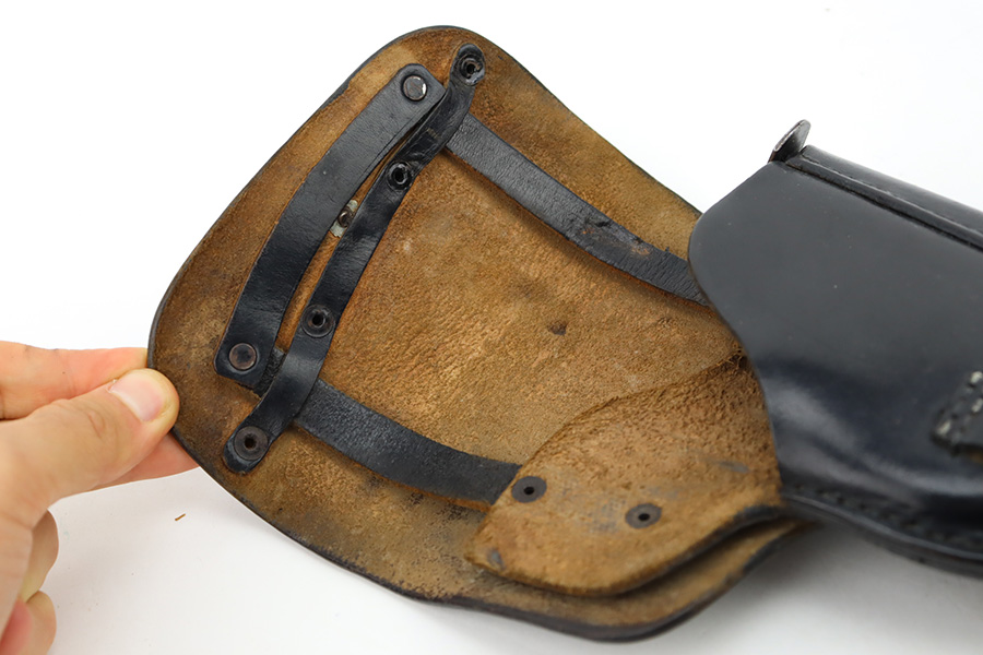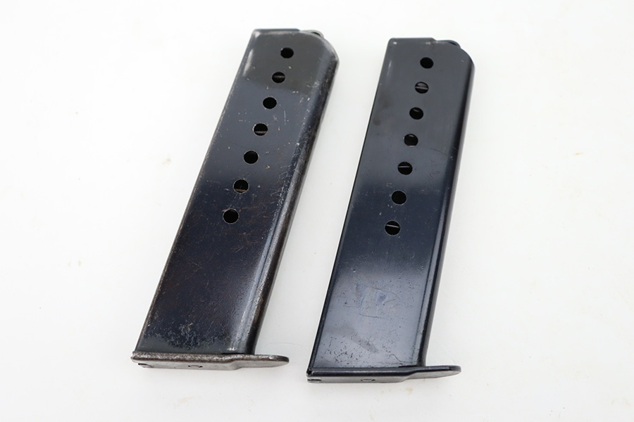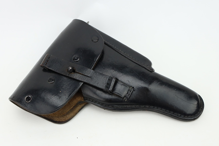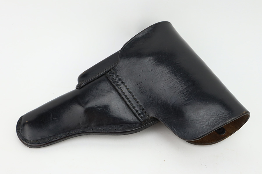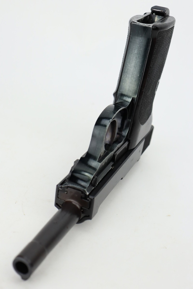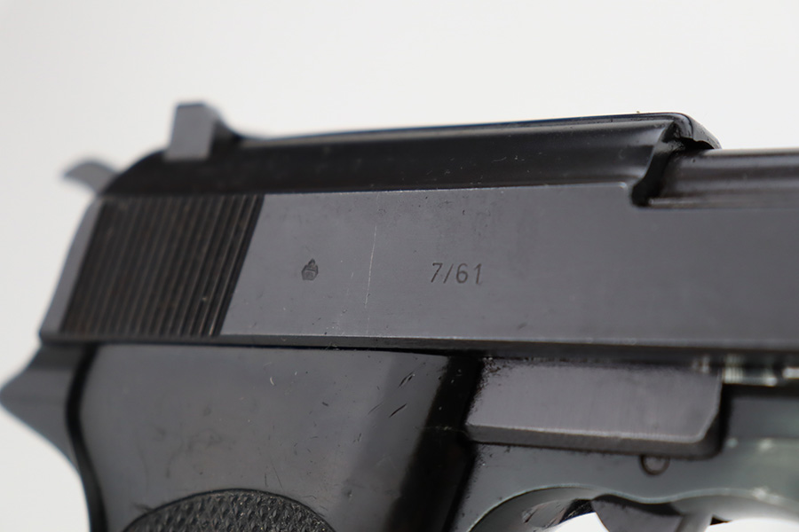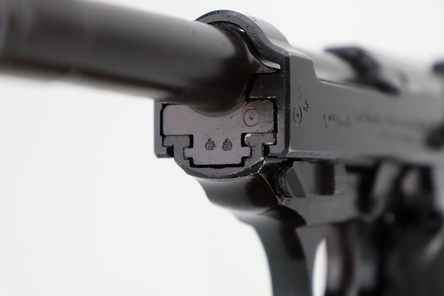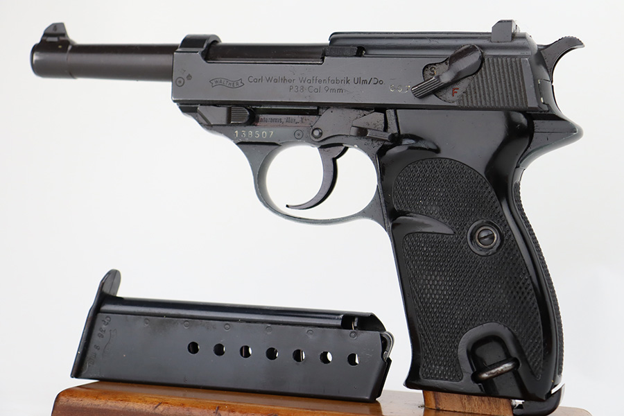 1/3/24 – This is an excellent Walther P.38 manufactured in July of 1961. All matching with an import mark on the left side of the frame. There is a crossed-out marking on the right side of the trigger guard. The gun comes with its matching-numbered Interams Import box, a minty black leather holster, two magazines, and an owners manual. The finish rates about 95% with just some very minor thinning on the front strap. Fitted with black plastic grips. Mint bore. De-cocker is functional.