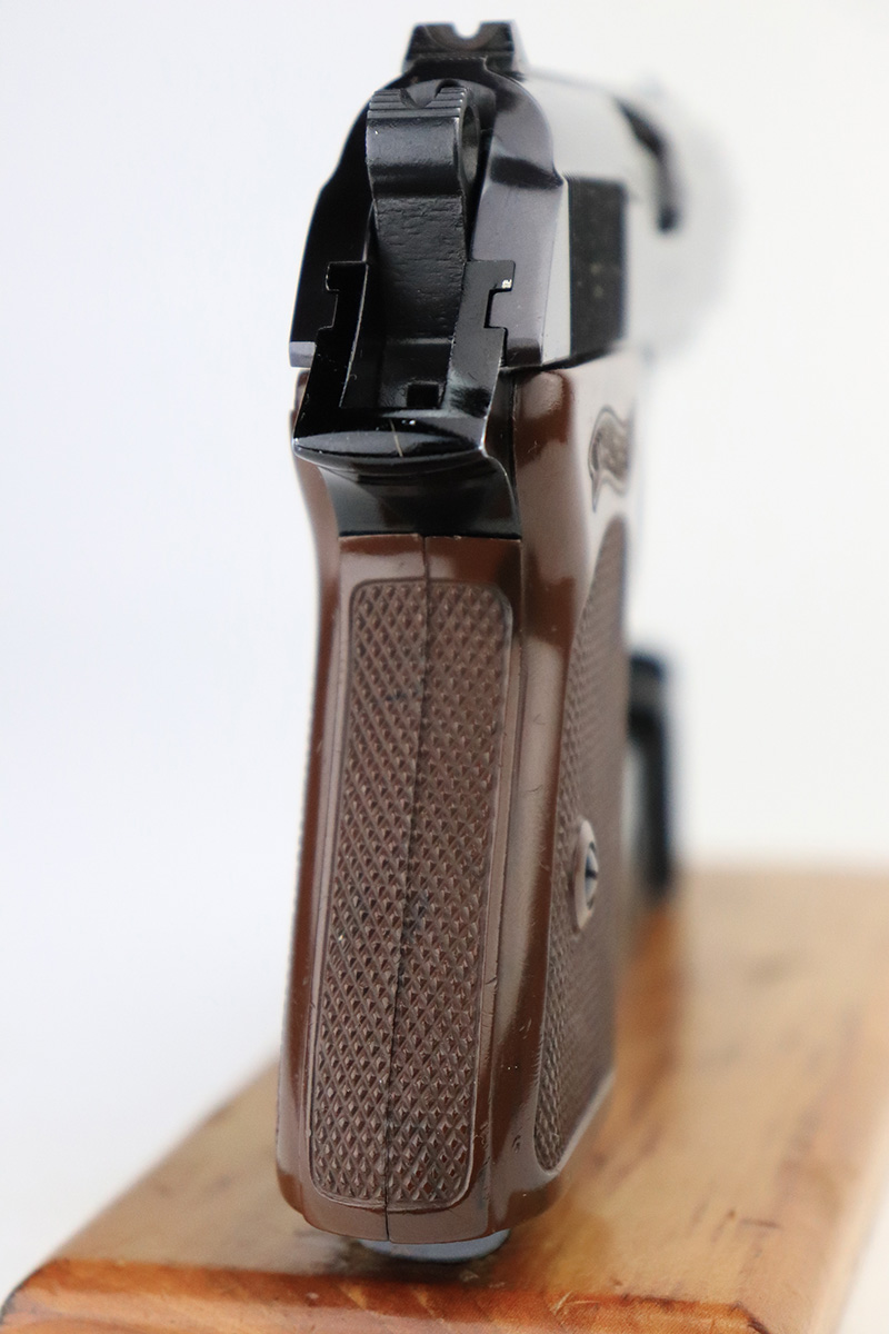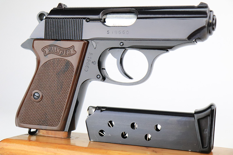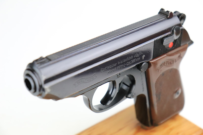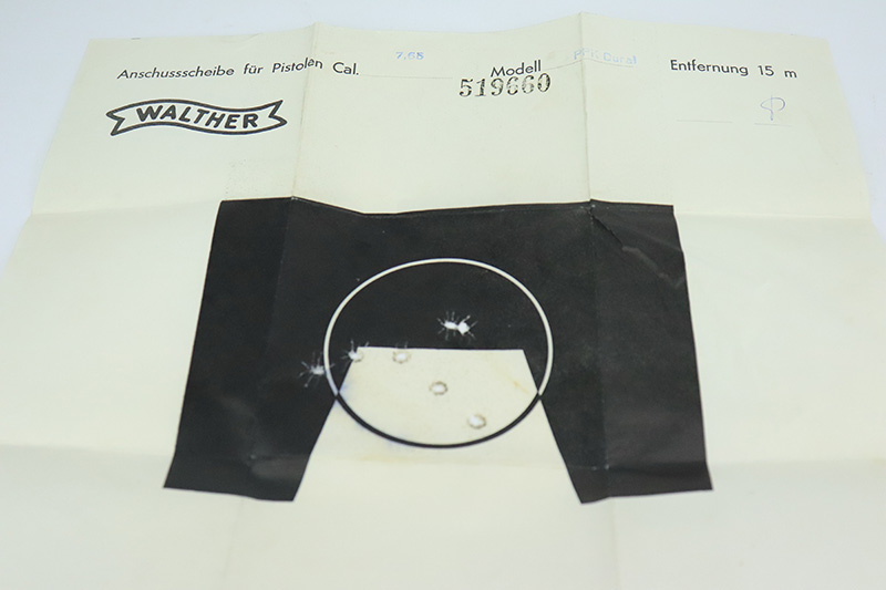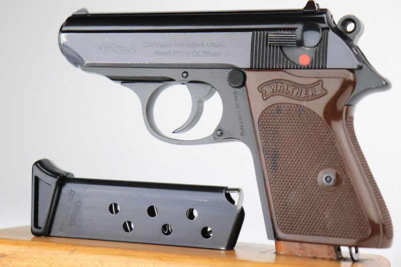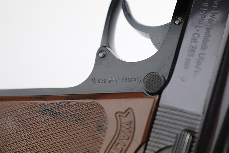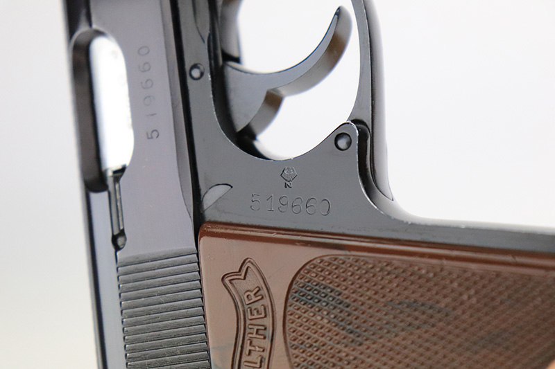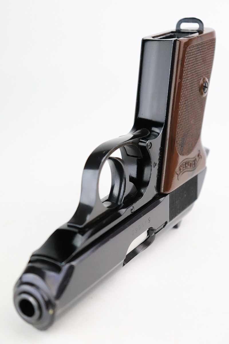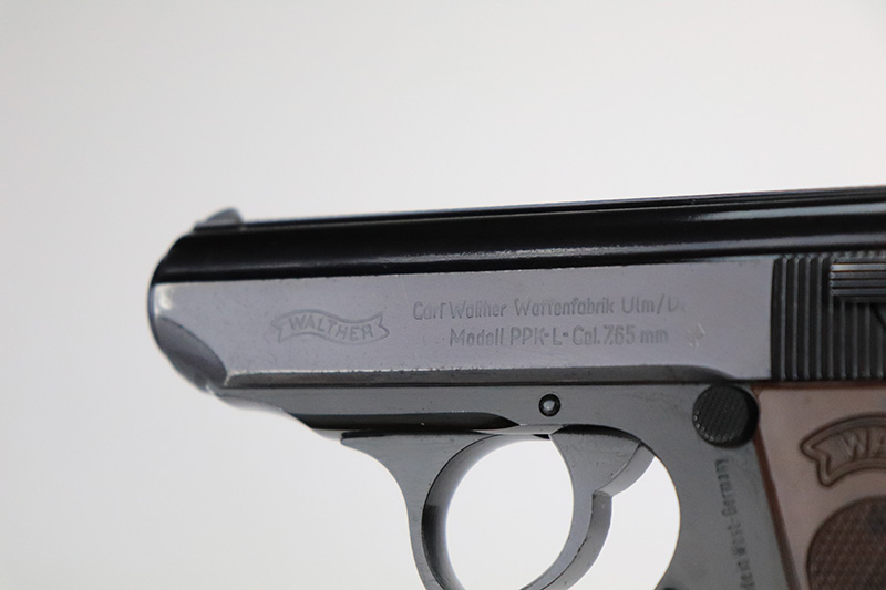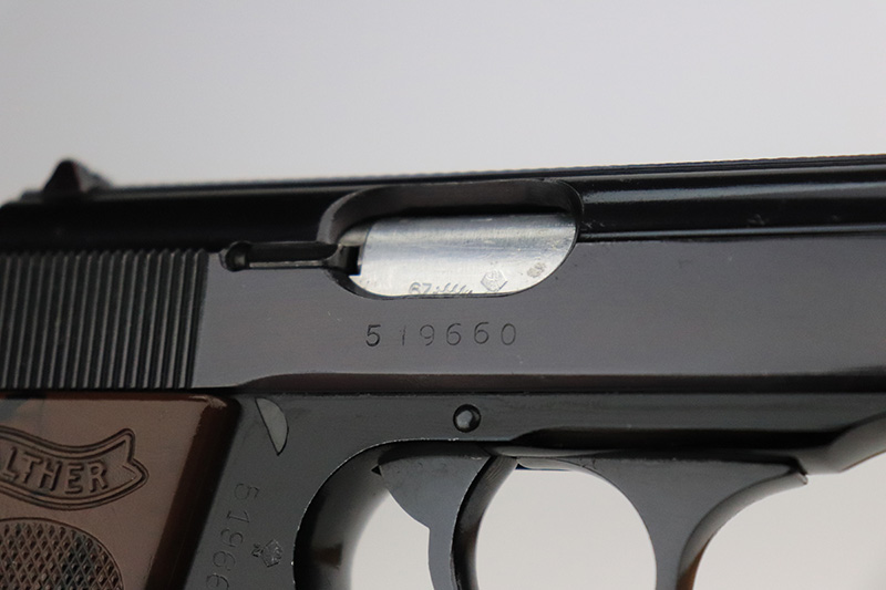 9/6/24 – This is a like-new example of a Walter PPK-L manufactured in 1967 and chambered in 7.65mm. It has a lightweight duraluminum frame. It comes with its original matching box, matching test target, owners manual, one finger extension magazine, one flat bottom magazine, brass cleaning rod, and indicator pin tool. The gun has retained nearly all of its original finish with very minor muzzle wear and a few tiny handling marks here and there. Comes with excellent black plastic grips. Mint bore.