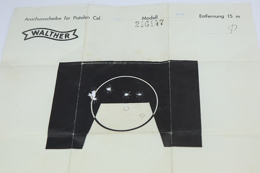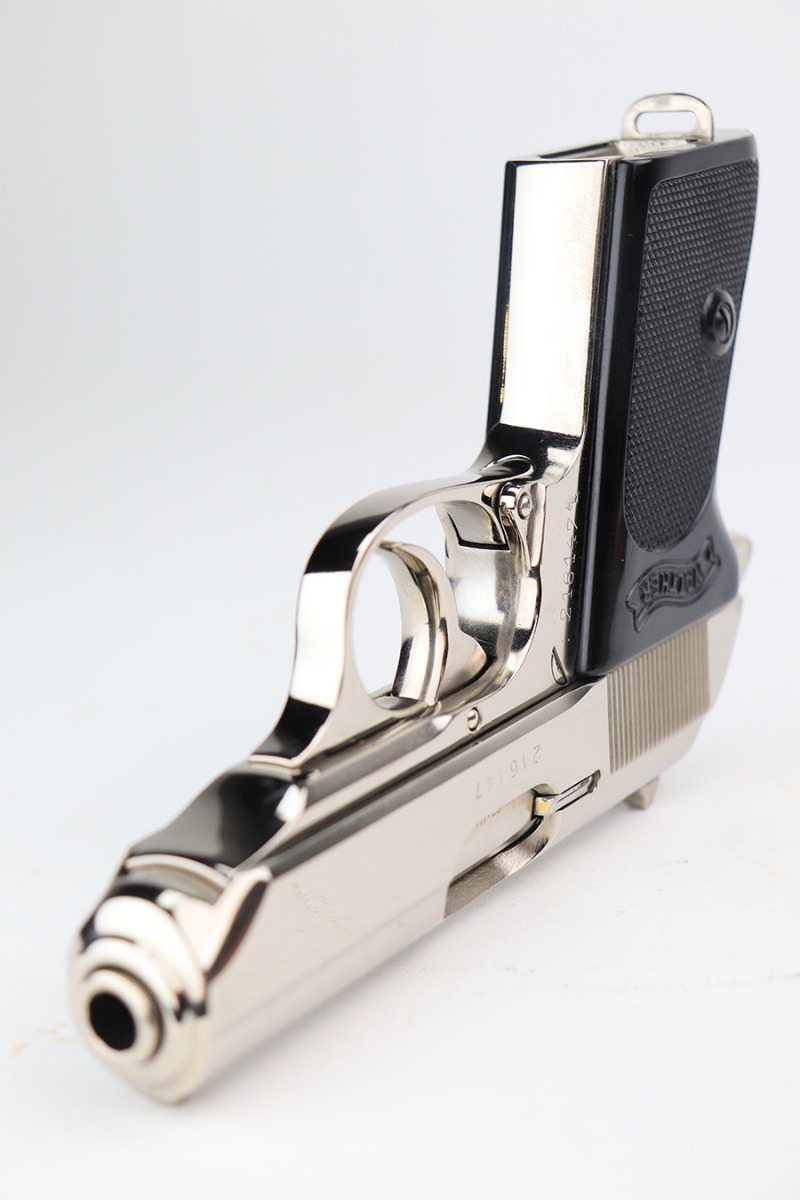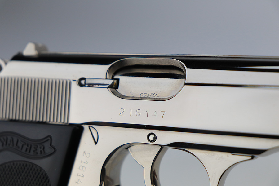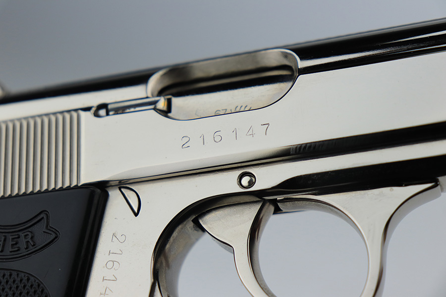 3/4/22 – This is an excellent example of a Walther PPK manufactured in 1967. It is all matching and has the proper West German proofs. It comes with the original matching-numbered box, matching test target, owners manual, cleaning rod, a blued finger extension magazine, and a nickeled finger extension magazine. The entire gun was restored and nickel-plated. It has retained all of its new plating with just a few micro-scratches on the right side of the slide. There is also an area on the right side of the frame where you can see some pin-pricking that was nickeled-over. It comes with excellent black plastic grips. The bore is mint.