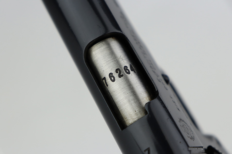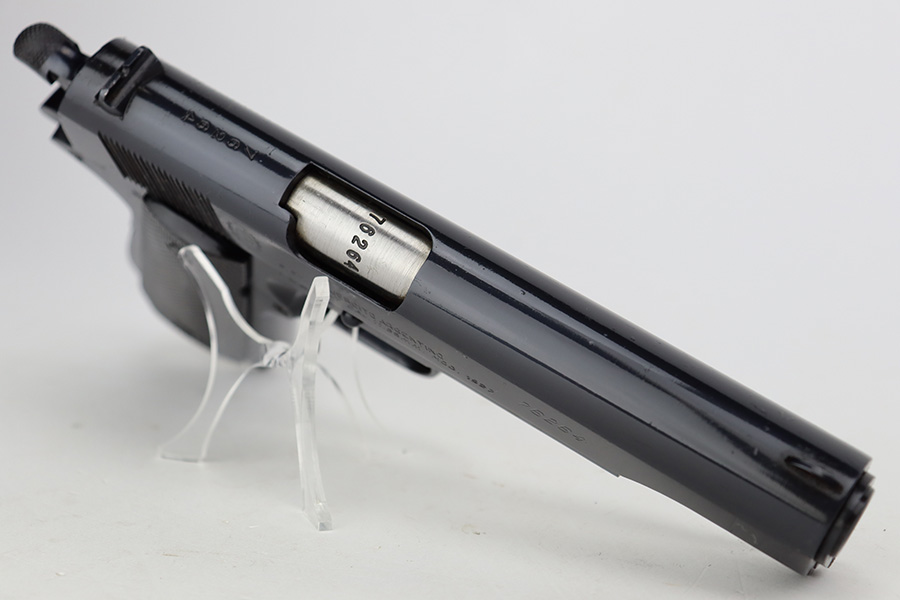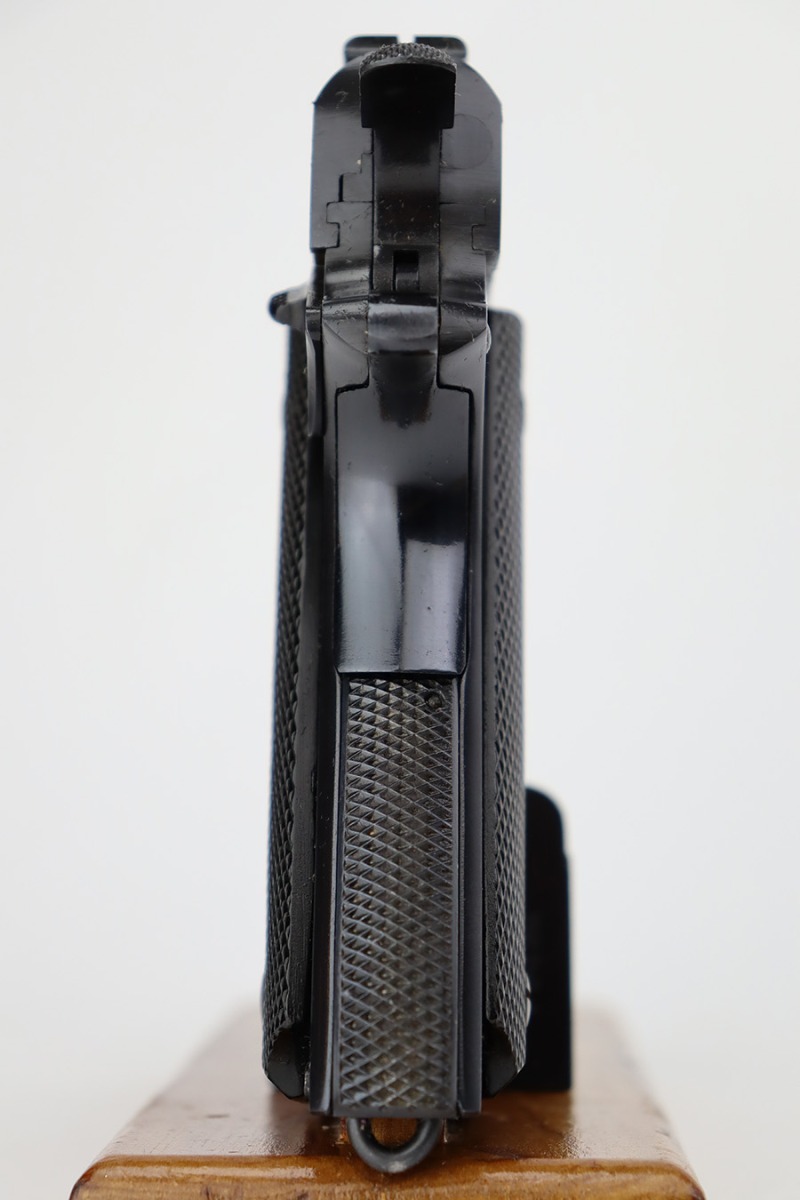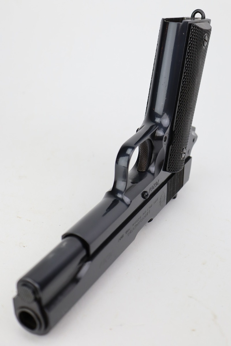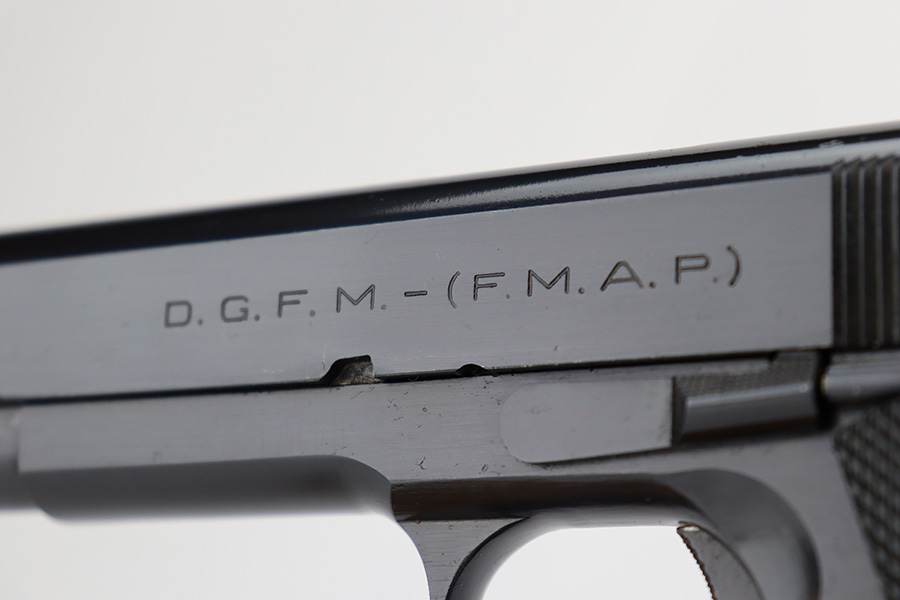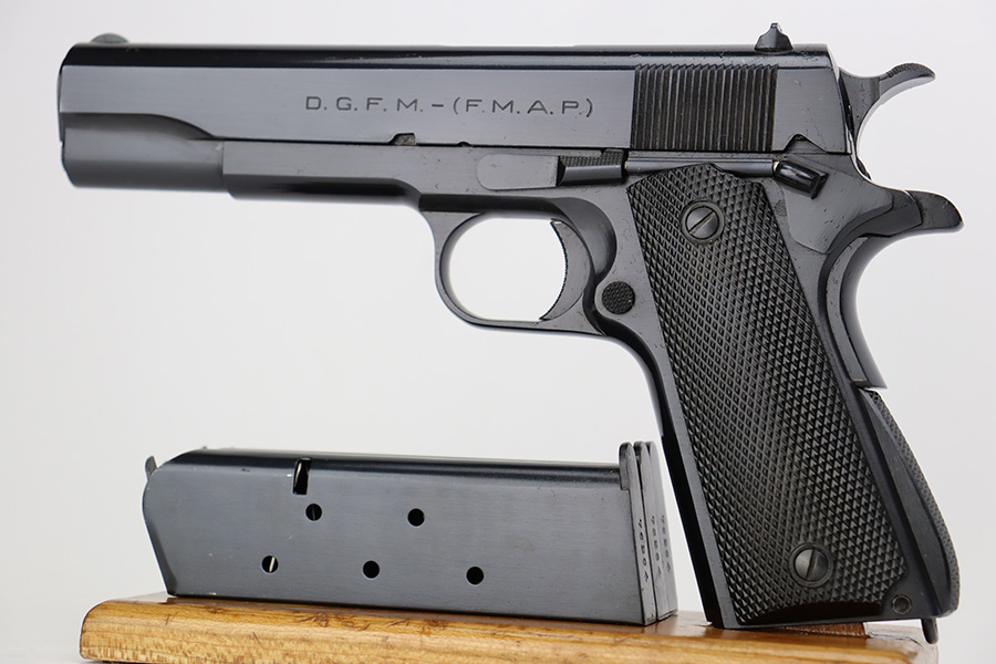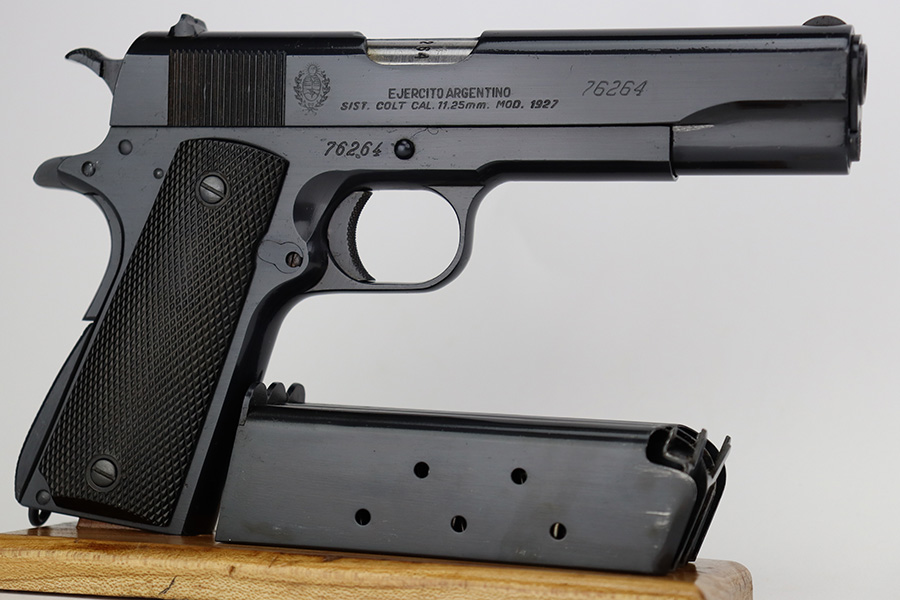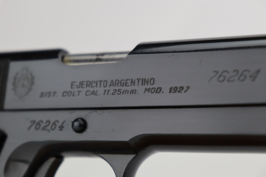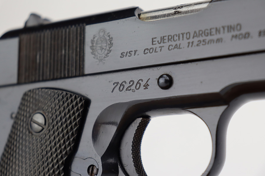 In 1943, the Argentine Military Small Arms Factory (FMAP – Fabrica Militar de Armas Portatiles) began to prepare for the manufacture of Model 1927 pistols under the 1927 licensing agreement. These pistols were known as “Pistola Sistema “Colt” Modelo Argentino 1927, Calibre 11,25mm.” Production began at the Esteban de Luca Arsenal in Buenos Aires, with the first pistols actually being assembled at the Domingo Matheu plant in Rosario, Argentina in 1945. The pistols were manufactured in accordance with Colt’s 1927 drawings. They were exact copies of Colt’s 1927 pistols (identical to US military M1911A1 pistols) except for very minor differences, and parts were interchangeable. The only noticeable differences were the markings, grips, black oxide bluing, a sharp edge on the rear of the hammer, and a sharp edge on the heel of the grip safety. Triggers were solid as on the 1927 Colts , and the checkering on the mainspring housing was changed from Colt type cut checkering to indented checkering.