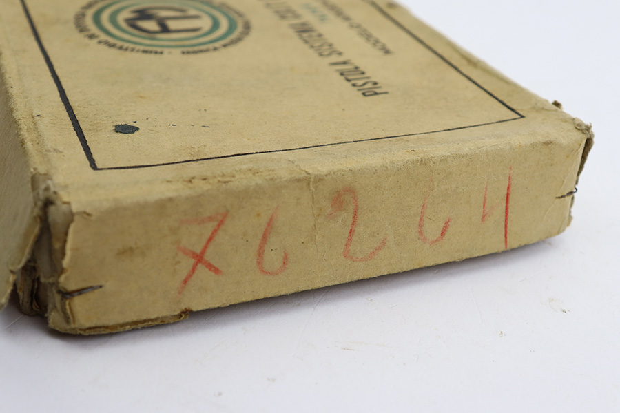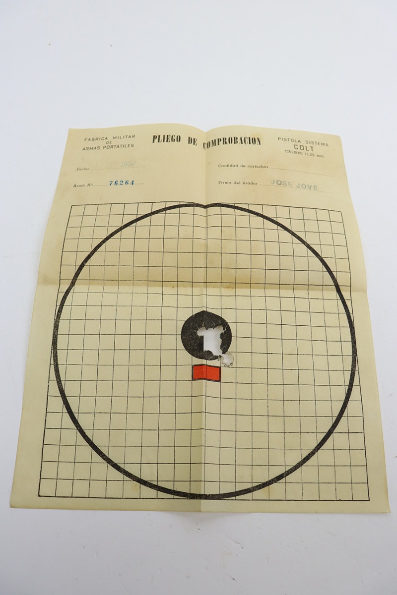 7/12/23 This is a minty Argentine D.G.F.M. Sistema Colt 1927 in the original matching box and includes three matching magazines. The high-polish blue on the pistol rates at 98% with just a single area of wear on the underside of the slide. The box shows age, with the box having softened over time (likely from gun oil), but it is serialized on the lid to this pistol. All three magazines are numbered to the pistol and in similar condition to the gun.  Pistol has minty grips and bore.  The box even includes a rare, matching numbered test target!