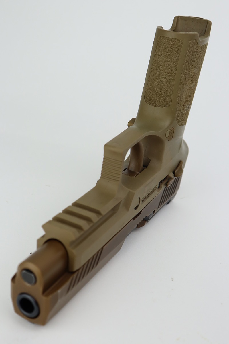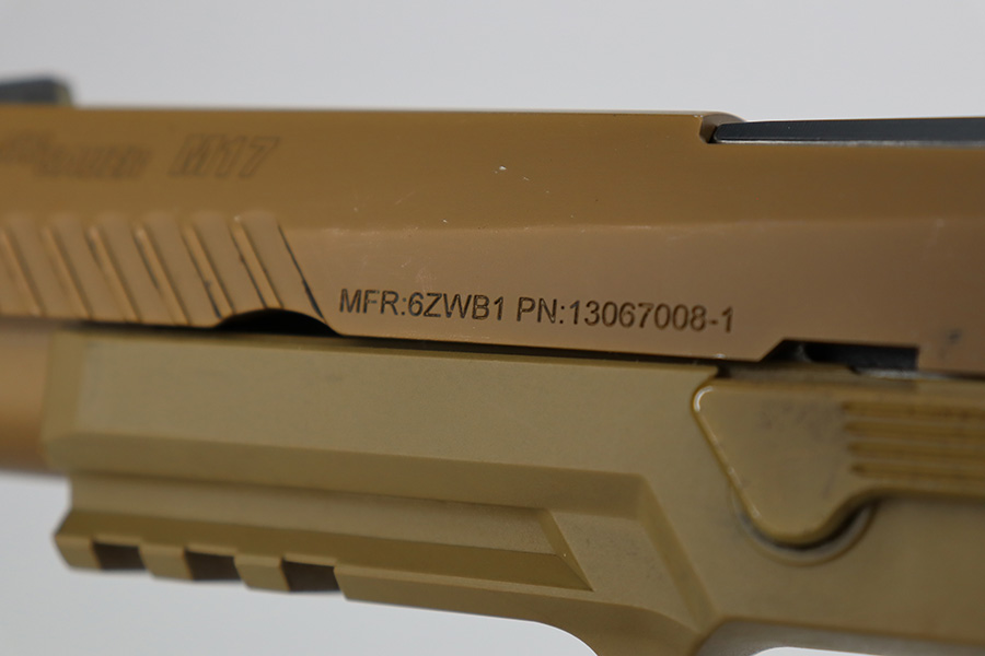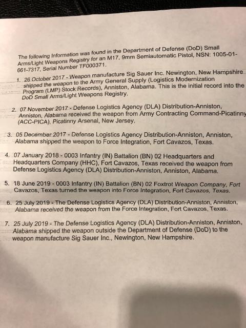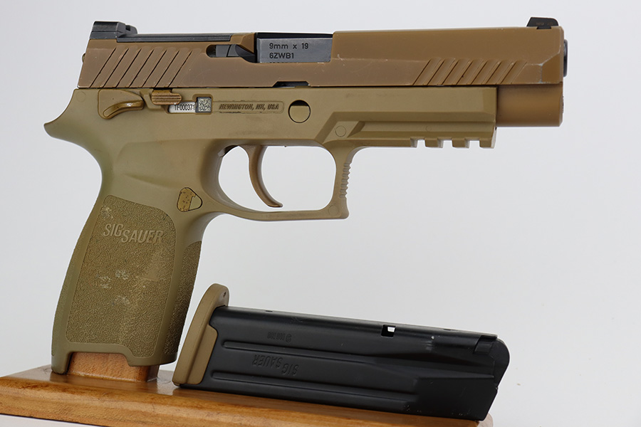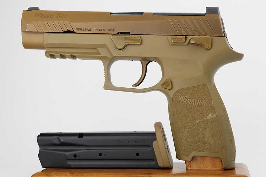 10/10/23 – This is an interesting and authentic U.S. Army issued Sig Sauer M17 pistol, with certificate of authenticity from Sig Sauer. From the COA, “This pistol was fielded during the initial domestic and in-theatre deployment of the Modular Handgun System Program. It was manufactured under contract with the U.S. Army to the original specifications, color and configuration of the MHS Program, including the coyote external controls, orange and green night sights, magazines, markings, components and coatings. It also includes the original exclusive government serial number.” The pistol is all original and has retained nearly all of its finish, with very minor handling wear on the sides of the frame and slide, and two small streaks of finish loss along the top of the slide. Mint bore. Textured grips are in good shape overall, but do have some minor smoothing in a couple places. Comes in the matching surplus box with two spare magazines, manual and gun lock. FFL required. Comes with the FOIA request which details the history of this pistol, and confirms it went to the 15th Infantry.