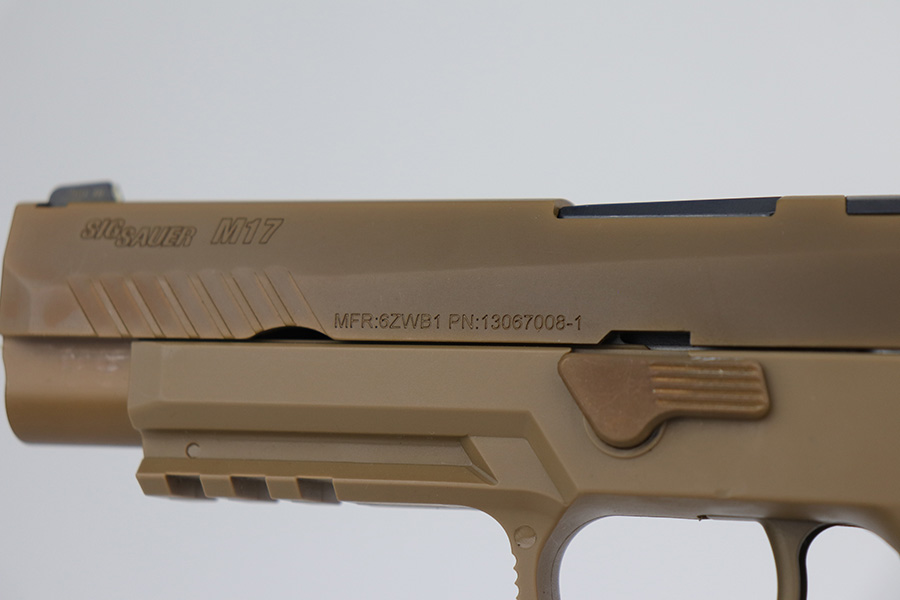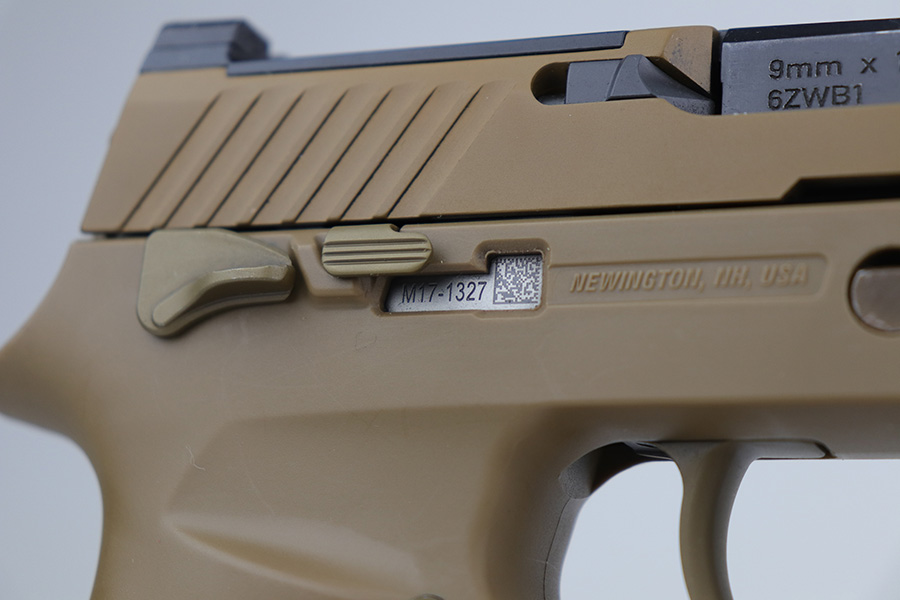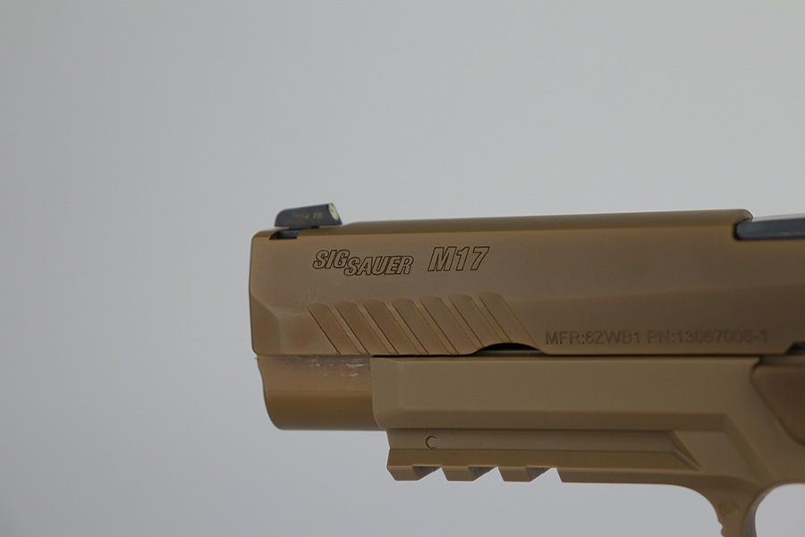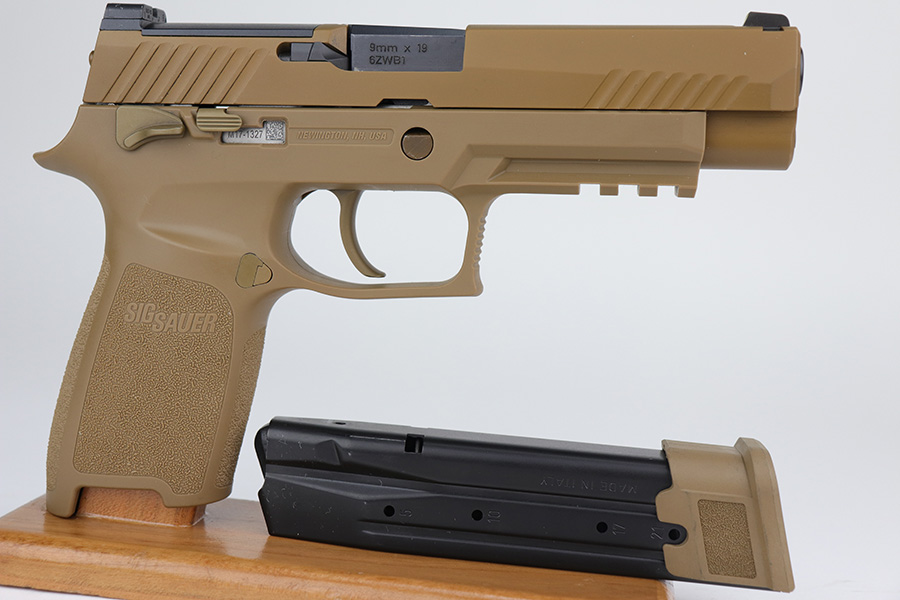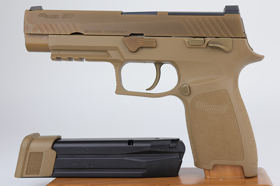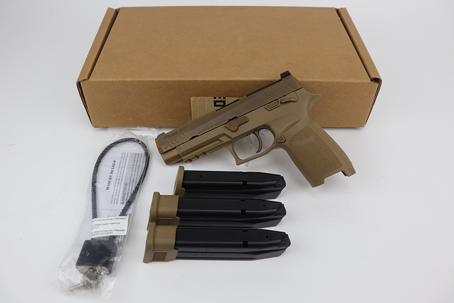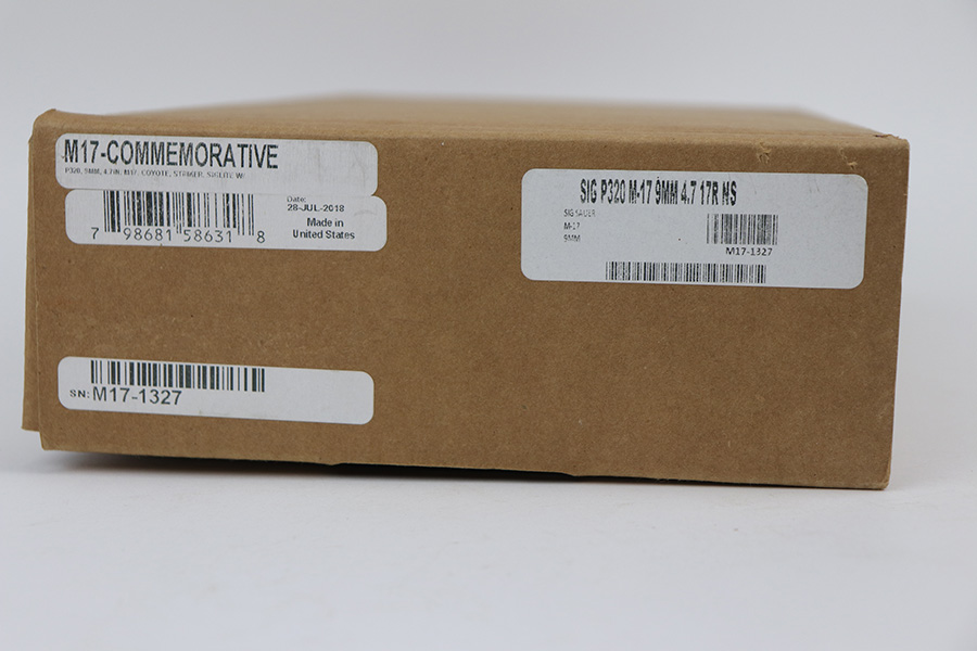 10/13/21 – This is a minty Sig Sauer P320 M17 commemorative in its original, matching box, along with the Sig Sauer glass/wood display case. From Sig’s site: “The Sig Sauer Commemorative P320 M17 is 1 of 5,000, and is a commercial tribute to the U.S. Military’s M17 pistol. It shares the same components, coatings, and markings as the firearm that was awarded the U.S. Army’s stringent MHS Contract. This award, and pistol represents the relentless pursuit of excellence by Sig Sauer to produce the best products on the market today. Only 5,000 M17-Commemorative Edition pistols have been produced for sale, and each SIG SAUER M17-Commemorative pistol is serialized M17-0001 through M17-5000 and includes the Army’s required unique identifier (UID). The M17 is sold in the same cardboard packaging as delivered to the U.S. Army. From the pistol to the packaging, the M17-Commemorative Edition is identical to the U.S. Army’s official M17 service pistol. The pistol features a coyote-tan PVD coated stainless steel slide with the same optic cut as specified by the MHS contract, coyote-tan colored controls just like the original pistols shipped to the 101st Airborne, and a manual safety. The M17 is equipped with a SIGLITE front night sight and removable Night Sight rear plate. The M17-Commemorative comes with a coyote-tan carry-length grip module. Upon registration of the M17-Commemorative pistol, the purchaser will receive an official certificate of authenticity and commemorative challenge coin, both with serial numbers matching the purchased M17-Commemorative pistol.” The cardboard box still has the lock, two spare magazines and the manual. FFL required.