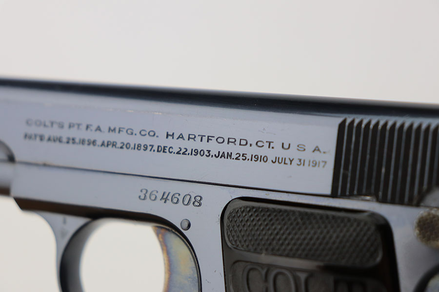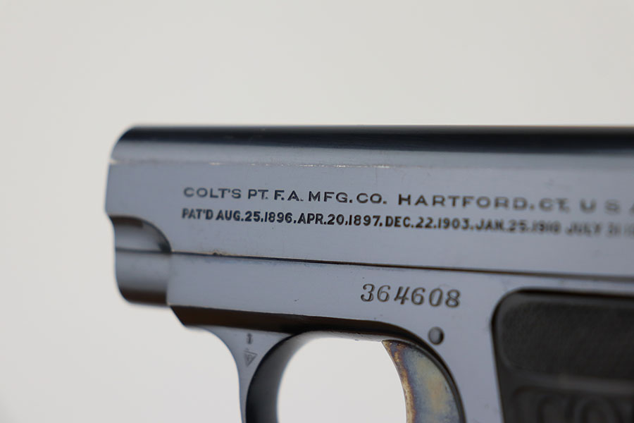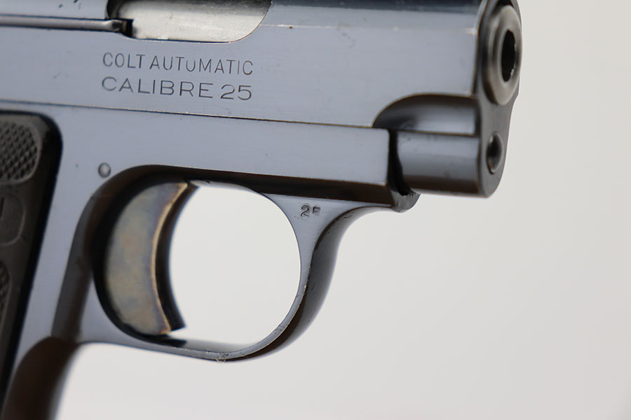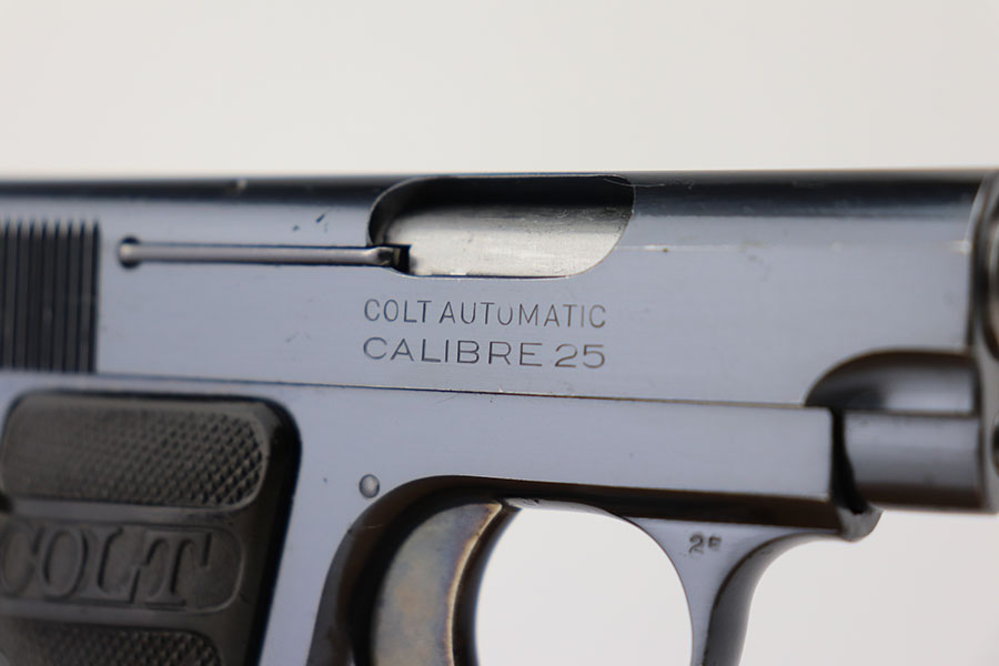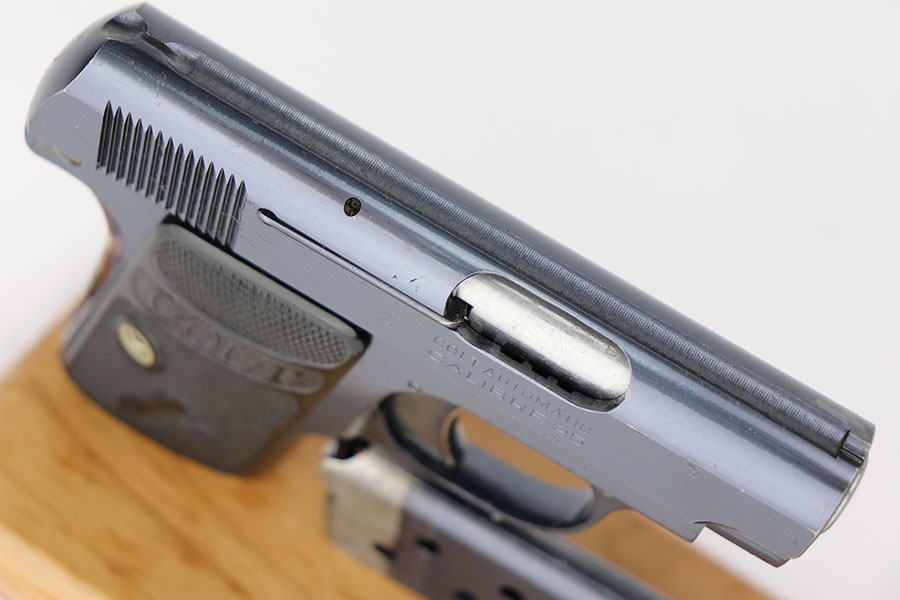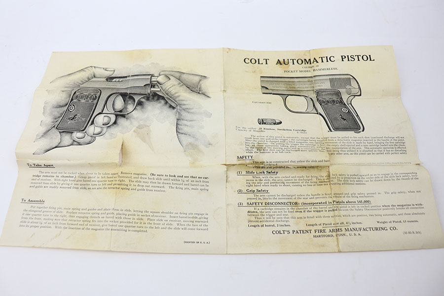 4/14/21 – This is a near-mint condition all original Colt model 1908 Hammerless pocket pistol. Comes with an original matching numbered box and a manual. Beautiful blued finish throughout with only some mild wear to the case hardened finish on the small parts. Mechanically sound and an excellent bore. The box has some mild wear and aging, but the serial number is still visibly written in pencil on the bottom. Comes in .25 caliber.