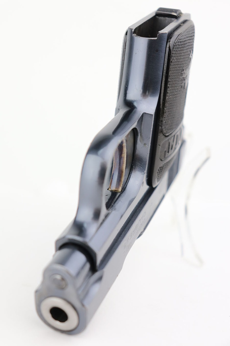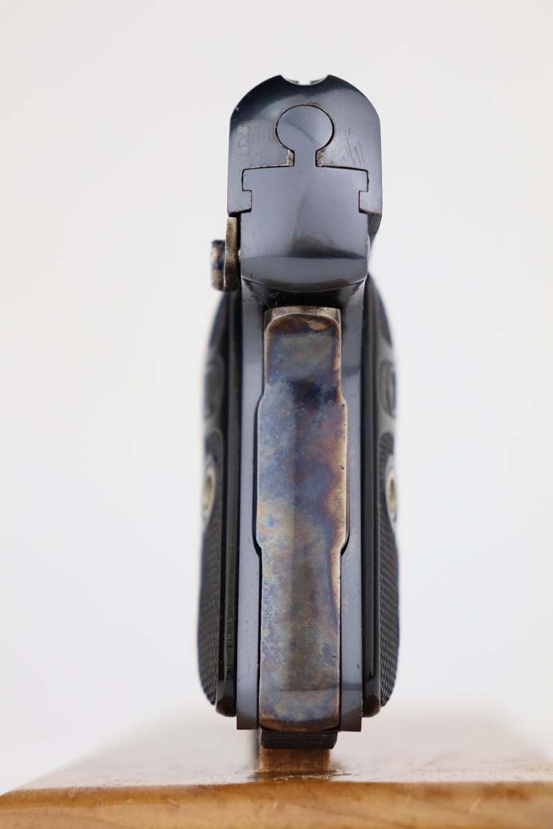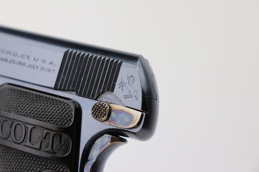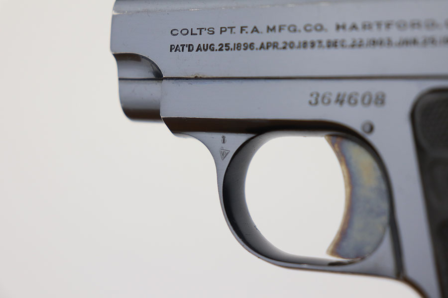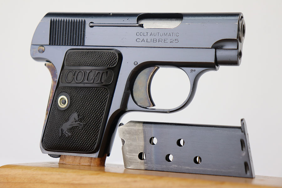 4/14/21 – This is a near-mint condition all original Colt model 1908 Hammerless pocket pistol. Comes with an original matching numbered box and a manual. Beautiful blued finish throughout with only some mild wear to the case hardened finish on the small parts. Mechanically sound and an excellent bore. The box has some mild wear and aging, but the serial number is still visibly written in pencil on the bottom. Comes in .25 caliber.