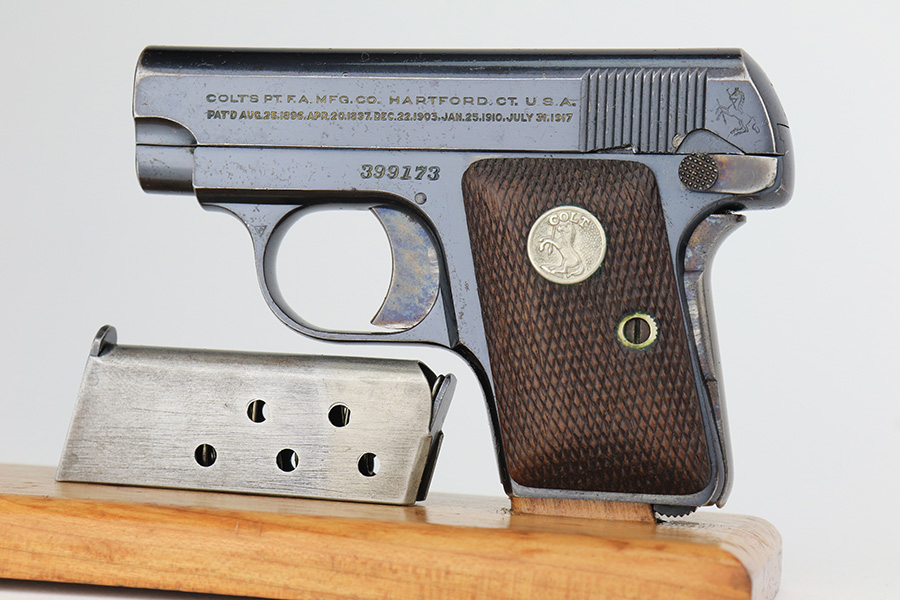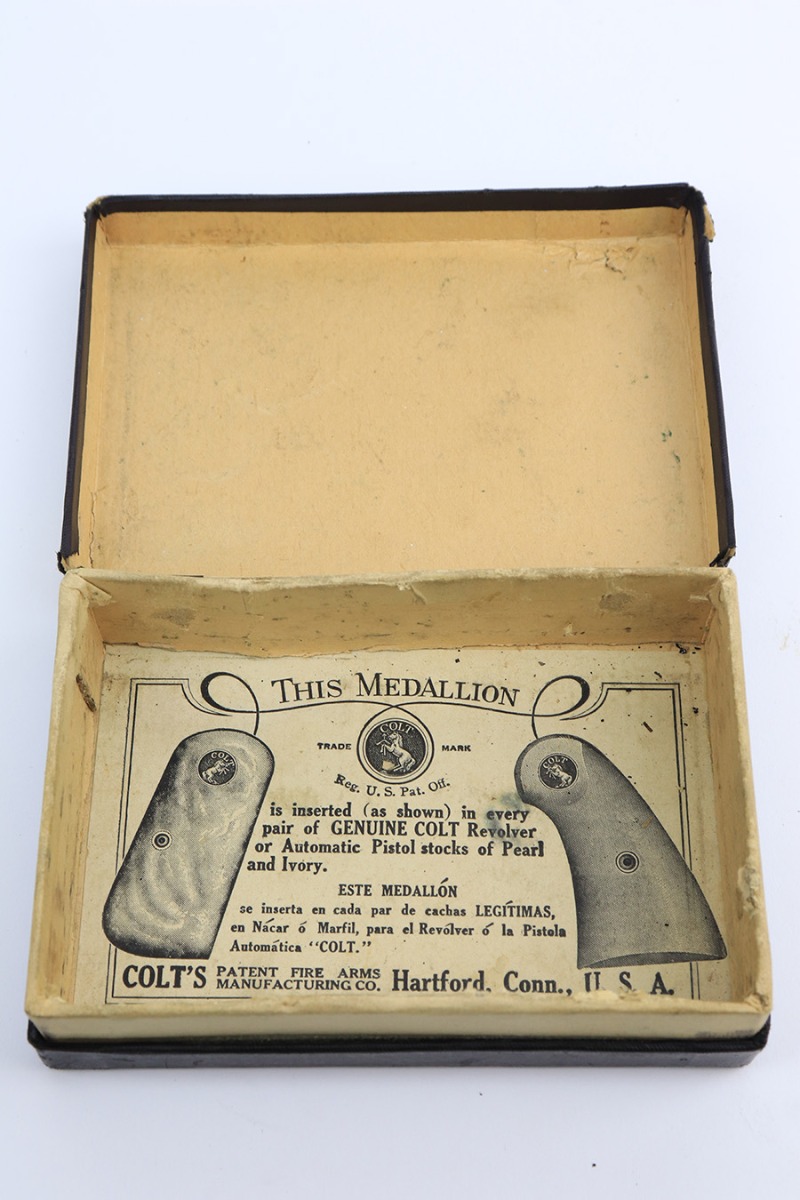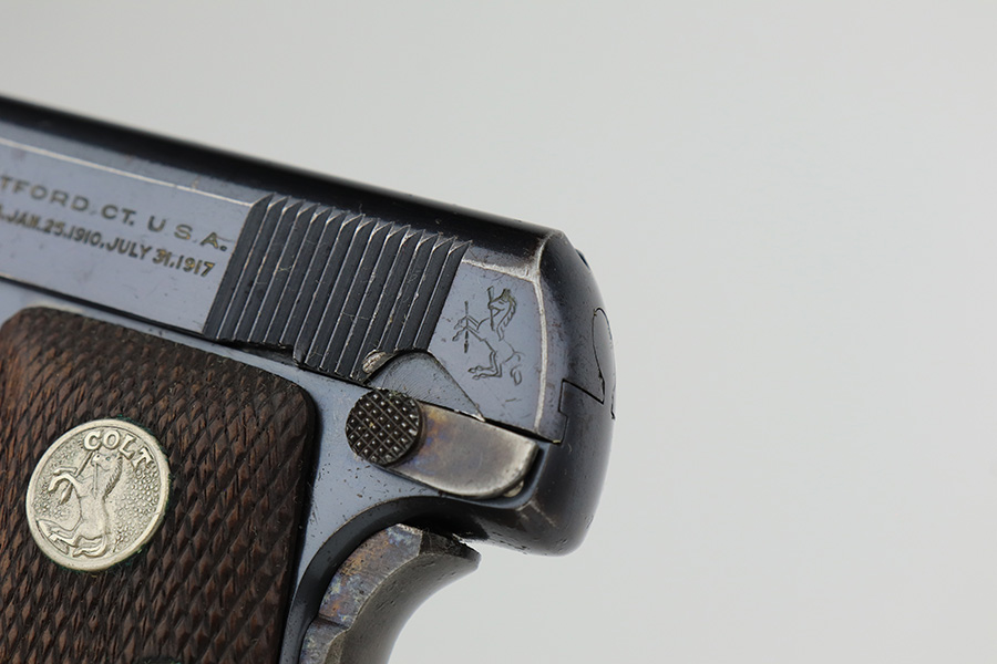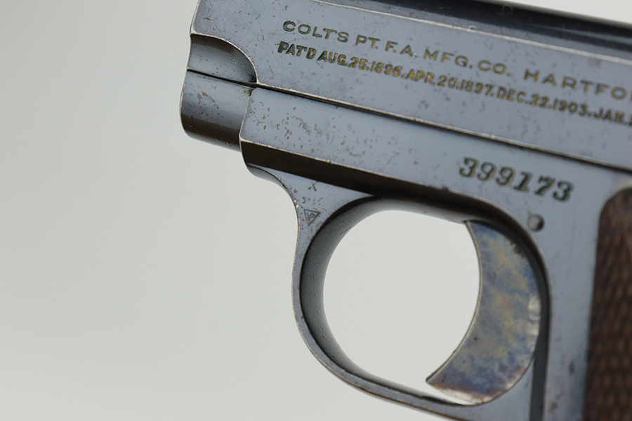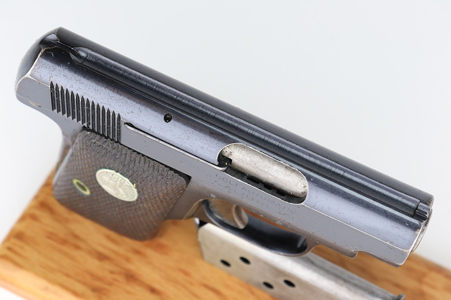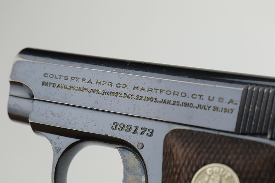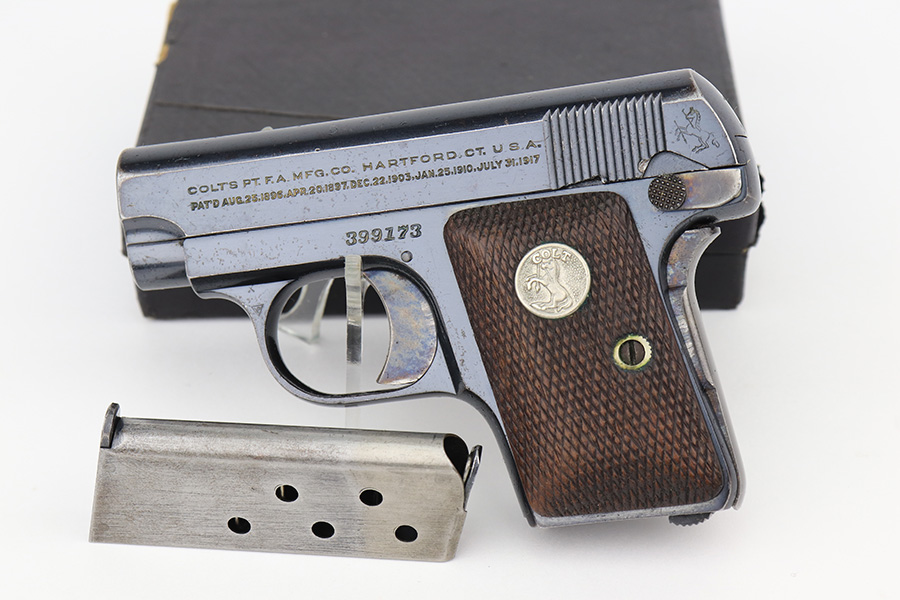 2/14/23 – This is a Colt 1908 Vest Pocket in its original box. The bluing is generally in good condition but the case hardening has worn off the grip safety. There is also high edge wear and oxidation on the sides of the frame and slide. Minty bore. Very nice wood grips with minor smoothing. Comes with the Colt box which is hand numbered and matching to the pistol on the bottom.