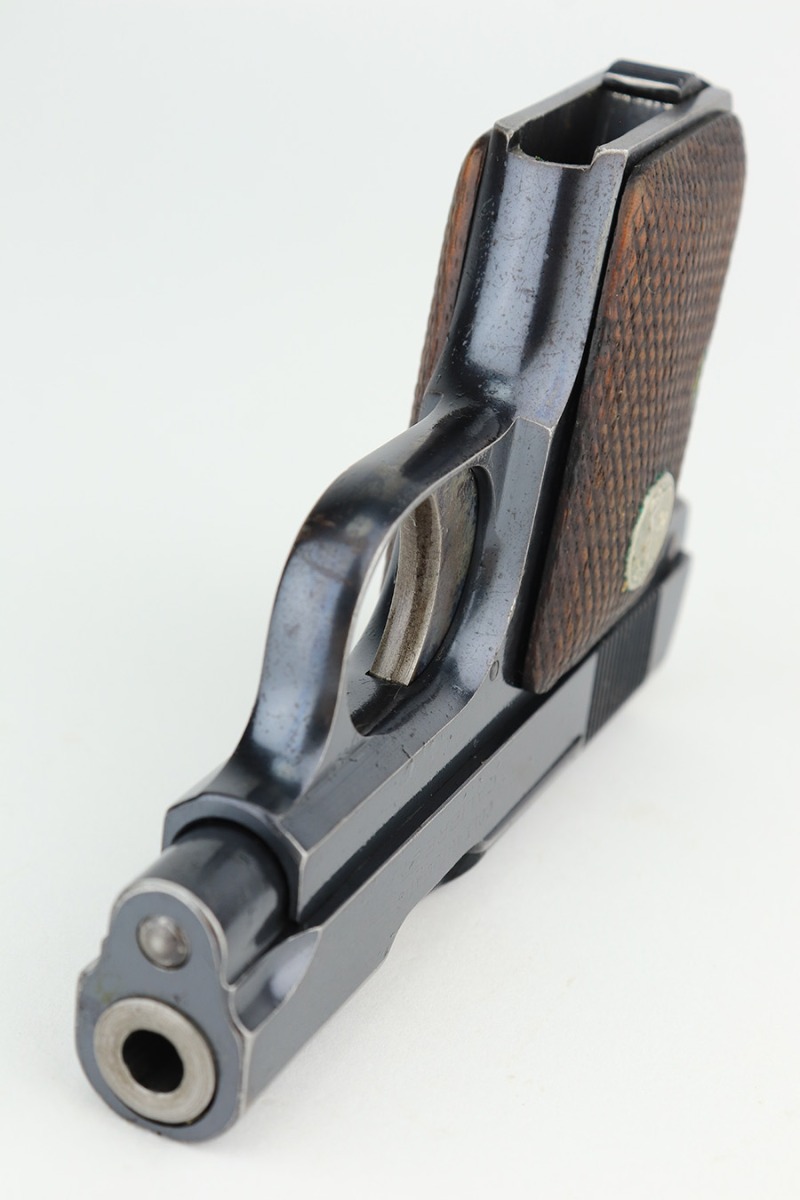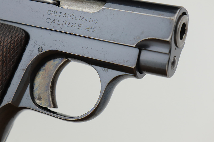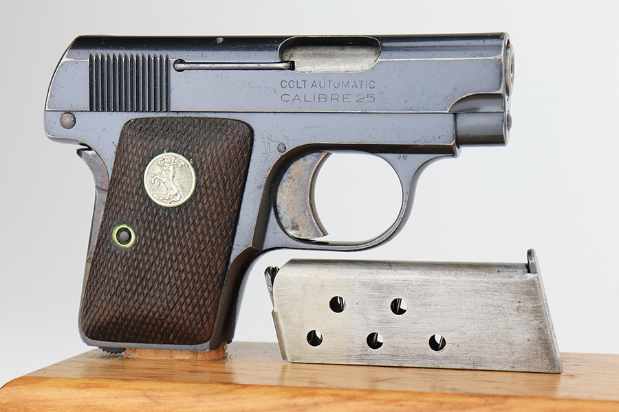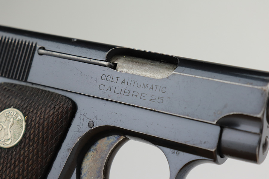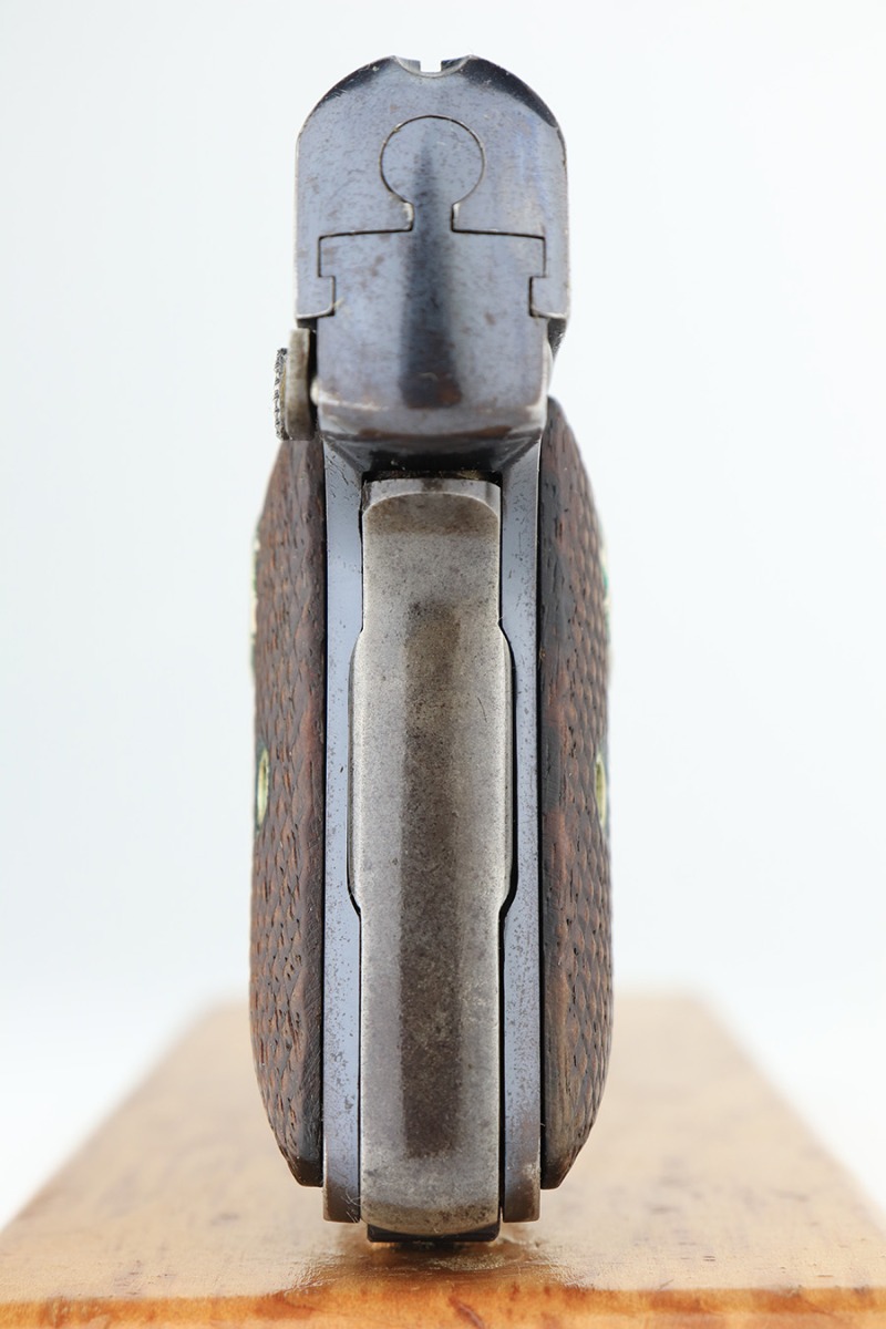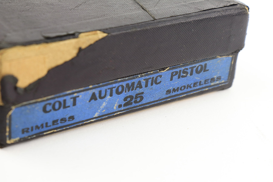 2/14/23 – This is a Colt 1908 Vest Pocket in its original box. The bluing is generally in good condition but the case hardening has worn off the grip safety. There is also high edge wear and oxidation on the sides of the frame and slide. Minty bore. Very nice wood grips with minor smoothing. Comes with the Colt box which is hand numbered and matching to the pistol on the bottom.