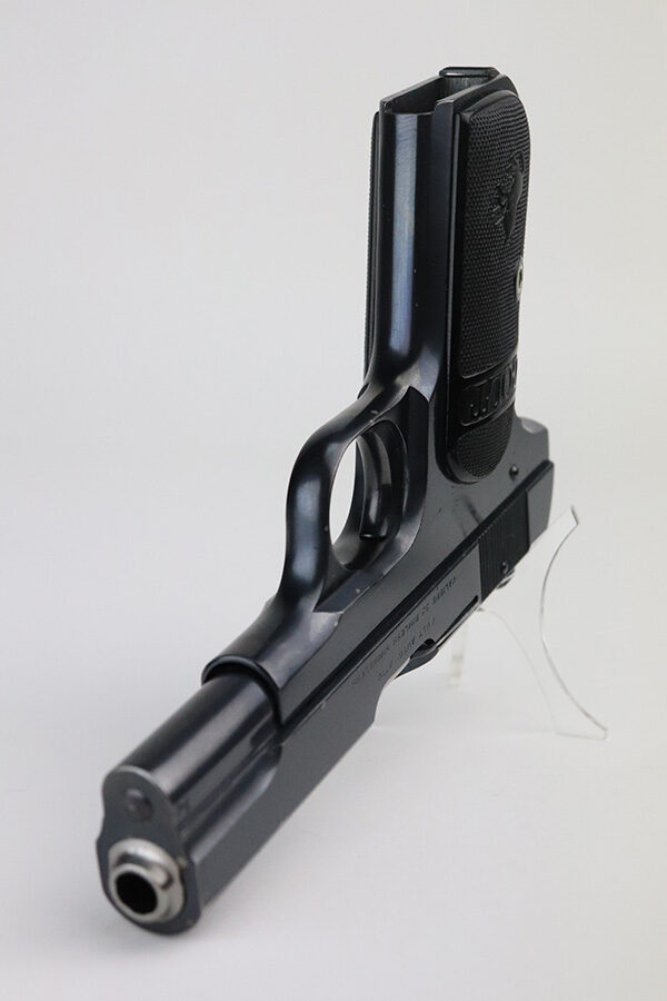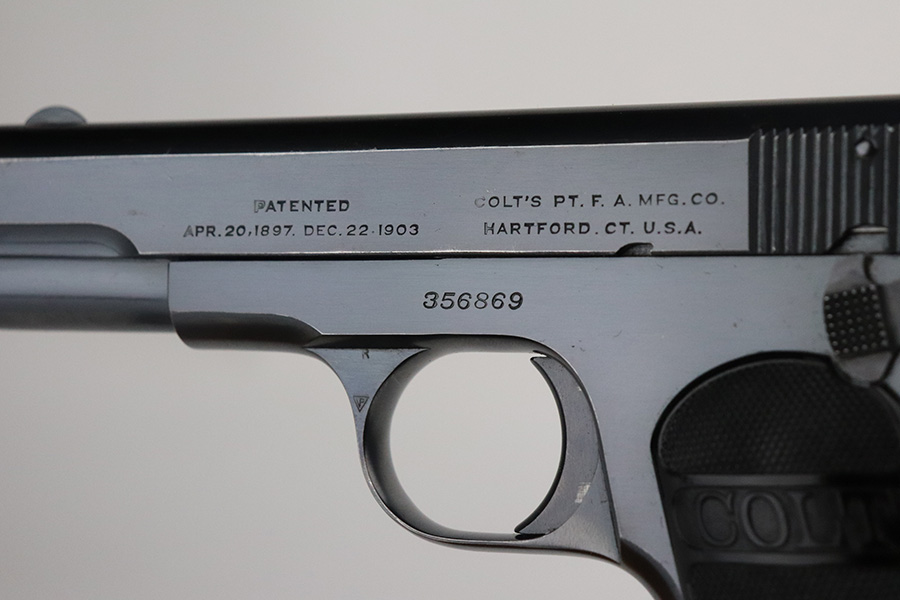 7/27/21 – This is a gorgeous example of a boxed Colt M1903 Pocket Hammerless manufactured in 1920. It is all correct and comes with an original matching box hand-numbered to the gun and an original owners manual. The gun has retained a little more than 98% of its original finish. There are just hints of wear near the high edges of the slide, a few very small handling marks on the front strap, some very light scratches on the left side of the slide and a few small dots of discoloration on the right side of the slide. Comes with excellent black bakelite grips and one proper magazine. Excellent bore – shiny with strong rifling.