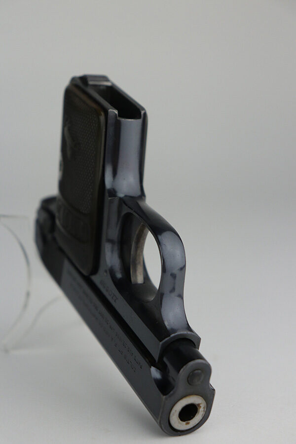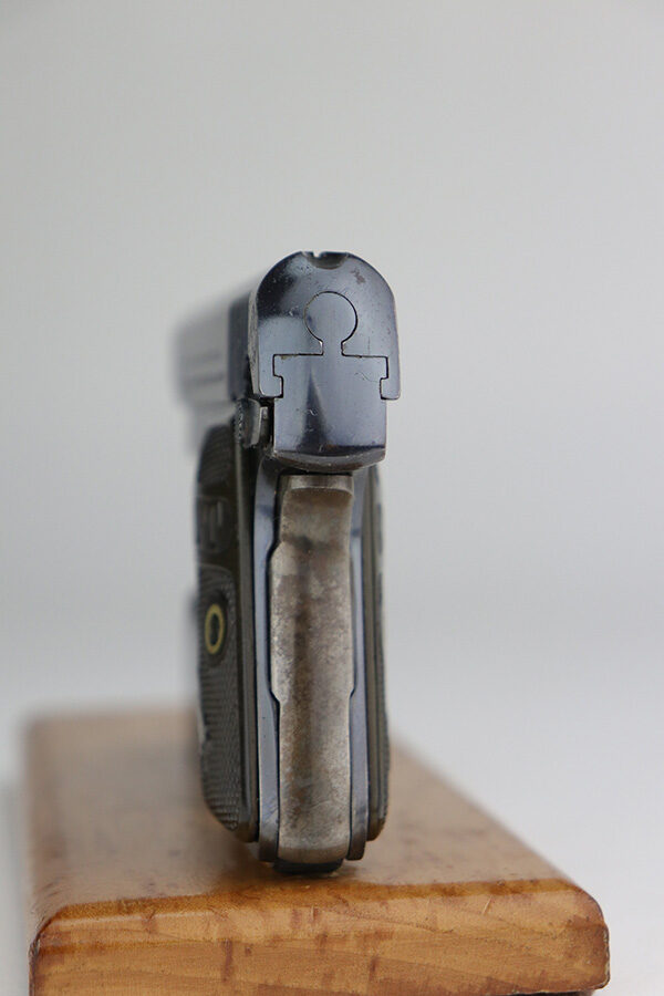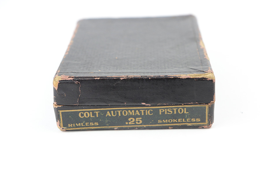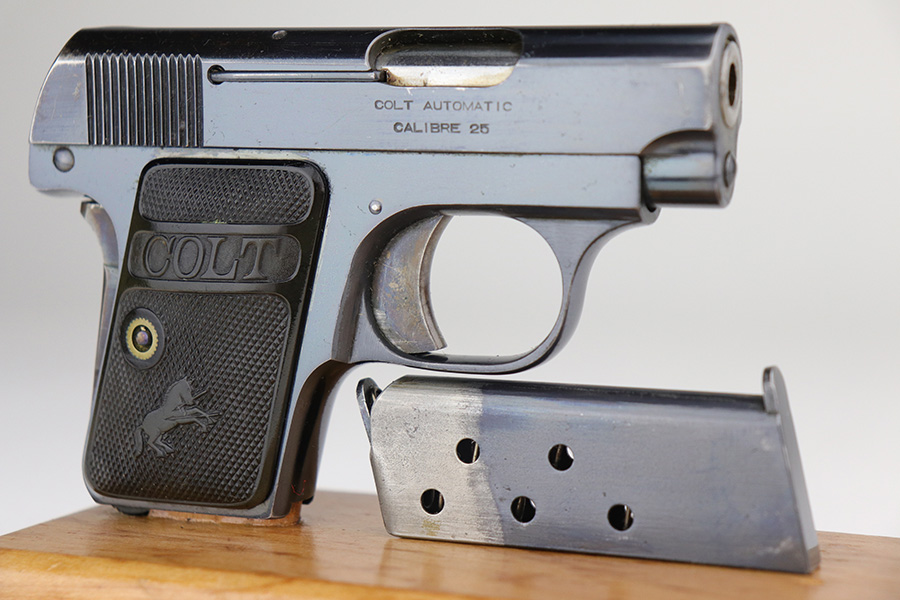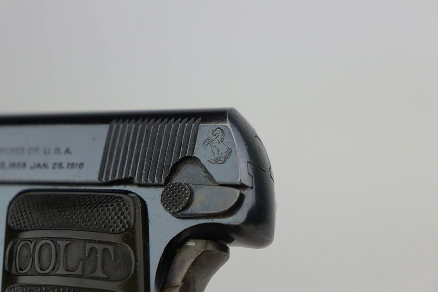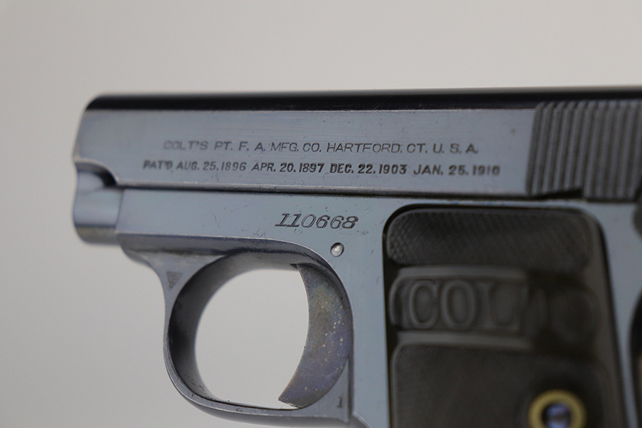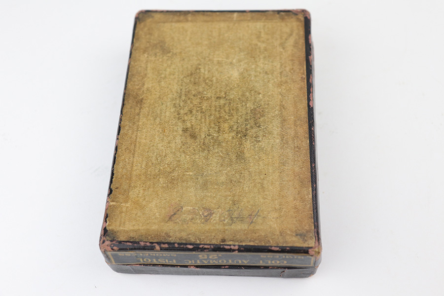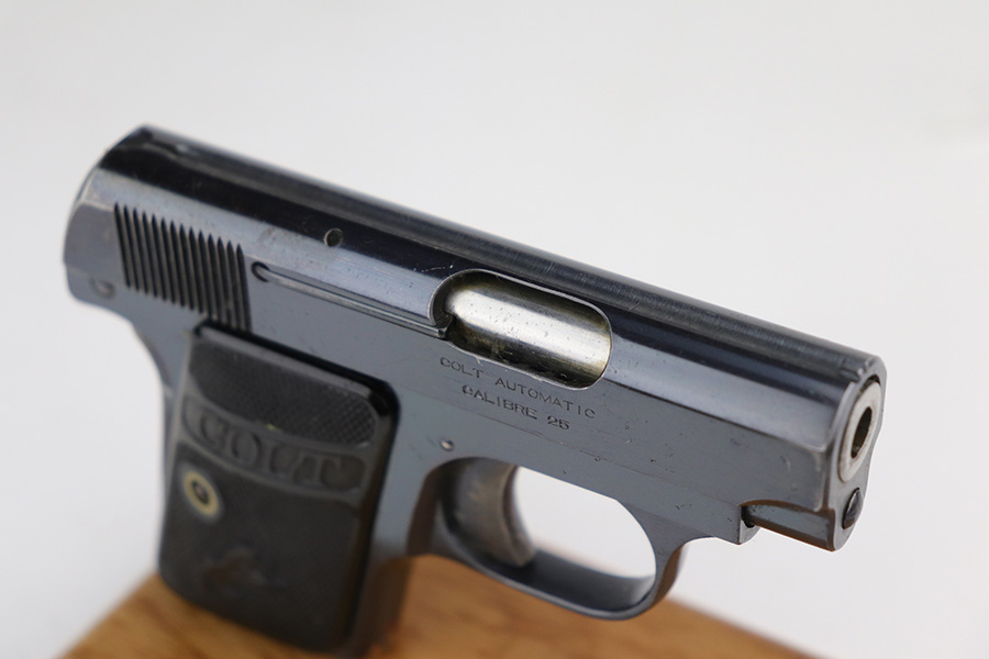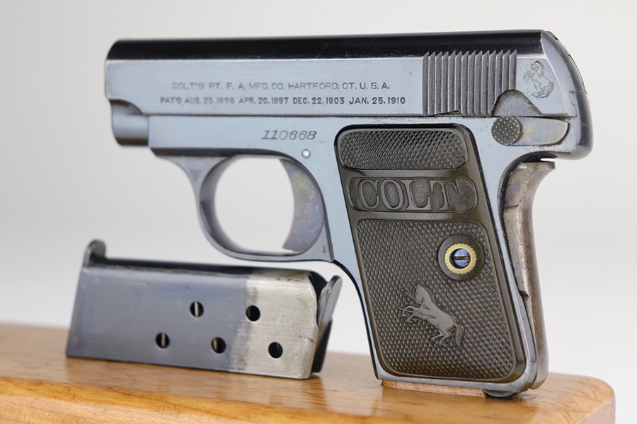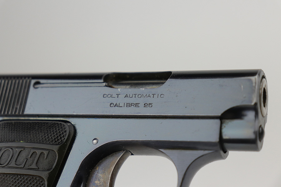 10/21/21 – This is an excellent example of a Colt Model 1908 Vest Pocket pistol, chambered in .25 ACP. Manufactured in 1914. It is all matching and has the proper Rampant Colt logo at the back left of the slide. It comes with an original box that is hand-numbered to match the gun but very faint and hard to see. The gun has retained about 97% of its original beautiful deep Colt bluing. Most of the case-hardening is worn on the grip safety but still mostly intact on the trigger. There is very minor wear around the high edges of the slide and around the muzzle. A few very light surface scratches on the top of the slide and a few small dots of freckling near the tang. Comes with minty hard rubber Colt grips and a proper two-tone magazine. The bore is excellent with strong rifling.