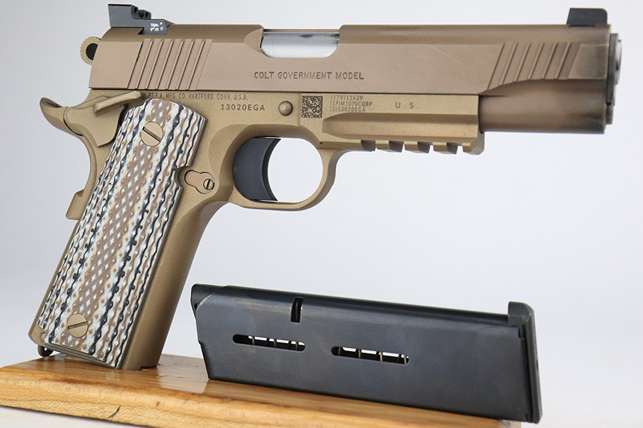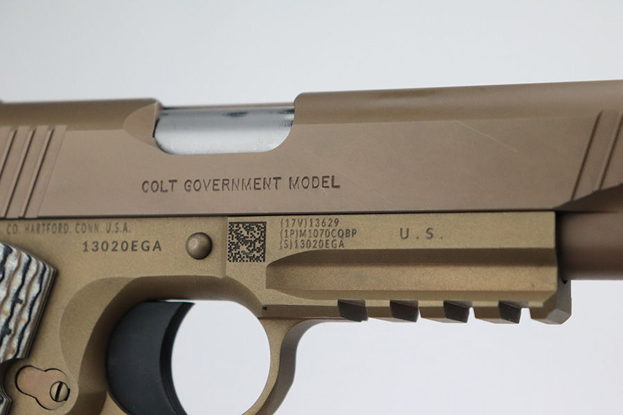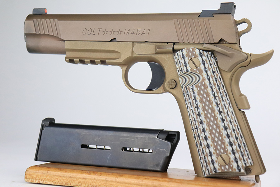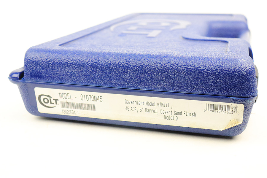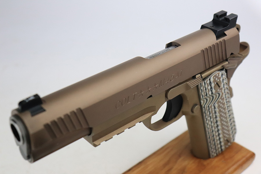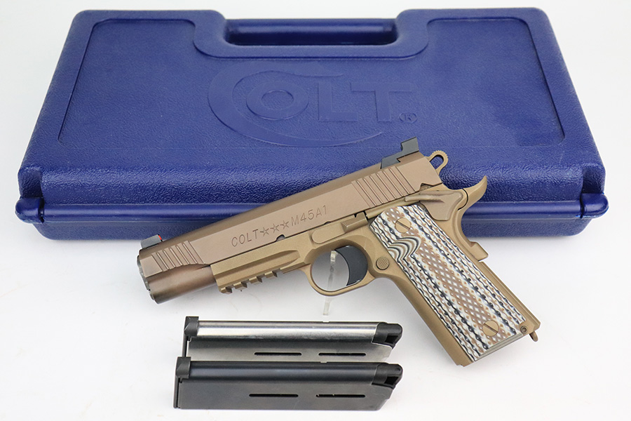 6/29/22 – This is a very nice Colt M45A1 in its original, matching box. The close quarters battle pistol features a National Match barrel, Desert Sand finish, G10 grips, Trijicon front and rear sight and ambi-thumb safety. This one is in excellent but there is powder residue/discoloration all around the muzzle. Minty bore and grips. Comes with a total of two magazines and the factory matching case.
