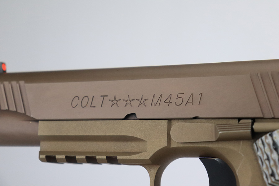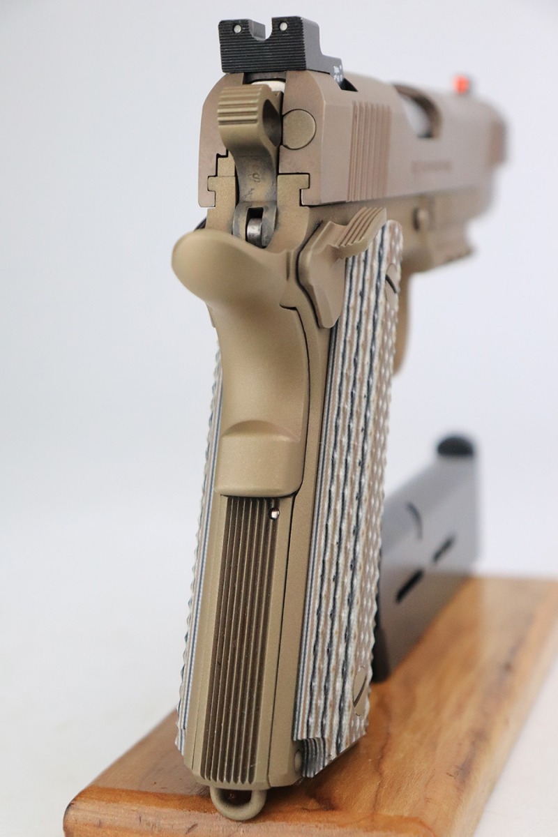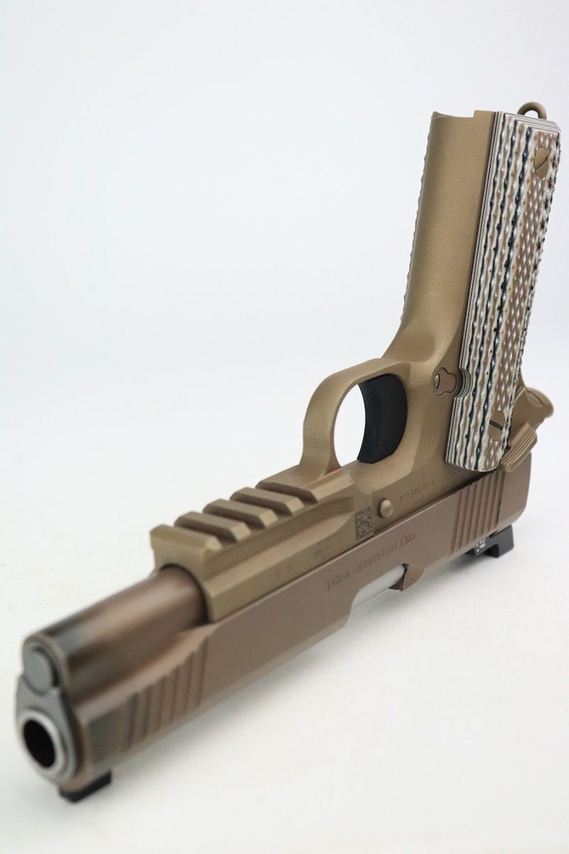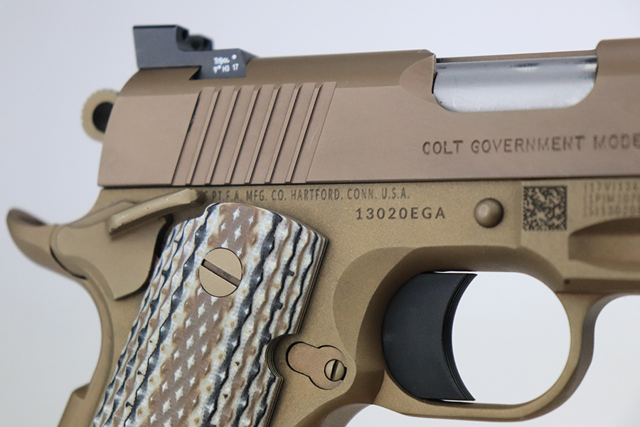 6/29/22 – This is a very nice Colt M45A1 in its original, matching box. The close quarters battle pistol features a National Match barrel, Desert Sand finish, G10 grips, Trijicon front and rear sight and ambi-thumb safety. This one is in excellent but there is powder residue/discoloration all around the muzzle. Minty bore and grips. Comes with a total of two magazines and the factory matching case.