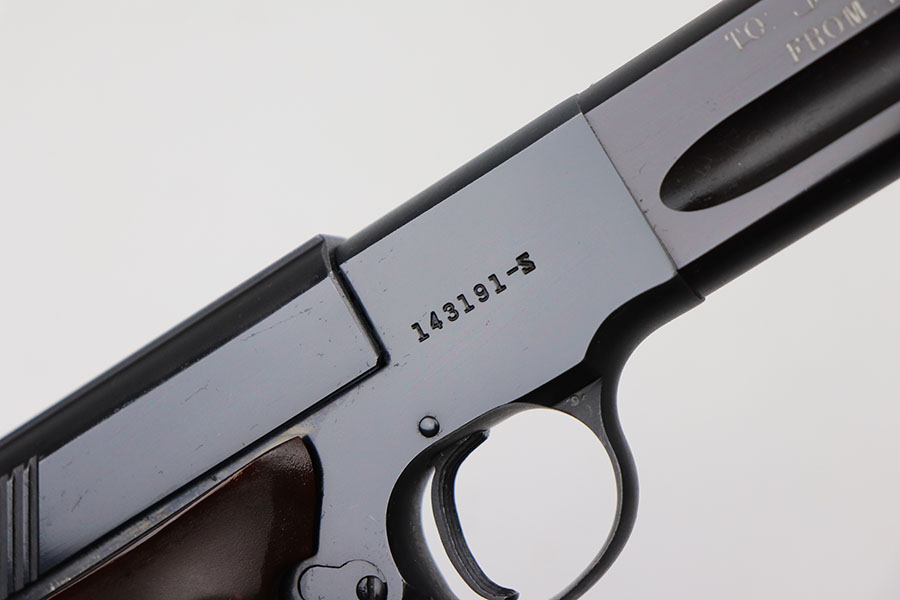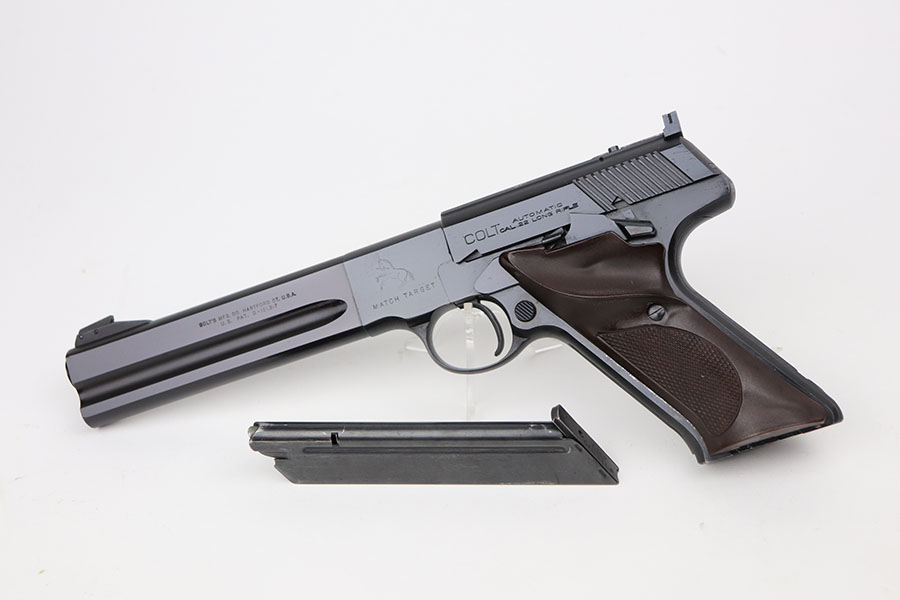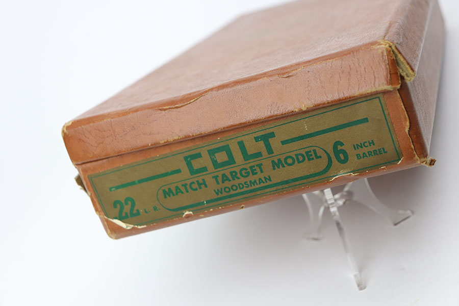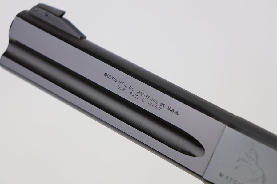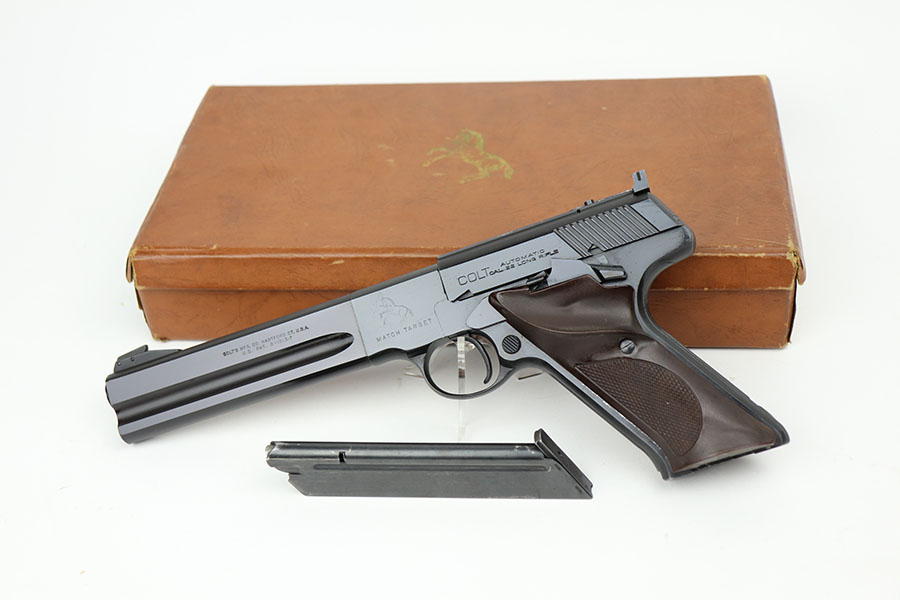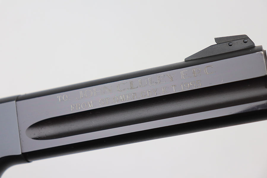 4/7/21 – This is a Colt Match Target, second series, in the original box. It was made in 1955 and is in near-mint condition with just a tiny spot of freckling on the left side of the frame. Barrel is 6in with a mint bore. Push button magazine release with correct “tombstone” button magazine. Last production year of the second series. Grips exhibit minor shrinkage. Right side of the barrel has an inscription indicating it was presented to a fraternal order leader in 1955.
