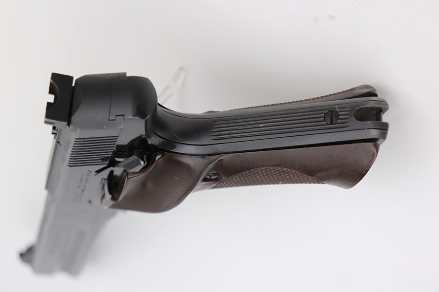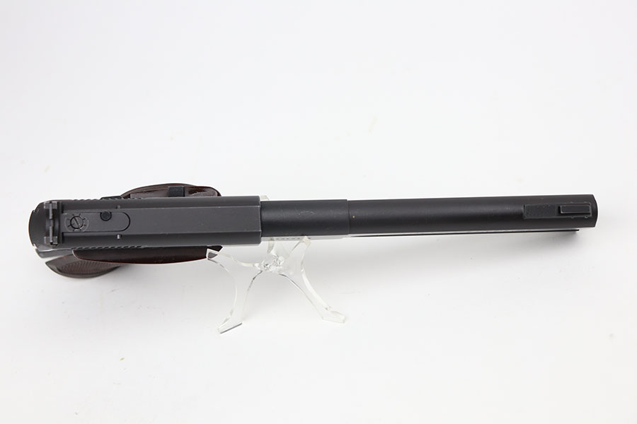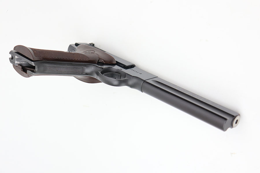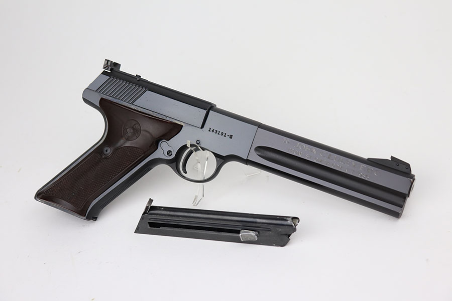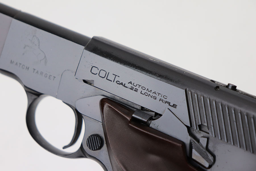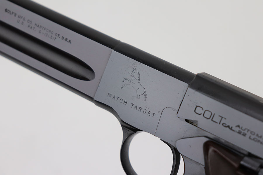 4/7/21 – This is a Colt Match Target, second series, in the original box. It was made in 1955 and is in near-mint condition with just a tiny spot of freckling on the left side of the frame. Barrel is 6in with a mint bore. Push button magazine release with correct “tombstone” button magazine. Last production year of the second series. Grips exhibit minor shrinkage. Right side of the barrel has an inscription indicating it was presented to a fraternal order leader in 1955.