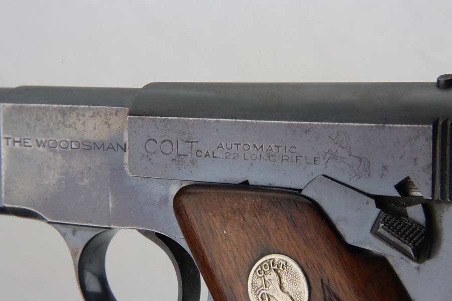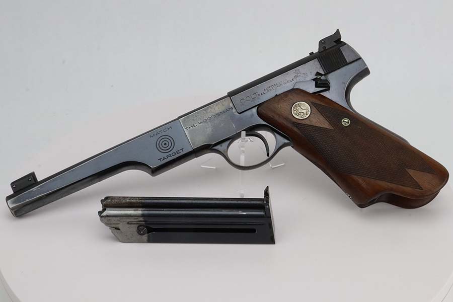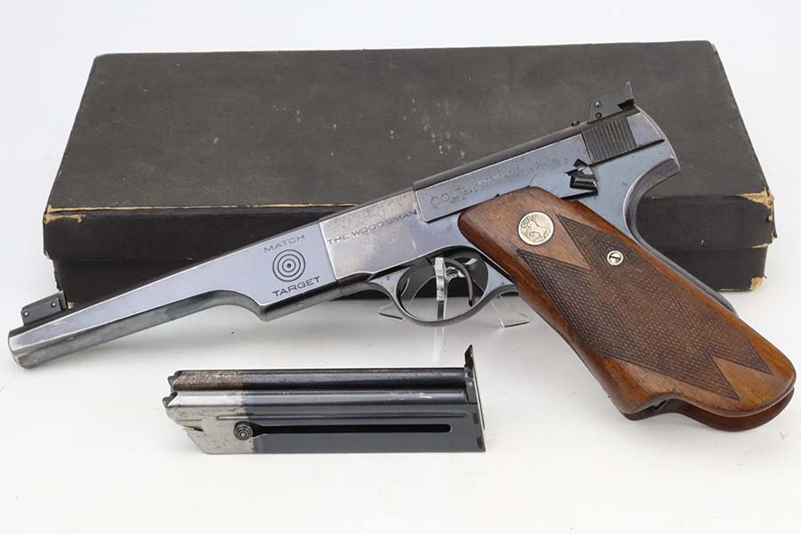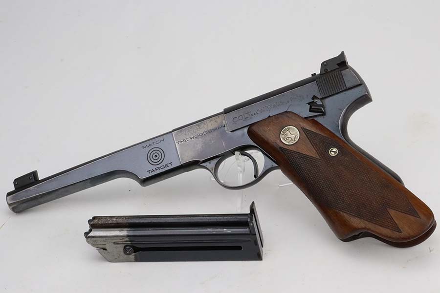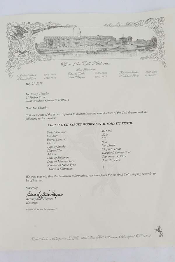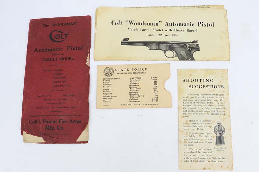 3/1/24 – This is a nice example of a Colt Match Target Woodsman from 1939. According to the included Colt Factory Letter, it was delivered to “Clapp & Treat” in Hartford, CT on June 23, 1939. It comes with its original matching-numbered box, owners manual, two magazines, and punch tool. The gun itself has retained roughly 85% of its original high polish finish. There is wear around the muzzle, general high edge wear, and areas of thinning on both sides of the frame. Very light spotty oxidation on most of the frame as well. Fitted with a very nice period-correct one-piece wood grip. Mint bore.