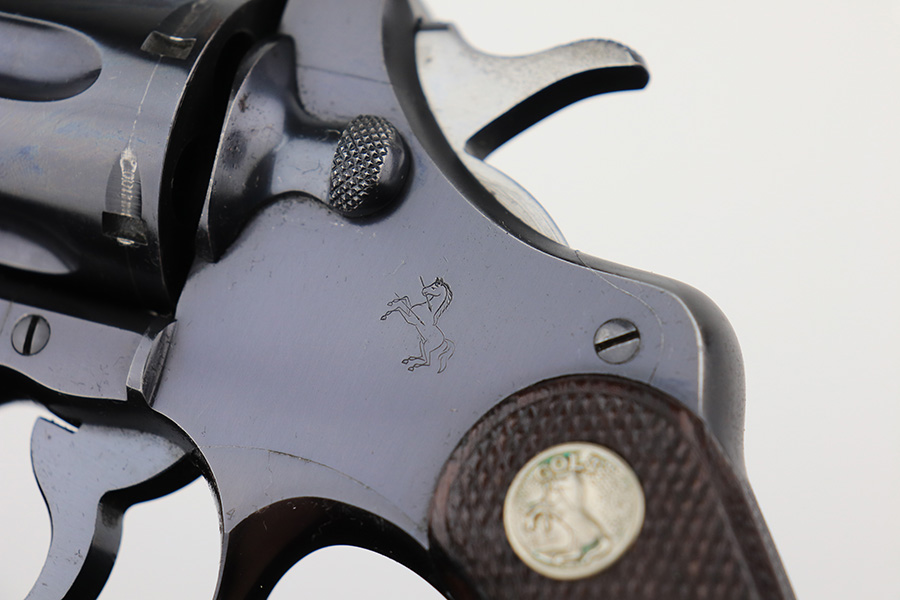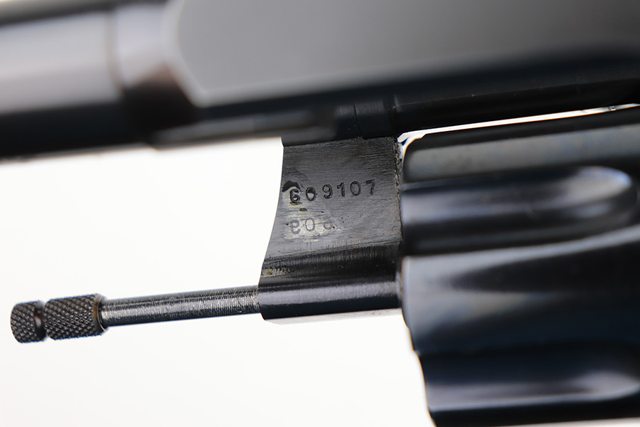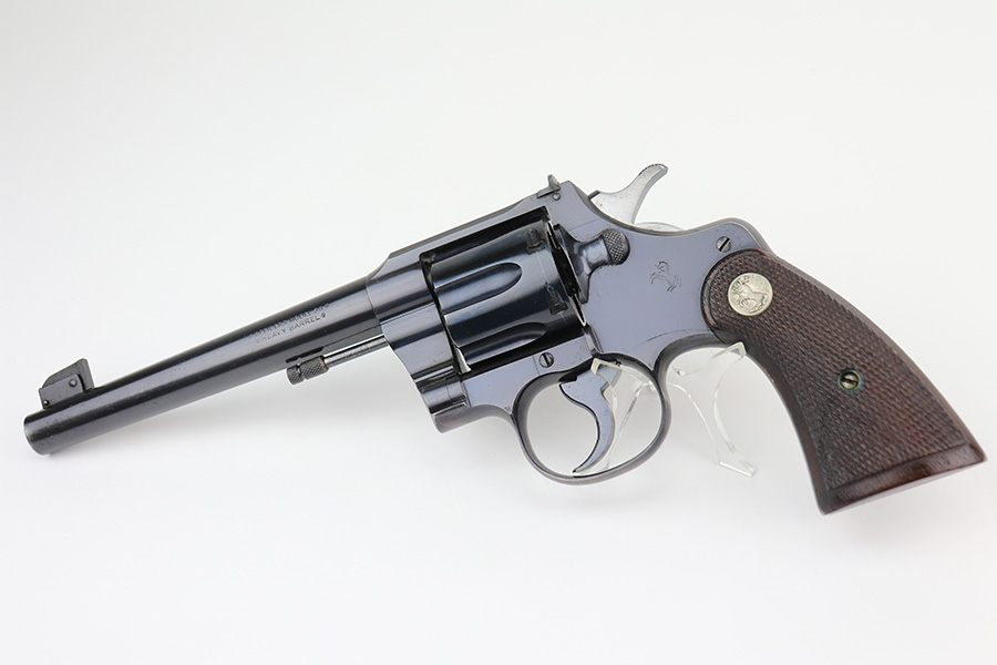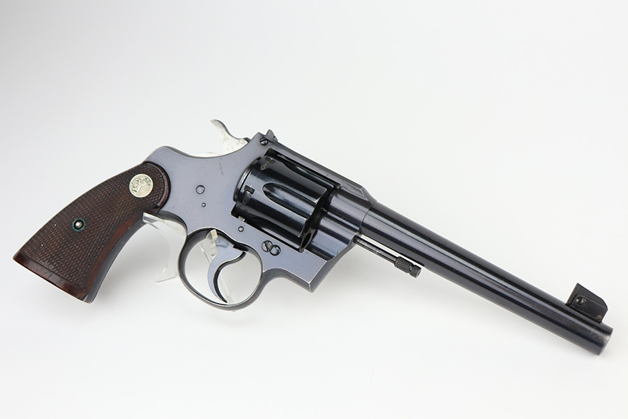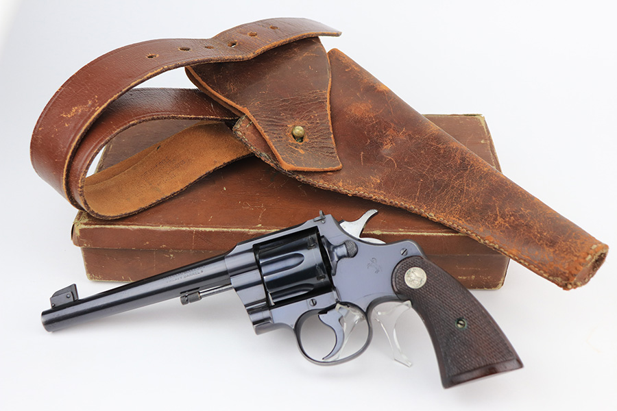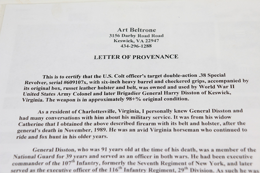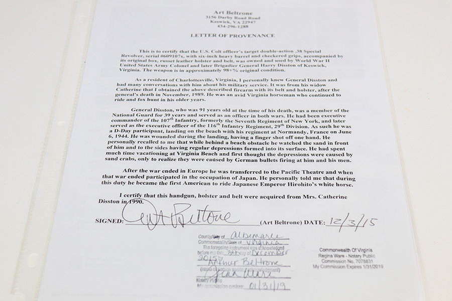 2/23/22 – This is an interest Colt Officers Model revolver 1937 in its original box, and comes with letter of provenance stating it was bought from the wife of WWII Army Colonel and later Brigadier General Harry Disston. Disston was the executive commander of the 107th Infantry, and later served as the executive officer of the 116th Infantry, 29th Division. He was a D-Day participant, and wounded during the landing. He later was transferred to the Pacific Theatre and later stated that he was the first American to ride Japanese Emperor Hirohito’s white horse. The gun itself is all original with about 97% of the blue remaining. Minor muzzle and cylinder wear, and a little oxidation on the right side of the frame. Presumably, this was a gun that Disston bought privately but it still comes with the original Colt box, as well as the bolt and holster that Disston carried it in. Minty bore and good mechanics.