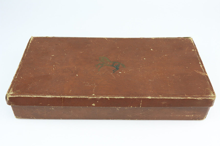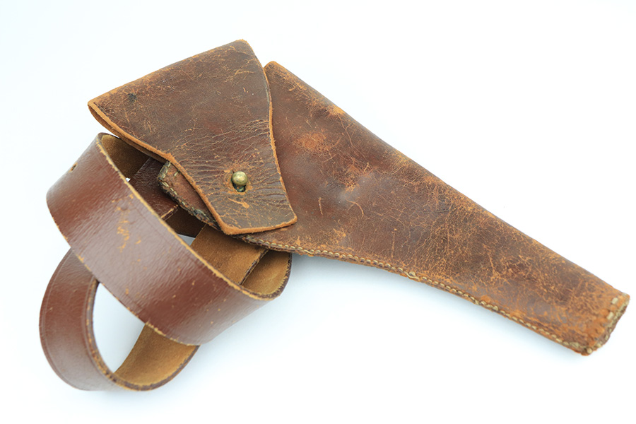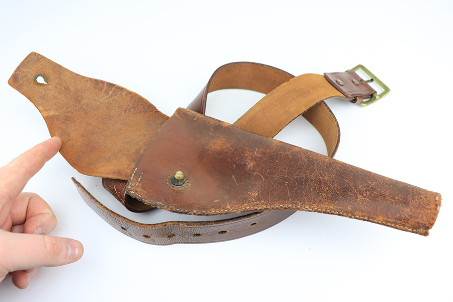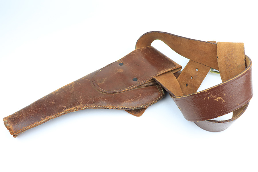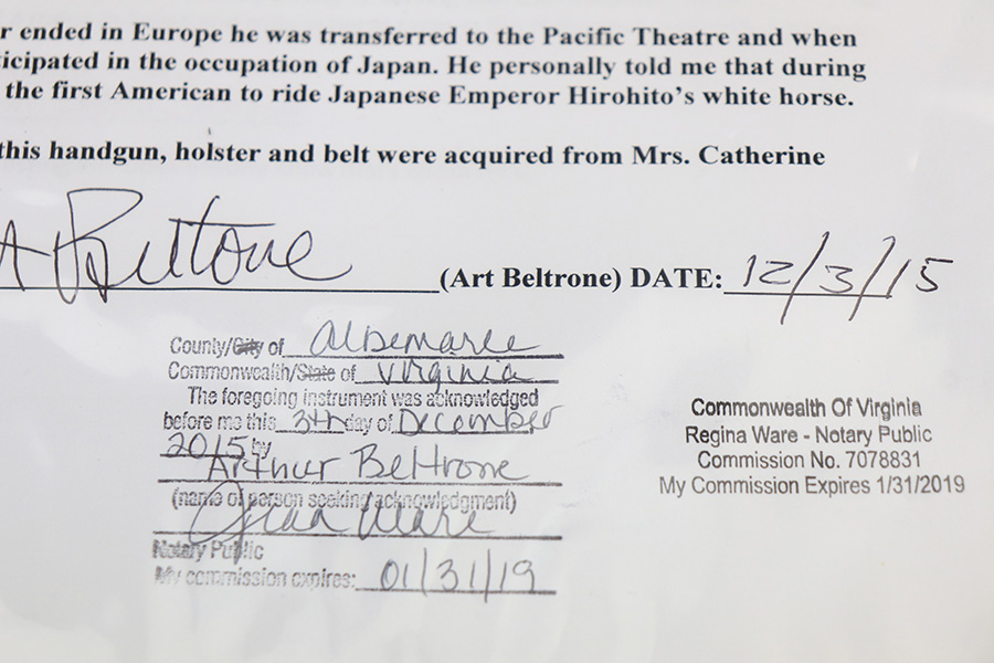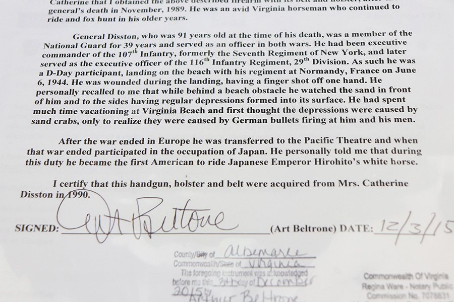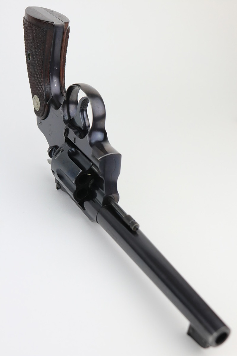 2/23/22 – This is an interest Colt Officers Model revolver 1937 in its original box, and comes with letter of provenance stating it was bought from the wife of WWII Army Colonel and later Brigadier General Harry Disston. Disston was the executive commander of the 107th Infantry, and later served as the executive officer of the 116th Infantry, 29th Division. He was a D-Day participant, and wounded during the landing. He later was transferred to the Pacific Theatre and later stated that he was the first American to ride Japanese Emperor Hirohito’s white horse. The gun itself is all original with about 97% of the blue remaining. Minor muzzle and cylinder wear, and a little oxidation on the right side of the frame. Presumably, this was a gun that Disston bought privately but it still comes with the original Colt box, as well as the bolt and holster that Disston carried it in. Minty bore and good mechanics.